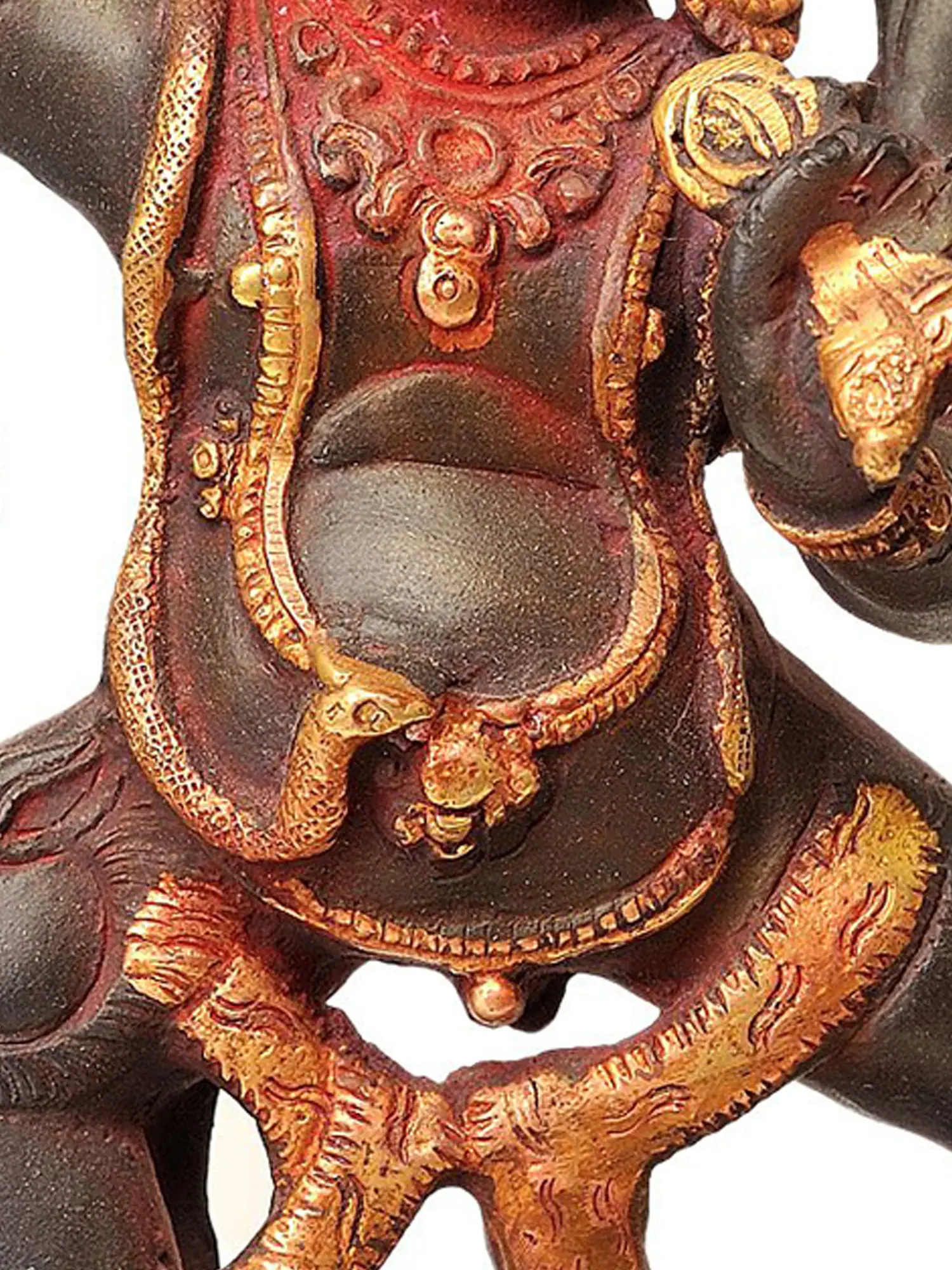 The dynamic pose of this statue is crucial to understanding Vajrapani's energetic nature. He stands triumphantly, often with one leg raised or crushing underfoot various demons or obstacles. This posture represents his victory over suffering and his readiness to descend into the lower realms to liberate sentient beings. His fearsome expression, with bared teeth and bulging eyes, is not one of anger, but of intense compassion and a burning desire to protect practitioners from spiritual and worldly dangers. The elaborate crown and ornaments adorning him signify his divine status and his role as a protector of the Dharma. The multi-armed form often associated with Vajrapani allows him to perform numerous acts of protection and assistance simultaneously, reflecting the boundless nature of his power. This particular representation, with its rich patina and delicate gold accents, brings to life the potent symbolism of this revered deity. ––––––––––