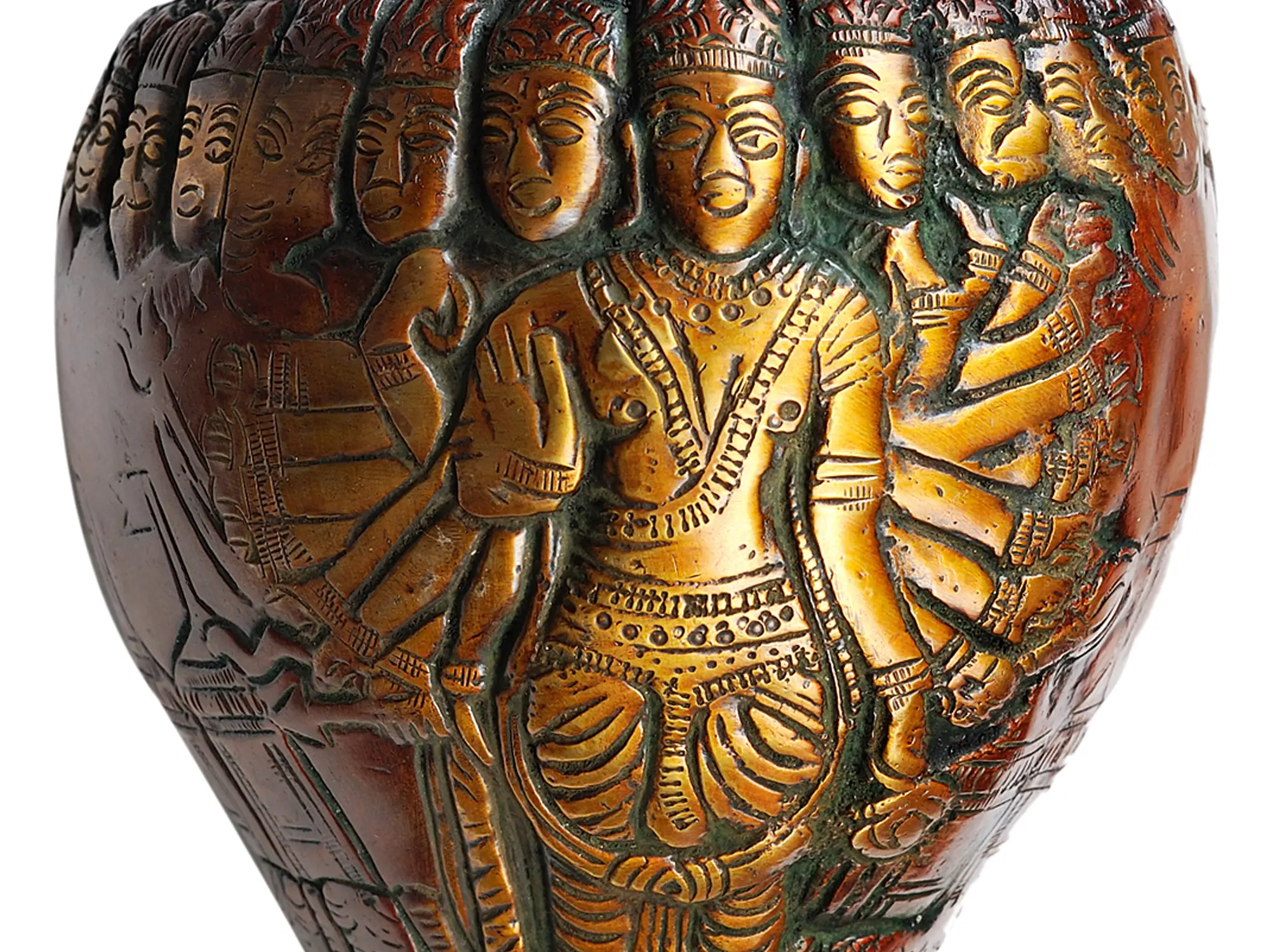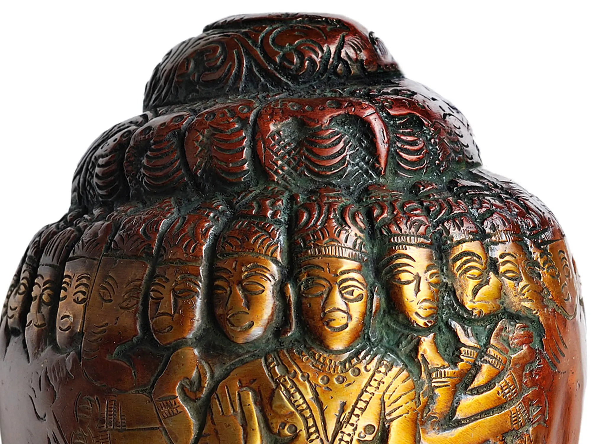 When Lord Krishna took the Vishwarupa, Arjuna couldn't see the magnificent image through his normal eyes; hence, Lord Krishna had to provide him the Divya Drishti or divine view to benefit from his form. The Viswarupa of Lord Vishnu is a form that is always mentioned to be incomparable. It was so magnificent that Arjun could see the entire world gathered in one place, in the body of the God of Gods. This Vishwarupa engraving brass conch is a tribute to the splendid form of Lord Vishnu. Here,the magnificence of the form is mixed with the sacred sound of a conch. The sound that is the start and end of Humanity. It is a masterpiece ritual object that easily qualifies as an exquisite piece of art.