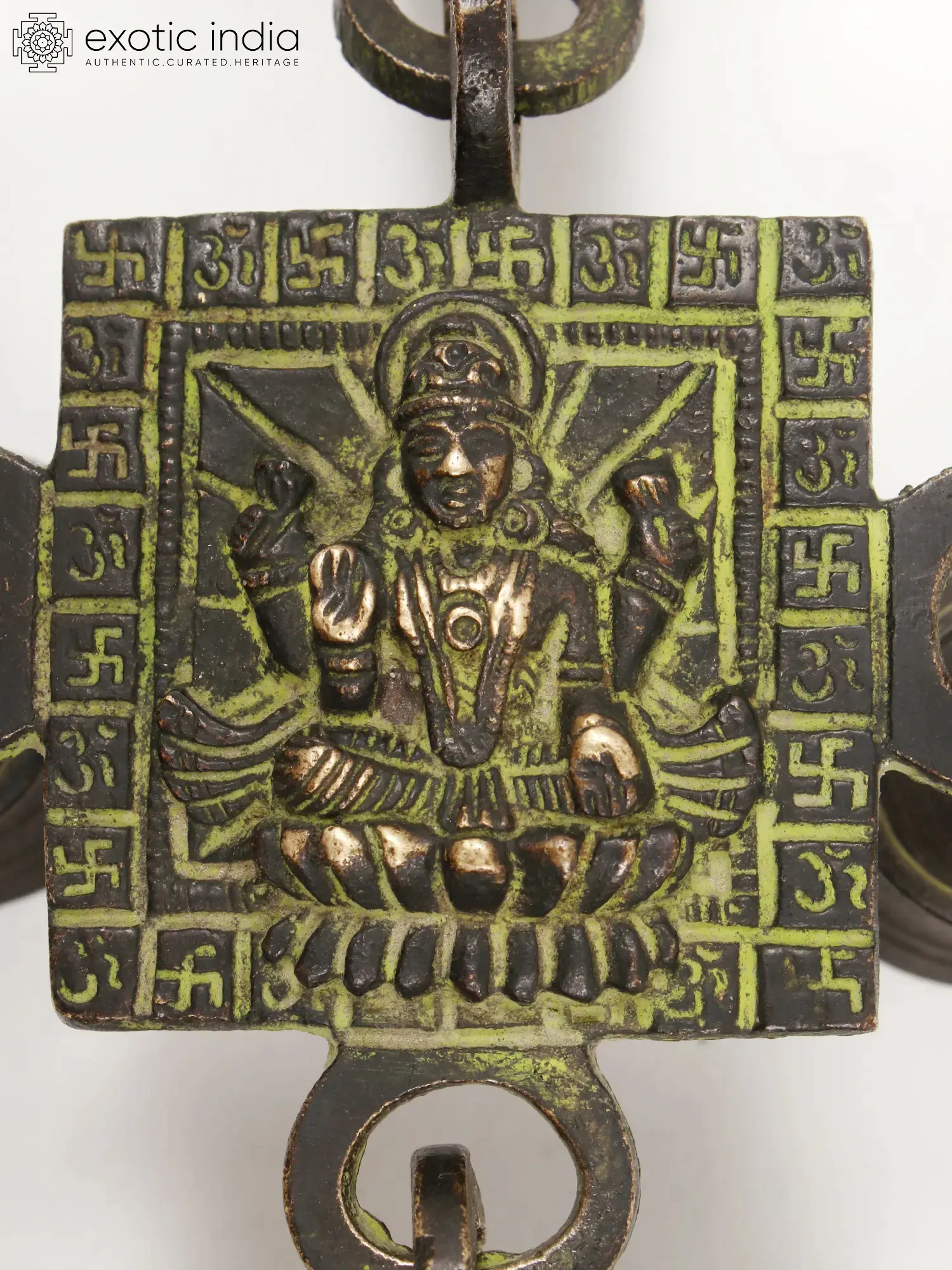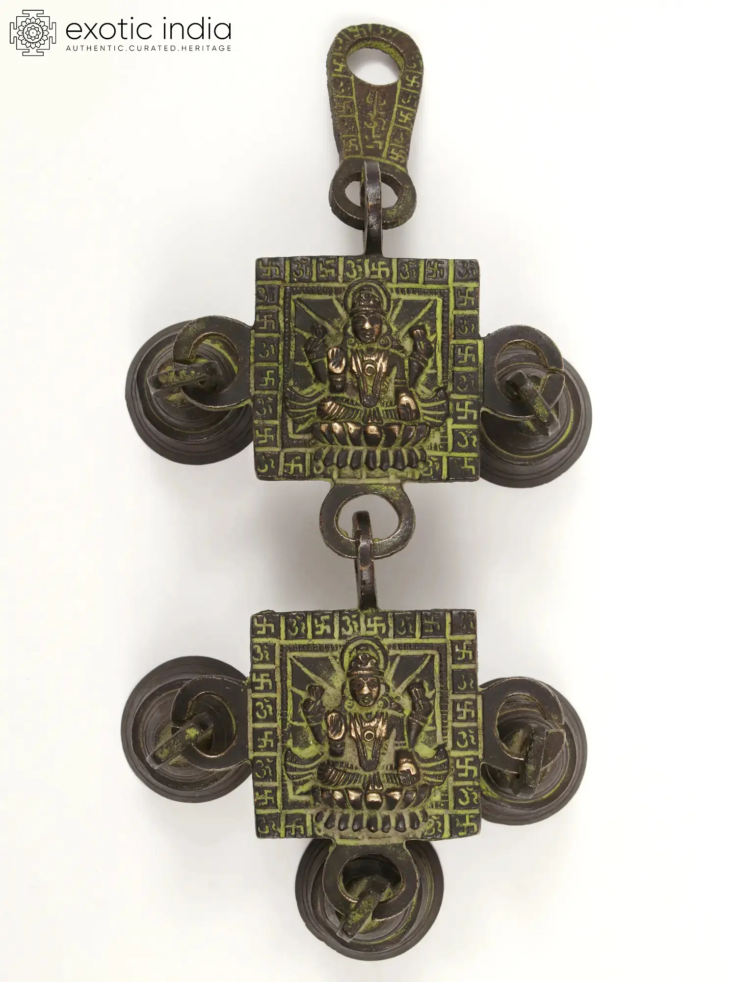 This auspicious brass wall hanging showcases Goddess Lakshmi, the beloved deity of wealth and good fortune. The gentle tinkling of the bells as they sway adds a melodious touch to this sacred piece. Lakshmi, often adorned in a magnificent saree, is depicted seated, radiating grace and prosperity. This beautiful wall hanging is a powerful addition to your home, inviting Lakshmi's blessings and creating a harmonious atmosphere filled with shanti (peace) and shubh labh (auspiciousness and gain).