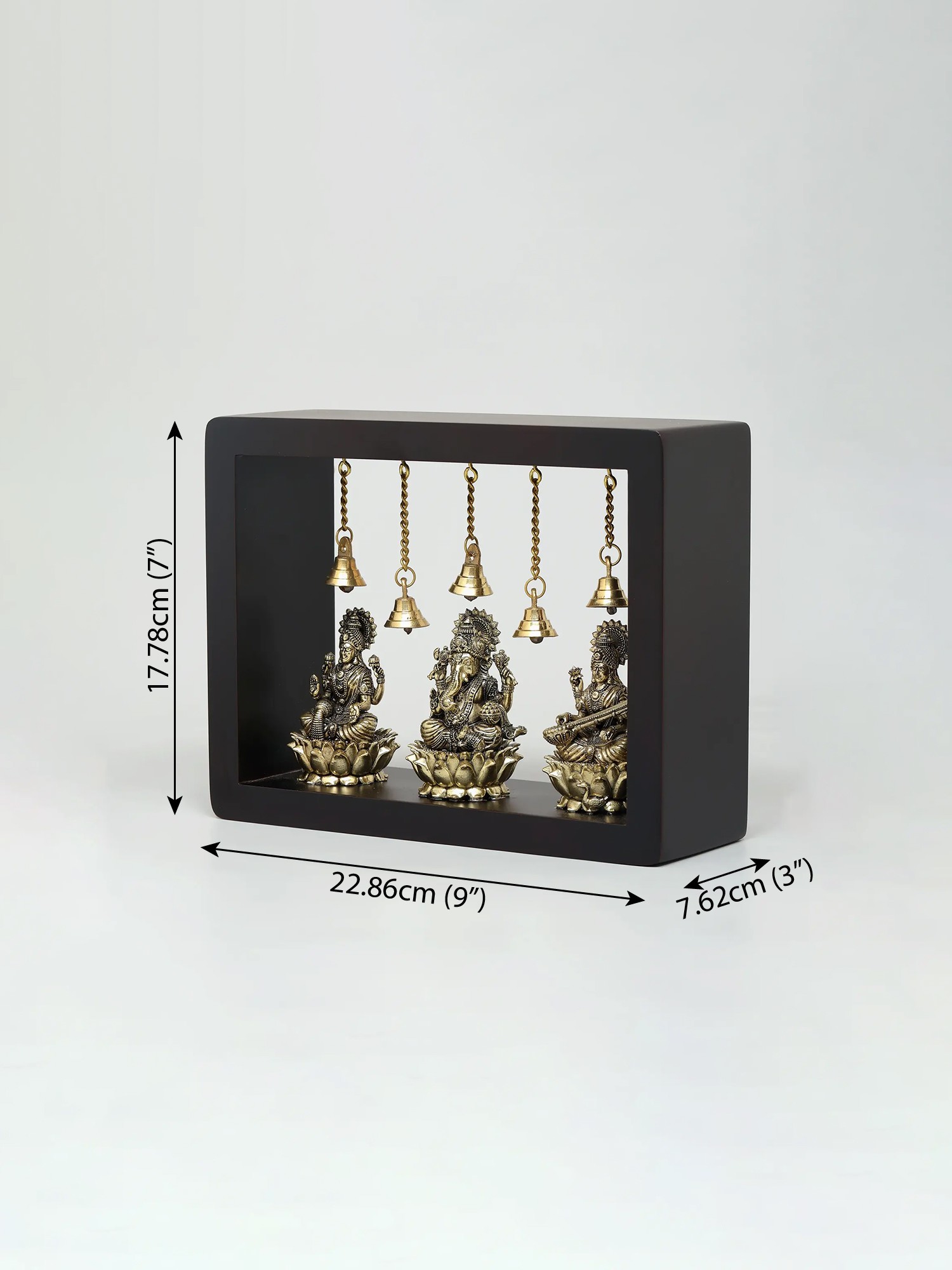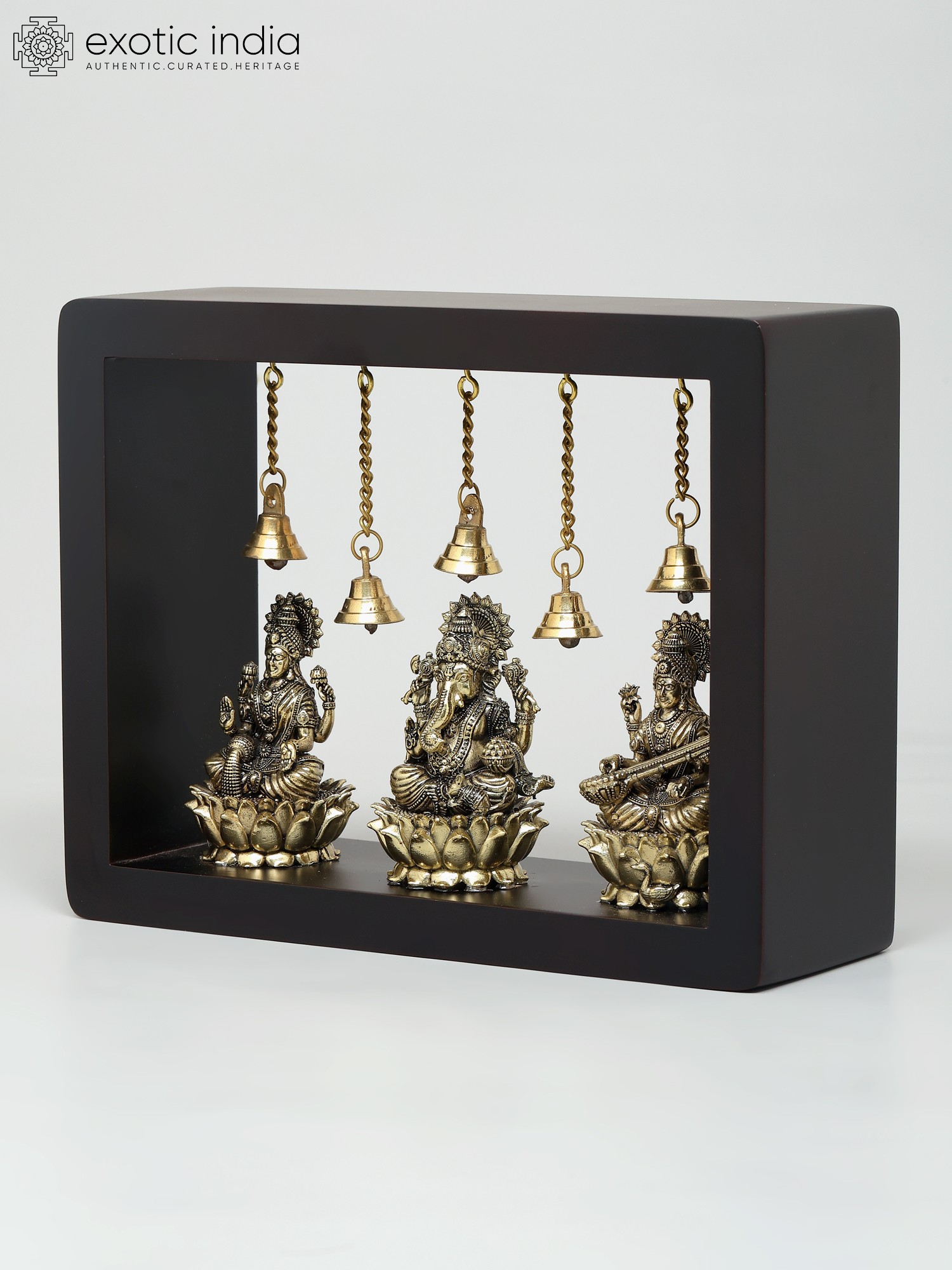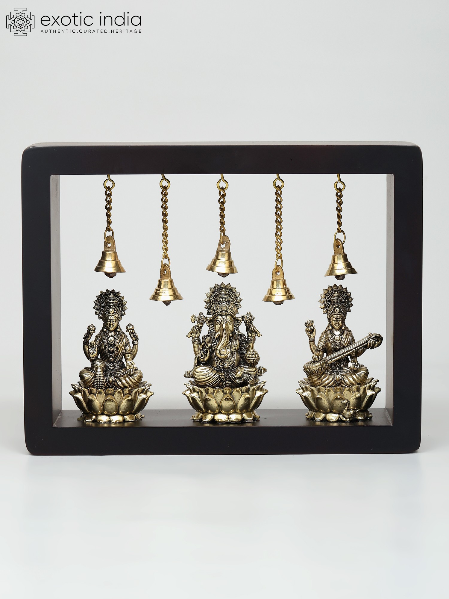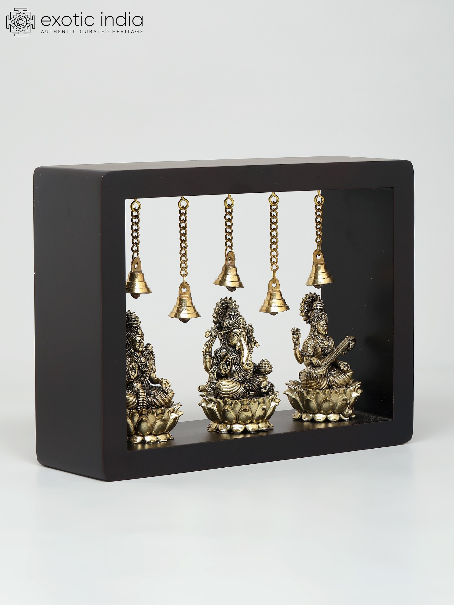 10" Superfine Lakshmi Ganesha Saraswati | Wood Framed Brass Sculptures | Wall Hanging