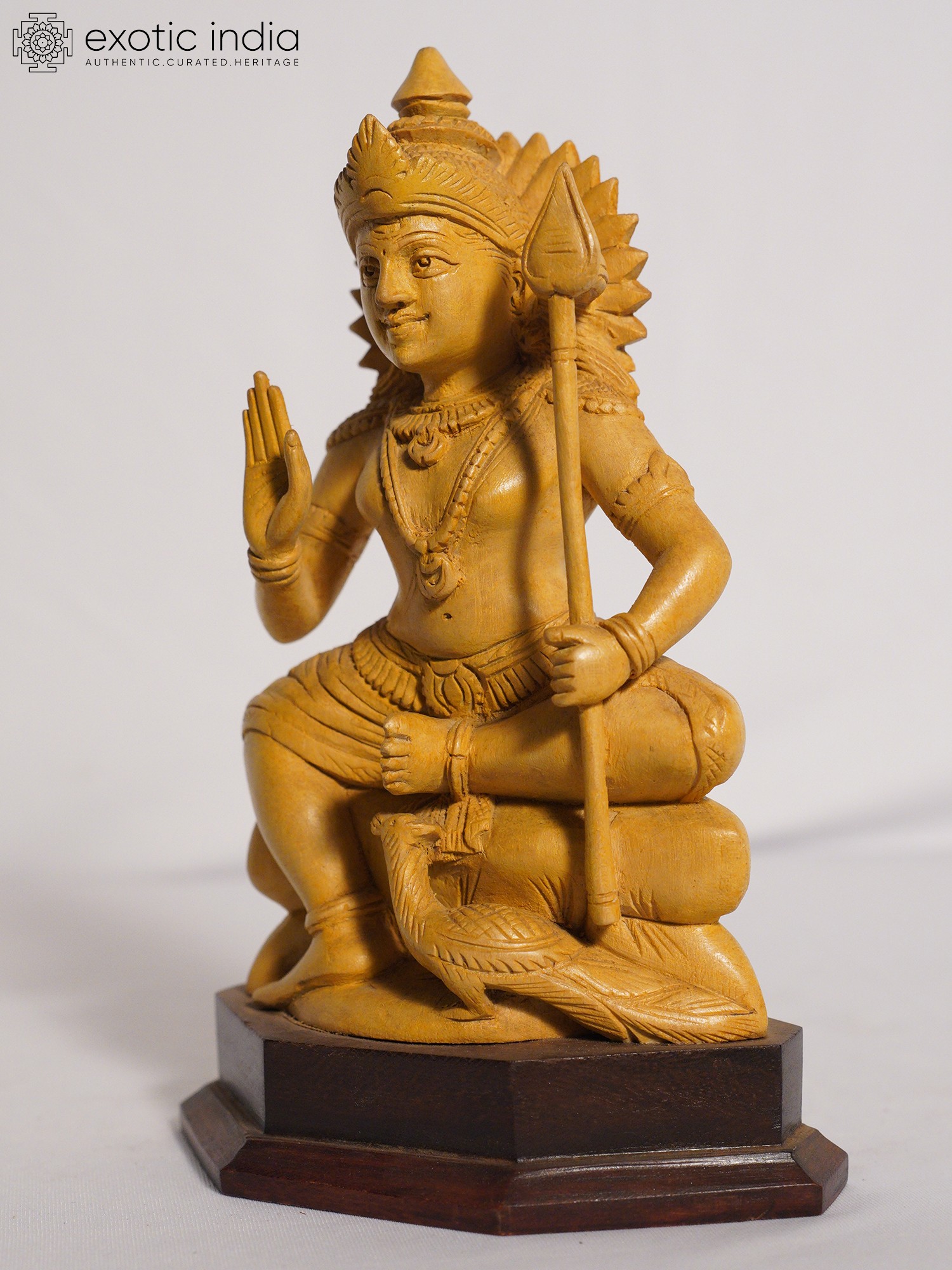 22" Lord Kartikeya Idol on Peacock | Murugan Wooden Statue