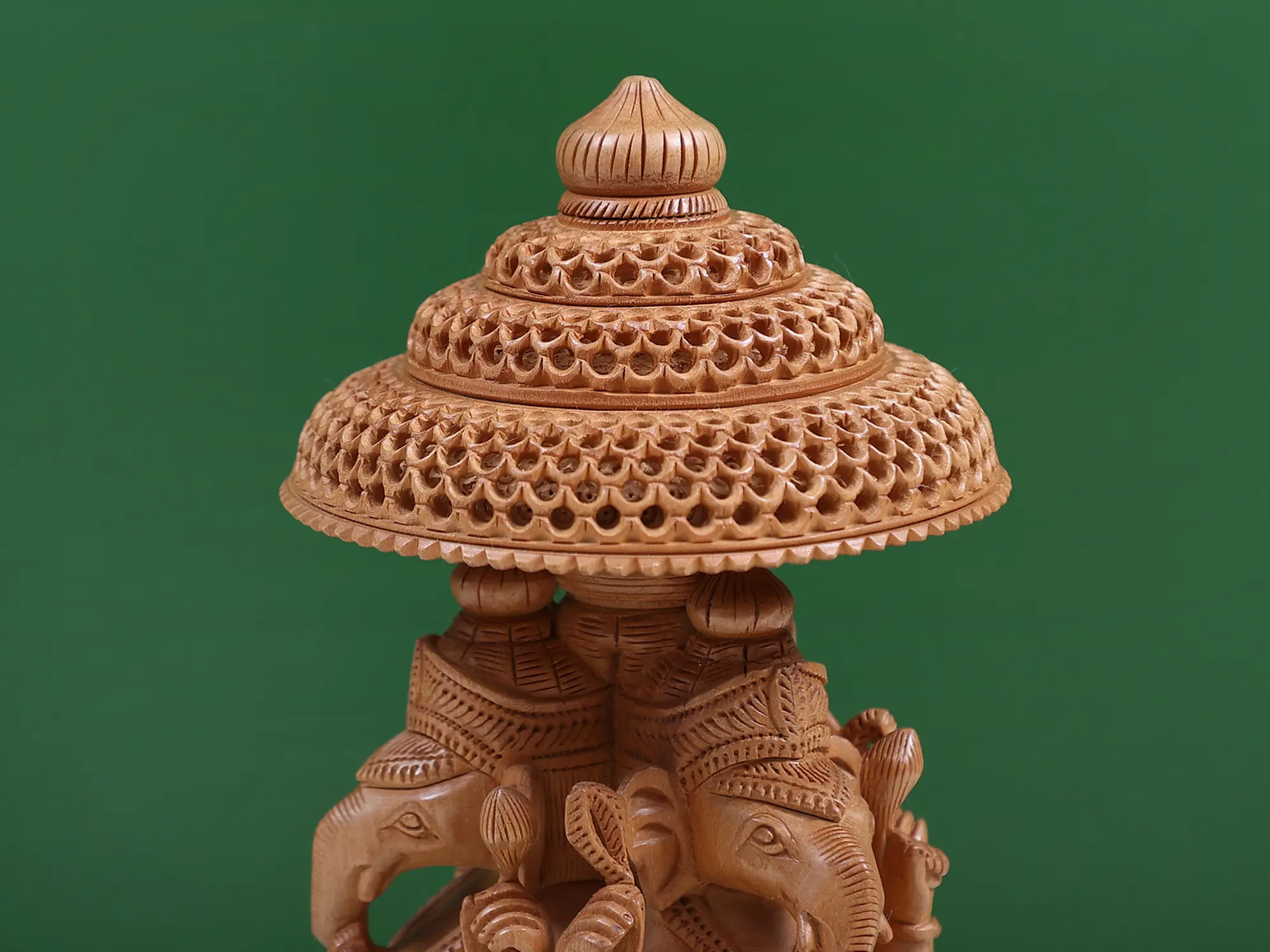 Carved from fine wood, this statue showcases the dedication and skill of the artisan. The warm, natural tones of the wood lend an earthy and grounding quality to the piece. Observe the meticulous detailing on Ganesha's features – the gentle curves of his trunk, the expressive eyes, and the finely rendered ornaments adorning his form. The elaborate tiered canopy above Ganesha is a marvel of latticework, creating an aura of divine grandeur. The base of the statue is equally impressive, with intricate patterns that echo the sacred geometry often found in mandalas, further enhancing its spiritual significance. This carving is more than just a decorative object; it is a testament to traditional craftsmanship and a beautiful conduit for invoking divine blessings.