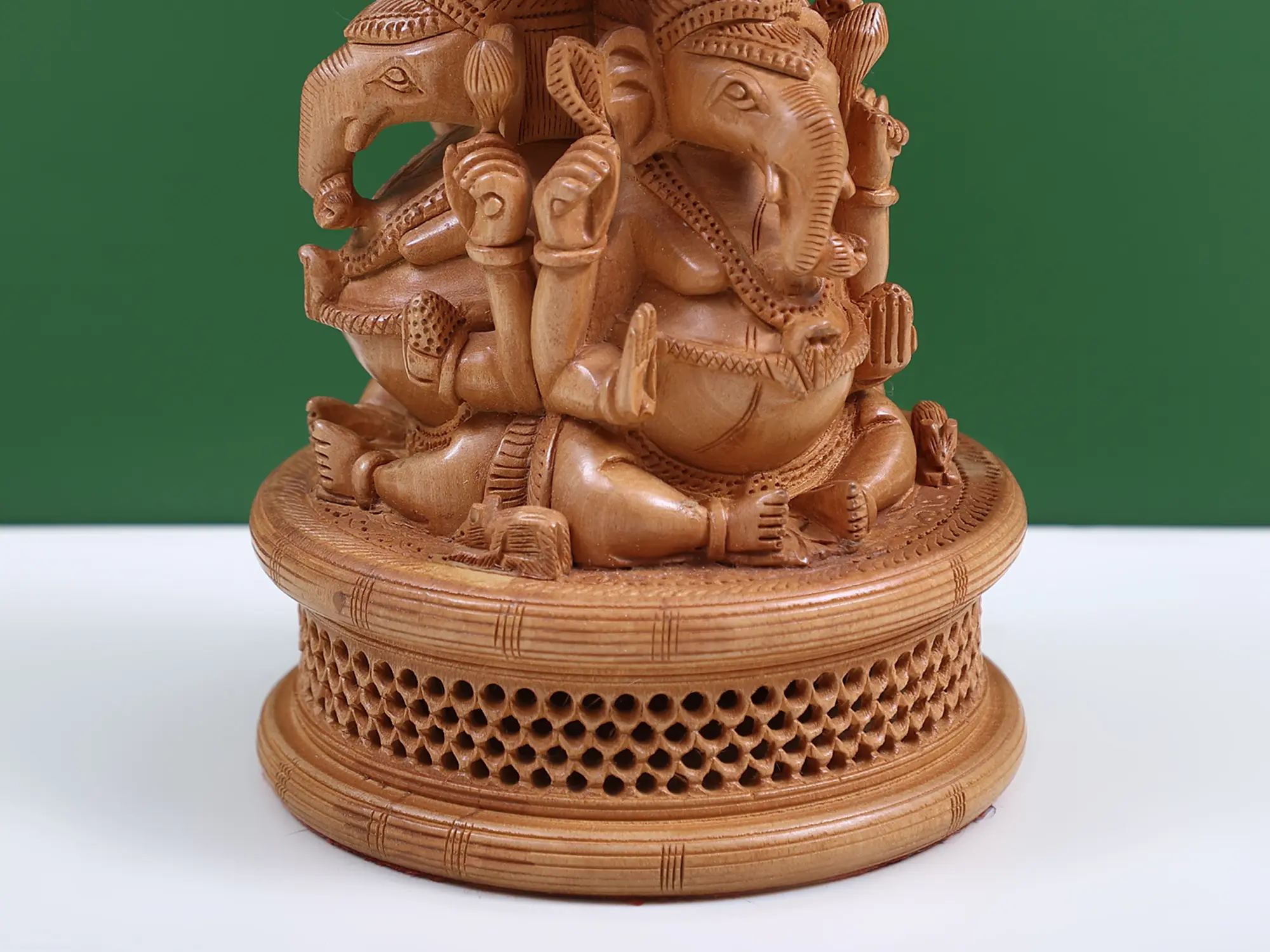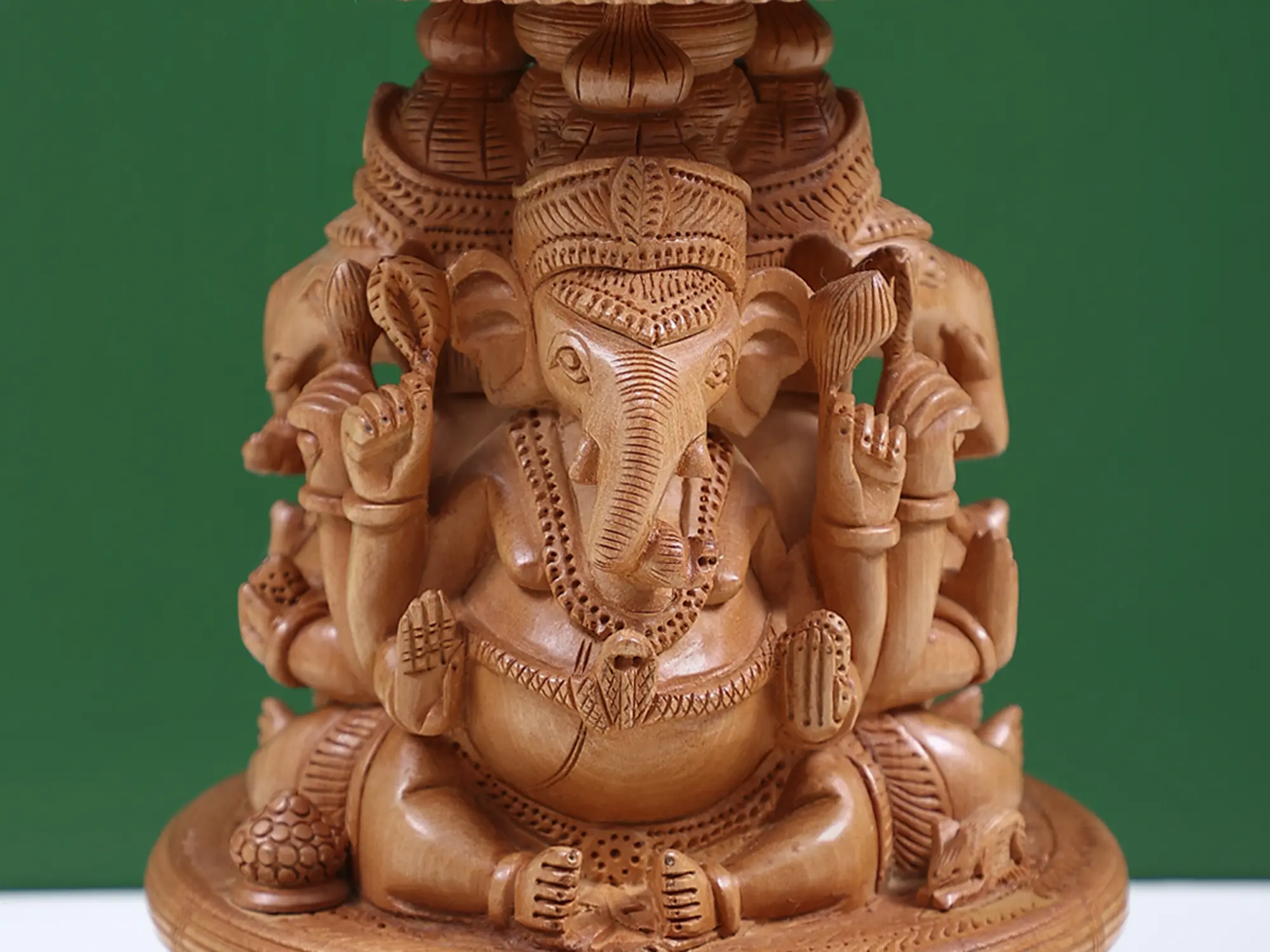 Invite the presence of the Remover of Obstacles into your home with this exquisitely crafted wooden statue of Lord Ganesha. This remarkable piece captures the divine essence of the beloved elephant-headed deity, Ganesha, in a unique and powerful representation. The artistry of this carving lies not only in its intricate details but also in its depiction of Ganesha with three faces, a symbolism that speaks volumes about his multifaceted nature and omnipresent wisdom.