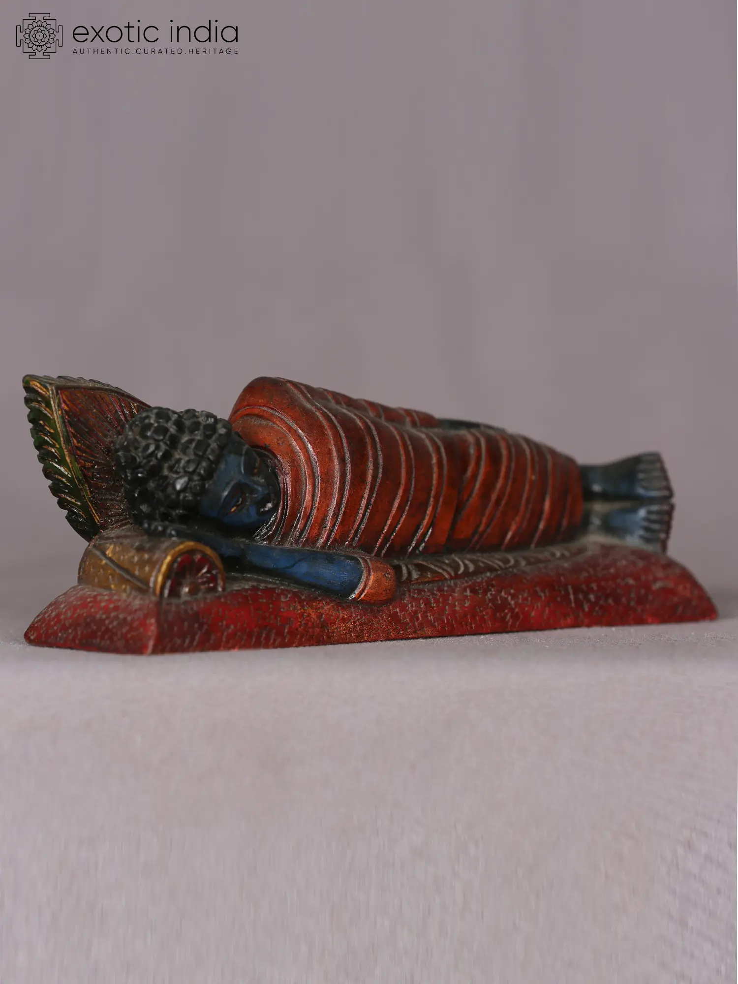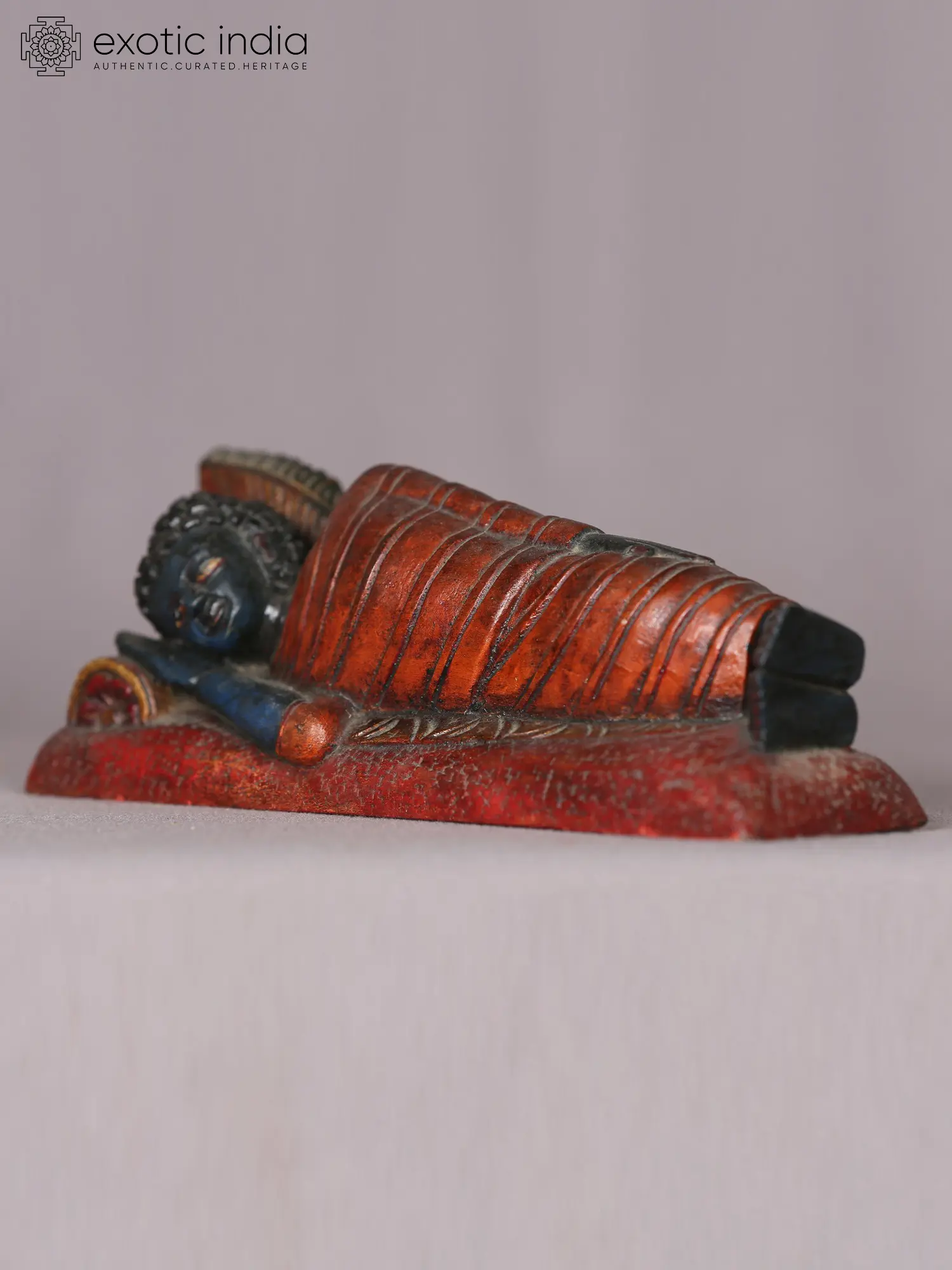 The Wooden Sleeping Lord Buddha is a serene and spiritually evocative sculpture that captures the essence of Siddhartha Gautama's final moments before attaining Nirvana. Crafted from rich mahogany, this masterpiece radiates tranquility through its meticulously carved details. The reclining Buddha lies on his right side, head cradled in his hand, symbolizing his departure from earthly existence. The half-closed eyes and serene smile convey a deep sense of inner peace and enlightenment. Adorned in flowing robes, the iconography showcases the Buddha's journey towards liberation from the cycle of rebirth. This wooden masterpiece stands as a testament to the artist's skill and the profound philosophy it represents.