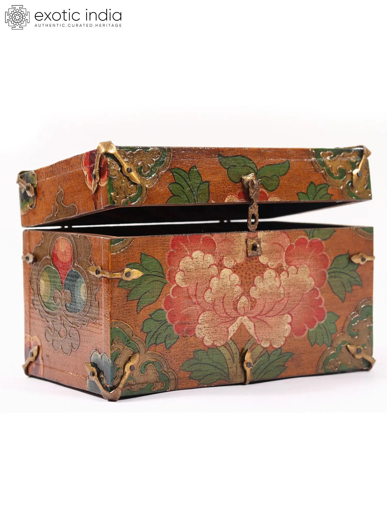 This Wooden Tibetan Buddhist Handpainted Storage Box exemplifies the rich cultural heritage of Tibetan artistry by incorporating traditional Thangka motifs. The box's intricate hand-painted designs, reminiscent of Thangka paintings, adorn both the body and lid, showcasing religious and spiritual symbols. The lid prominently features the sacred Dorje, symbolizing spiritual power and enlightenment.