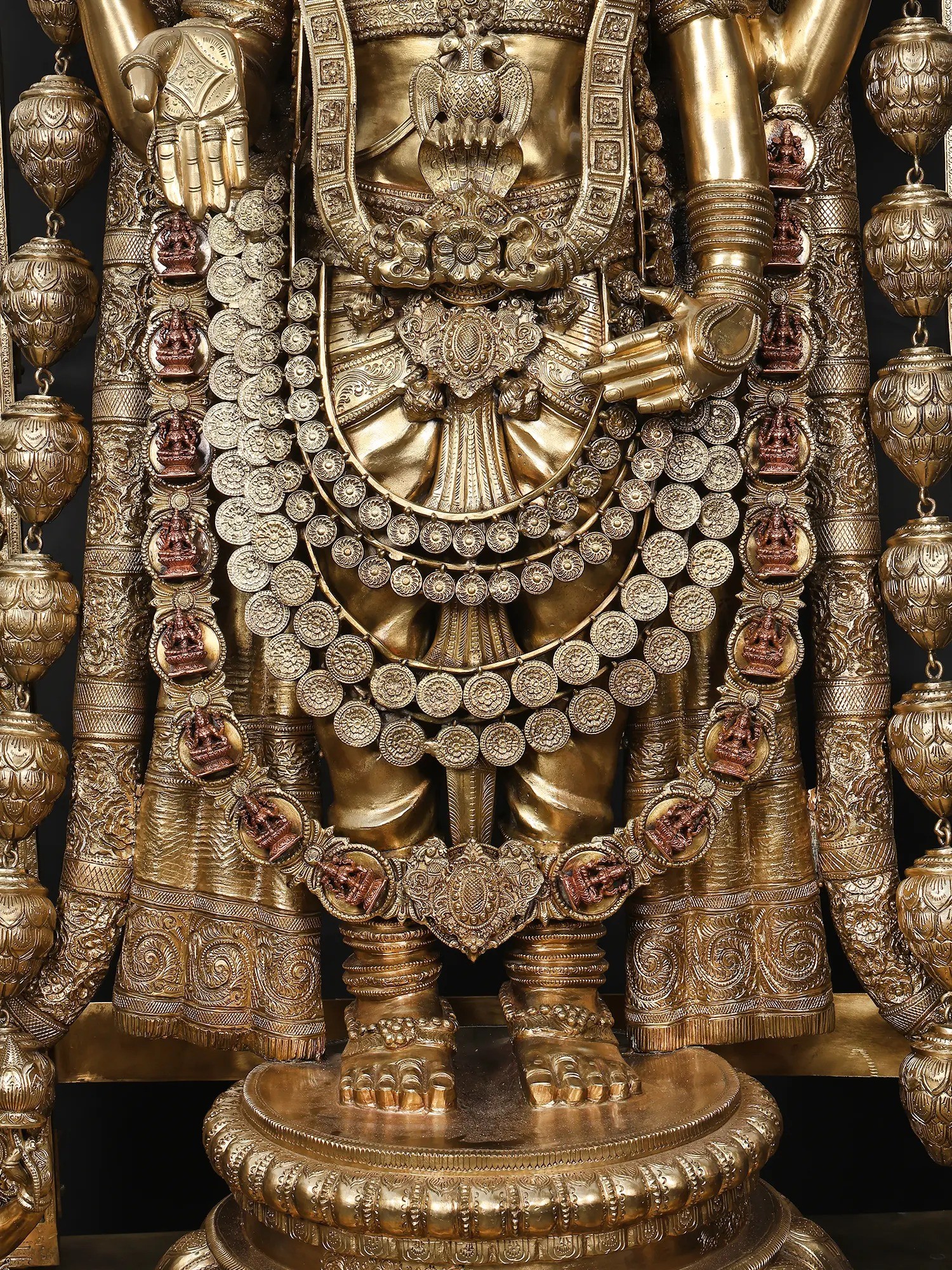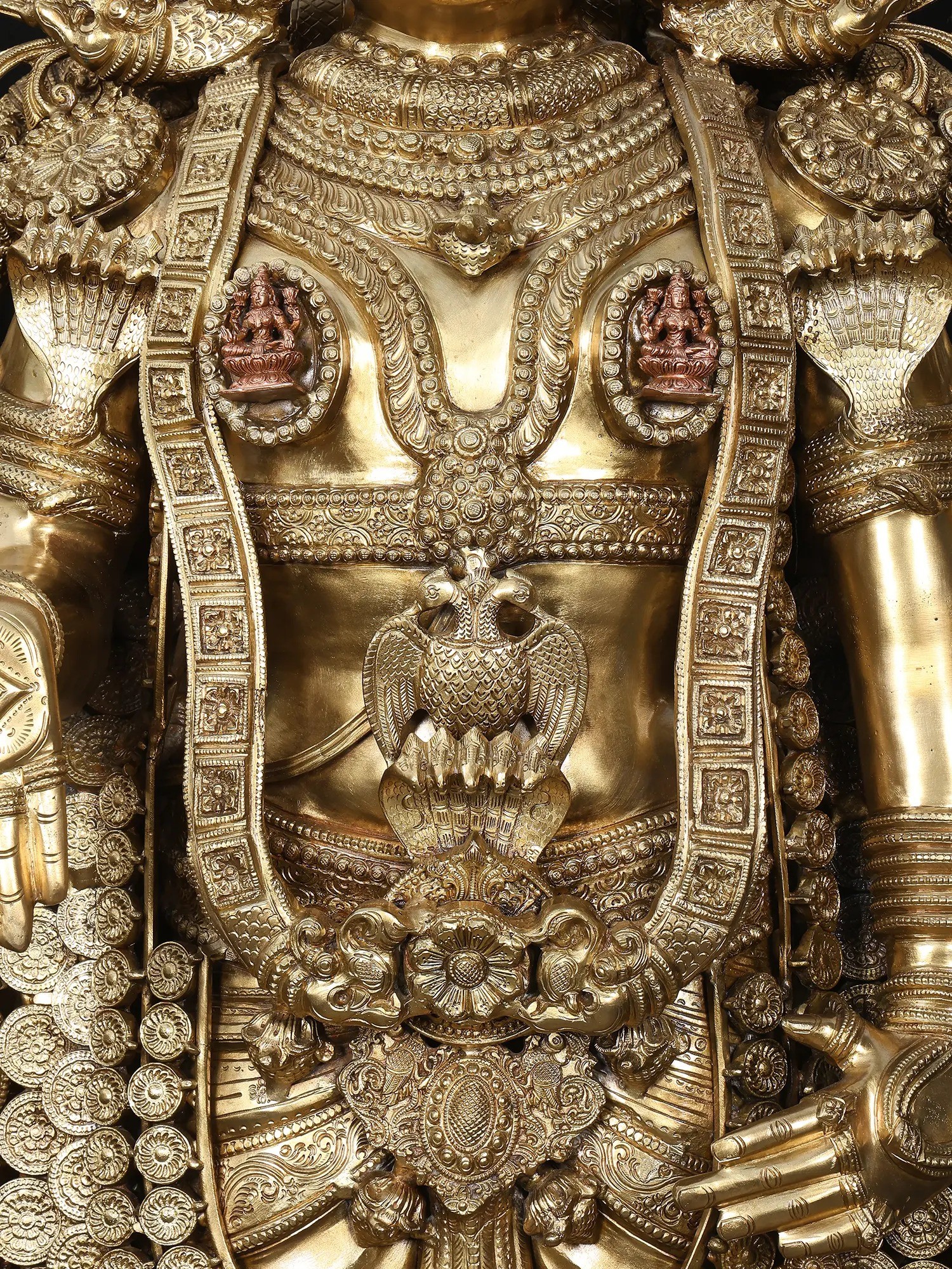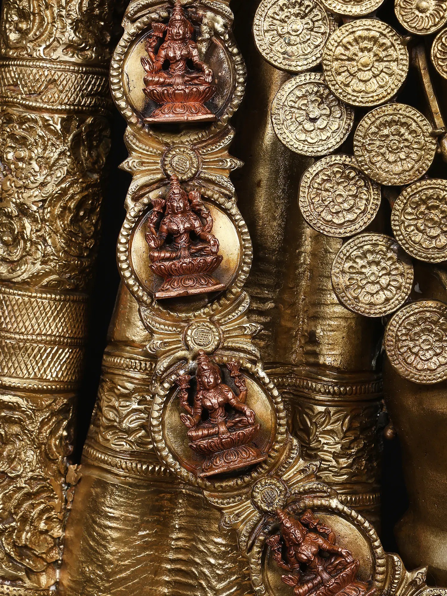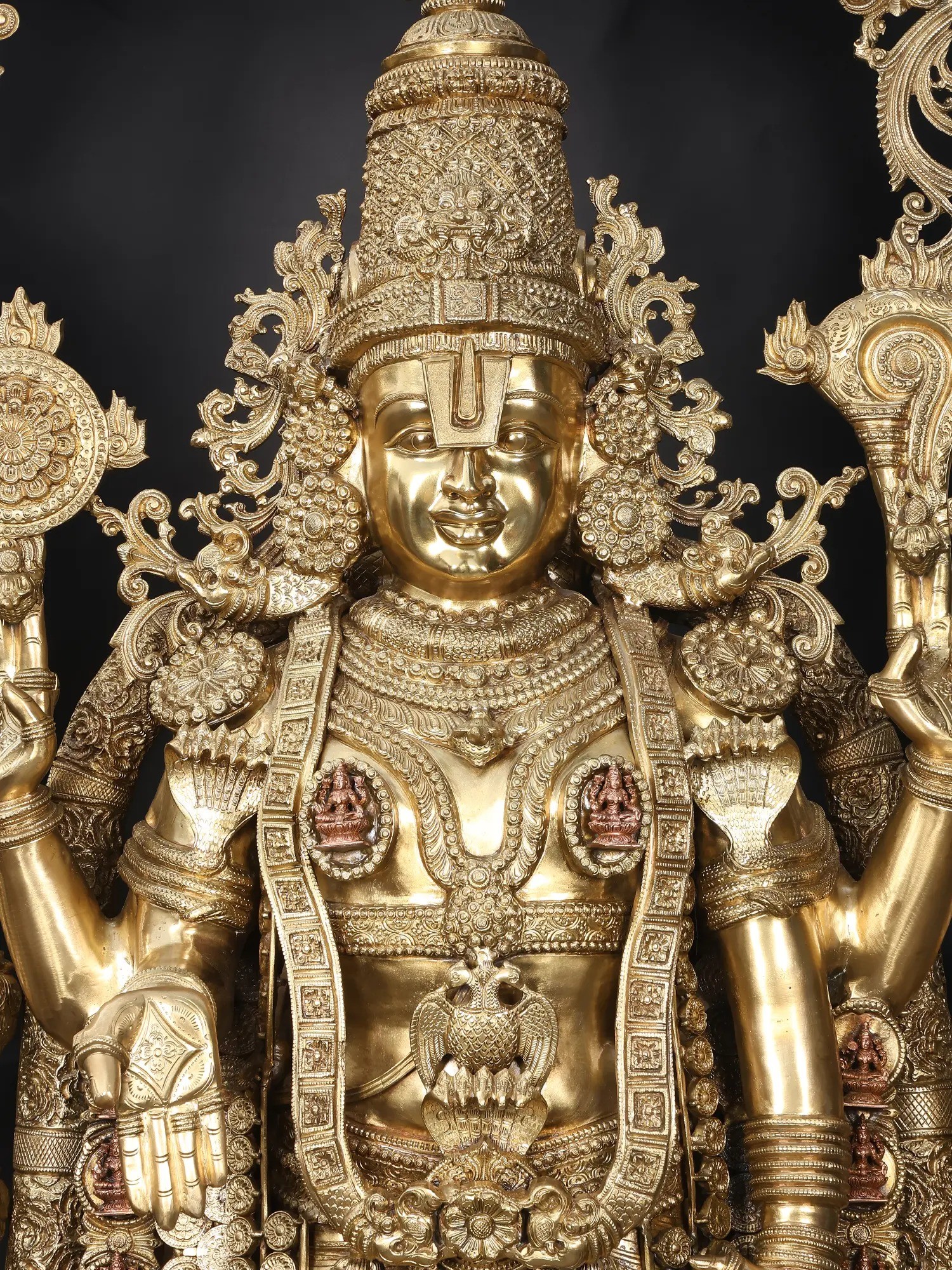 The deity is adorned with a rich array of traditional jewels: the gandabherunda-crest on his chest flanked by Shesha, the stylised makara kundalas, a lotus-bud mala, a coin garland, and the prominent necklace bearing Lakshmi icons, affirming Srinivasa as the eternal abode of the Goddess. Each ornament is rendered with astonishing precision, echoing the opulence of the Tirupati temple tradition.