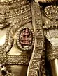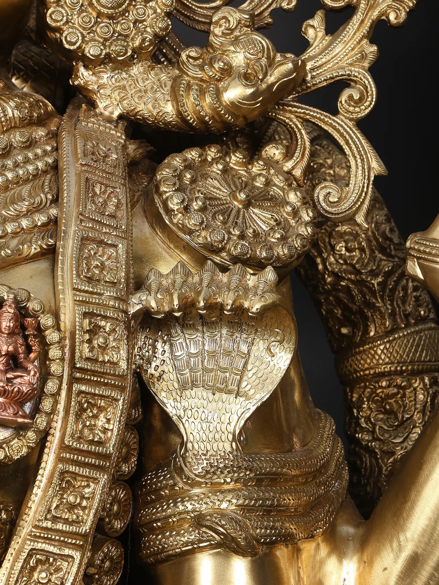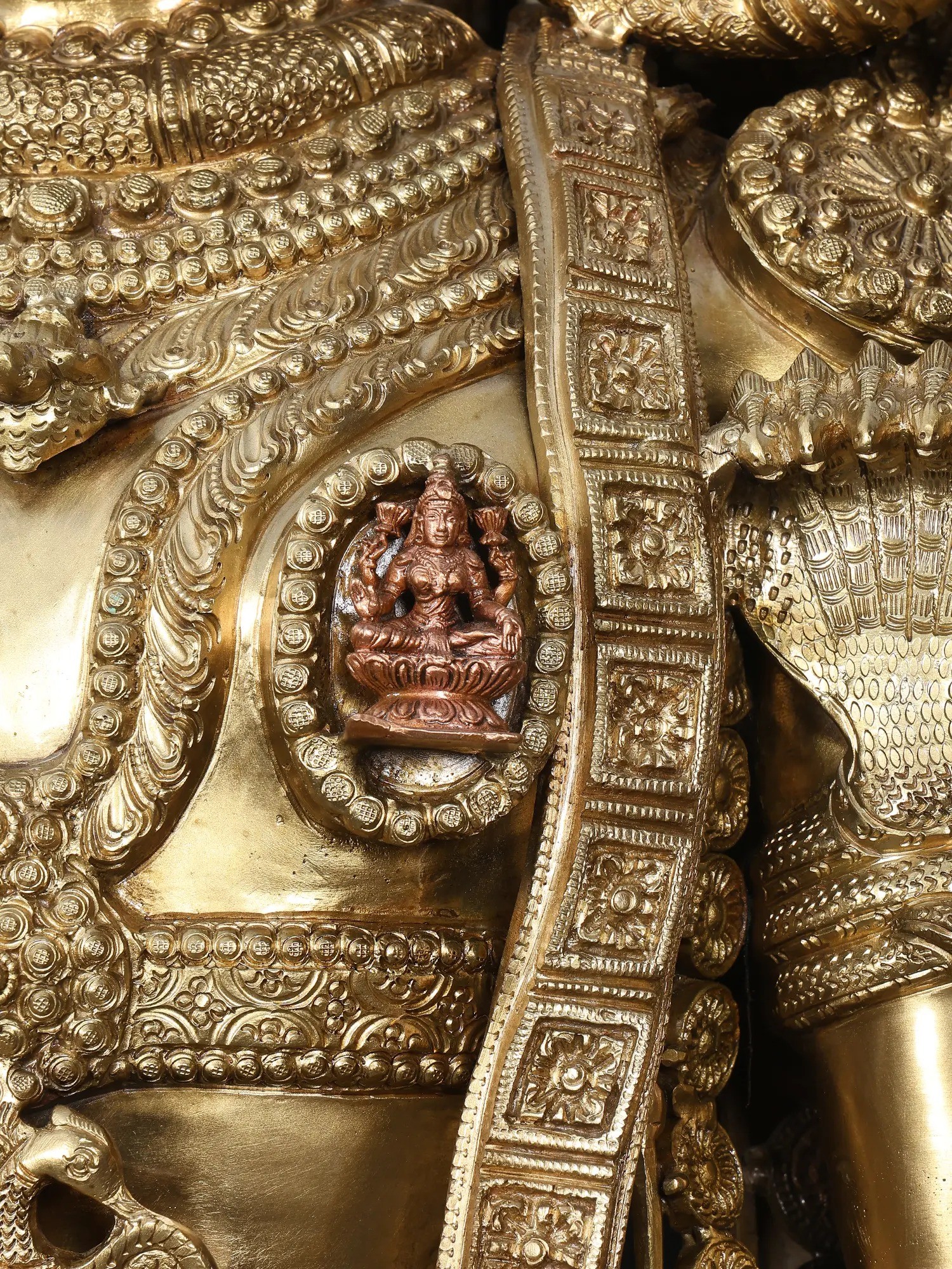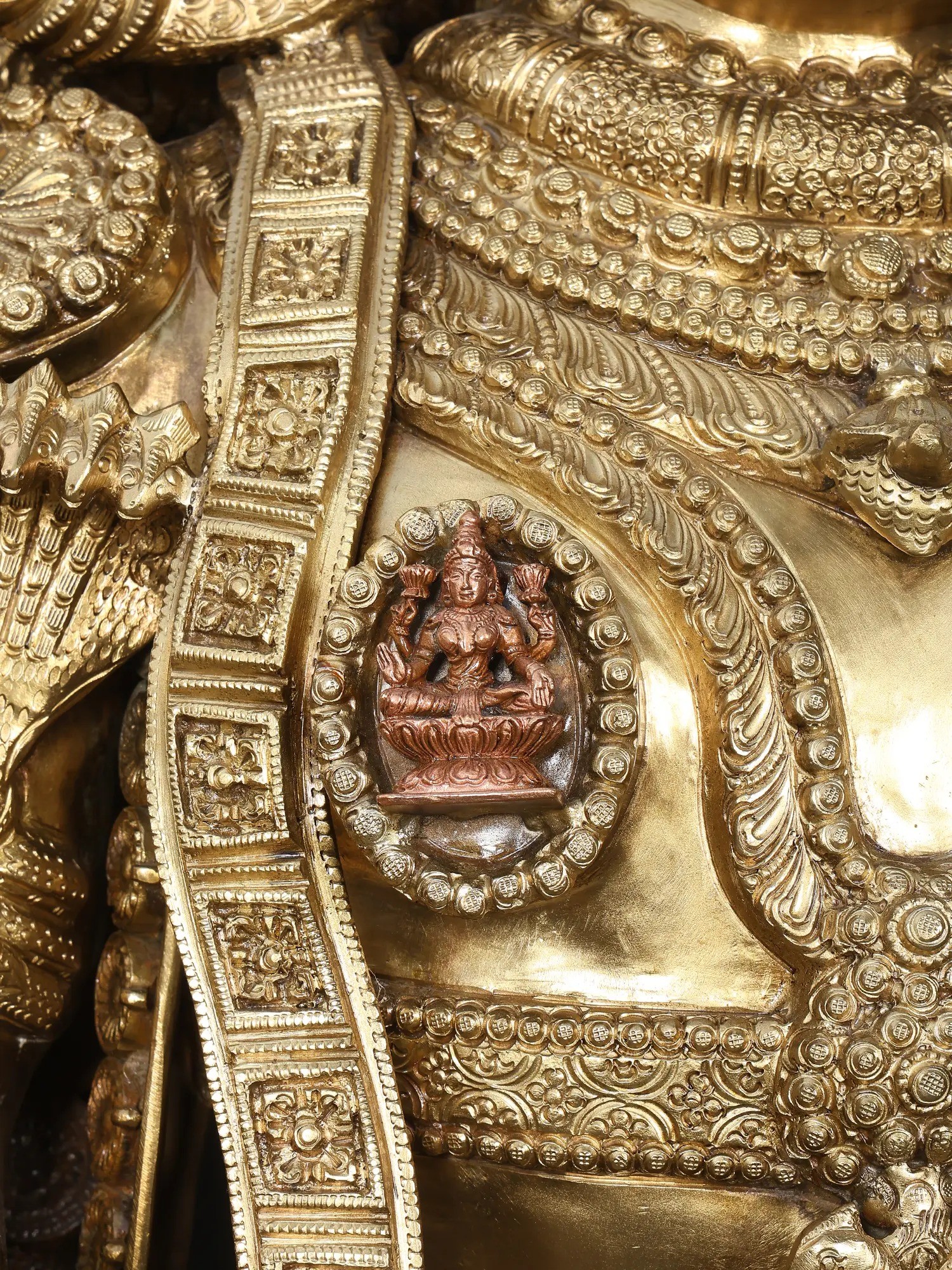 The deity is adorned with a rich array of traditional jewels: the gandabherunda-crest on his chest flanked by Shesha, the stylised makara kundalas, a lotus-bud mala, a coin garland, and the prominent necklace bearing Lakshmi icons, affirming Srinivasa as the eternal abode of the Goddess. Each ornament is rendered with astonishing precision, echoing the opulence of the Tirupati temple tradition.