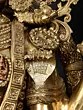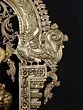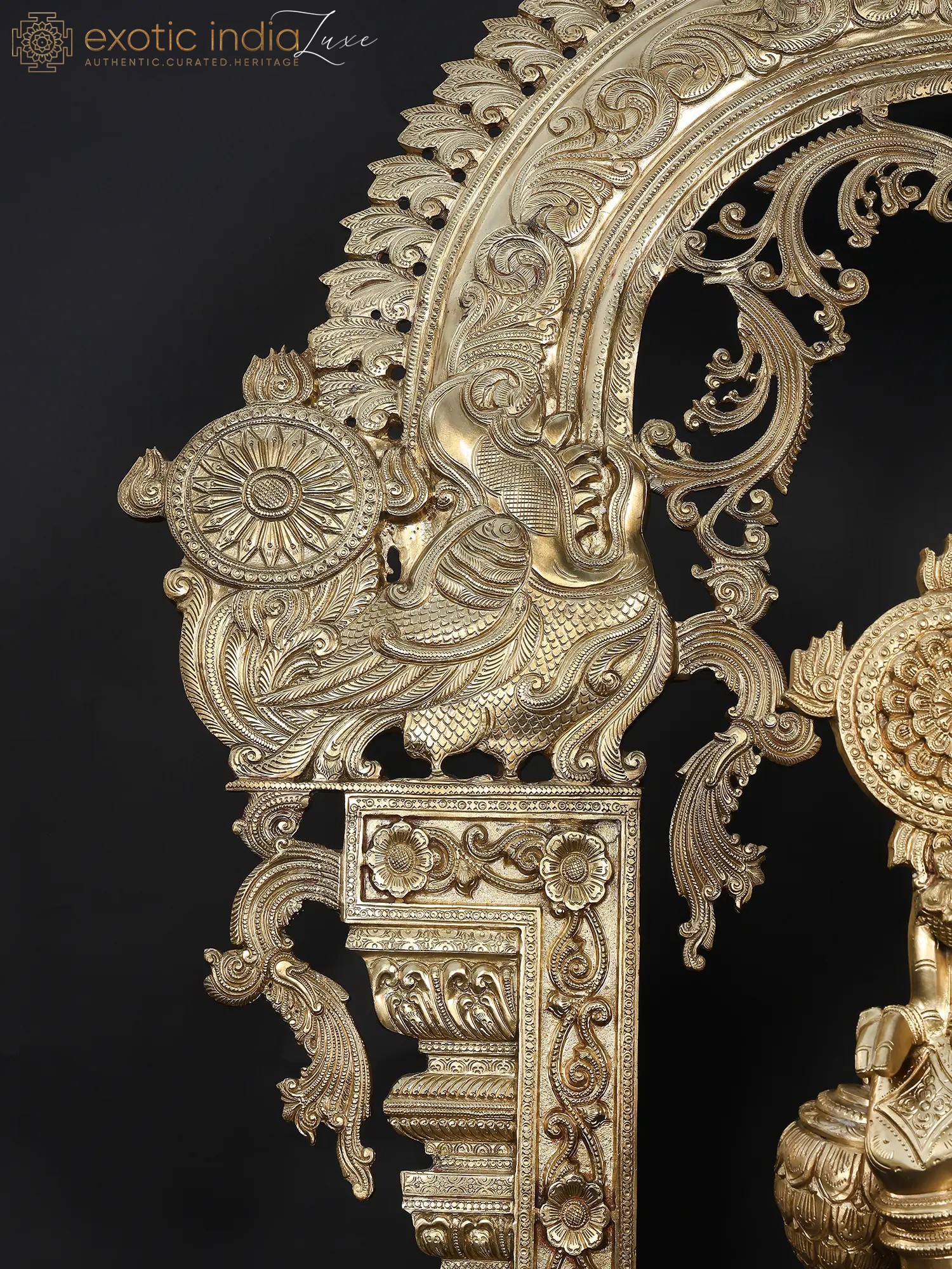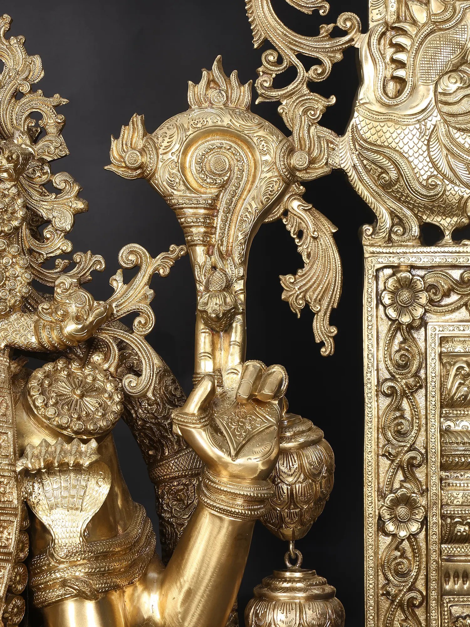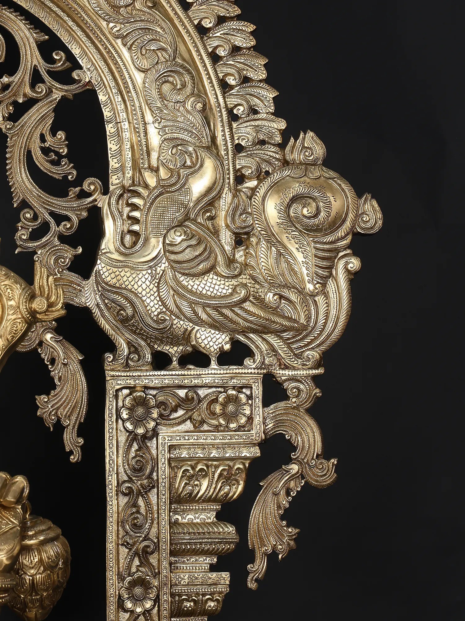Srinivasa stands beneath an exquisitely carved kirtimukha prabhavali. On either side rise the chakra and shankha on the stylised tails of the auspicious Makara.