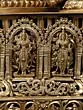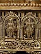 He stands upon a simhasana pedestal, flanked by Sridevi and Bhudevi. At the front corners sit Garuda and Hanuman, guardians and devotees par excellence.