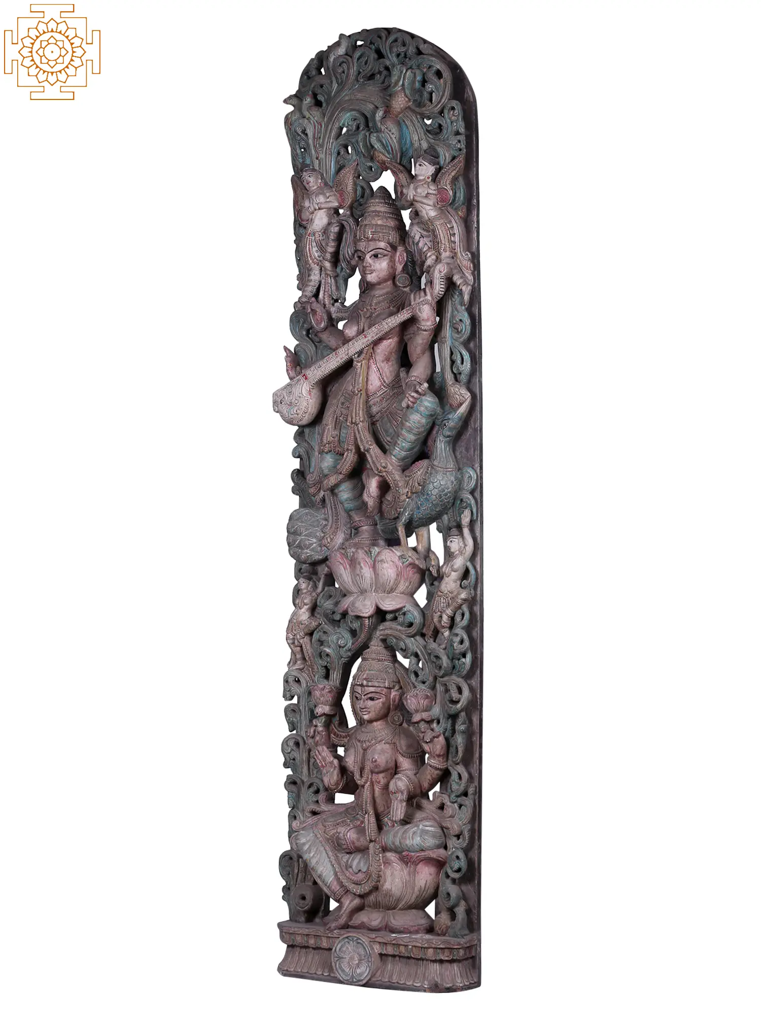 96" Large Wooden Goddess Saraswati On Lotus Pedestal with Goddess Lakshmi