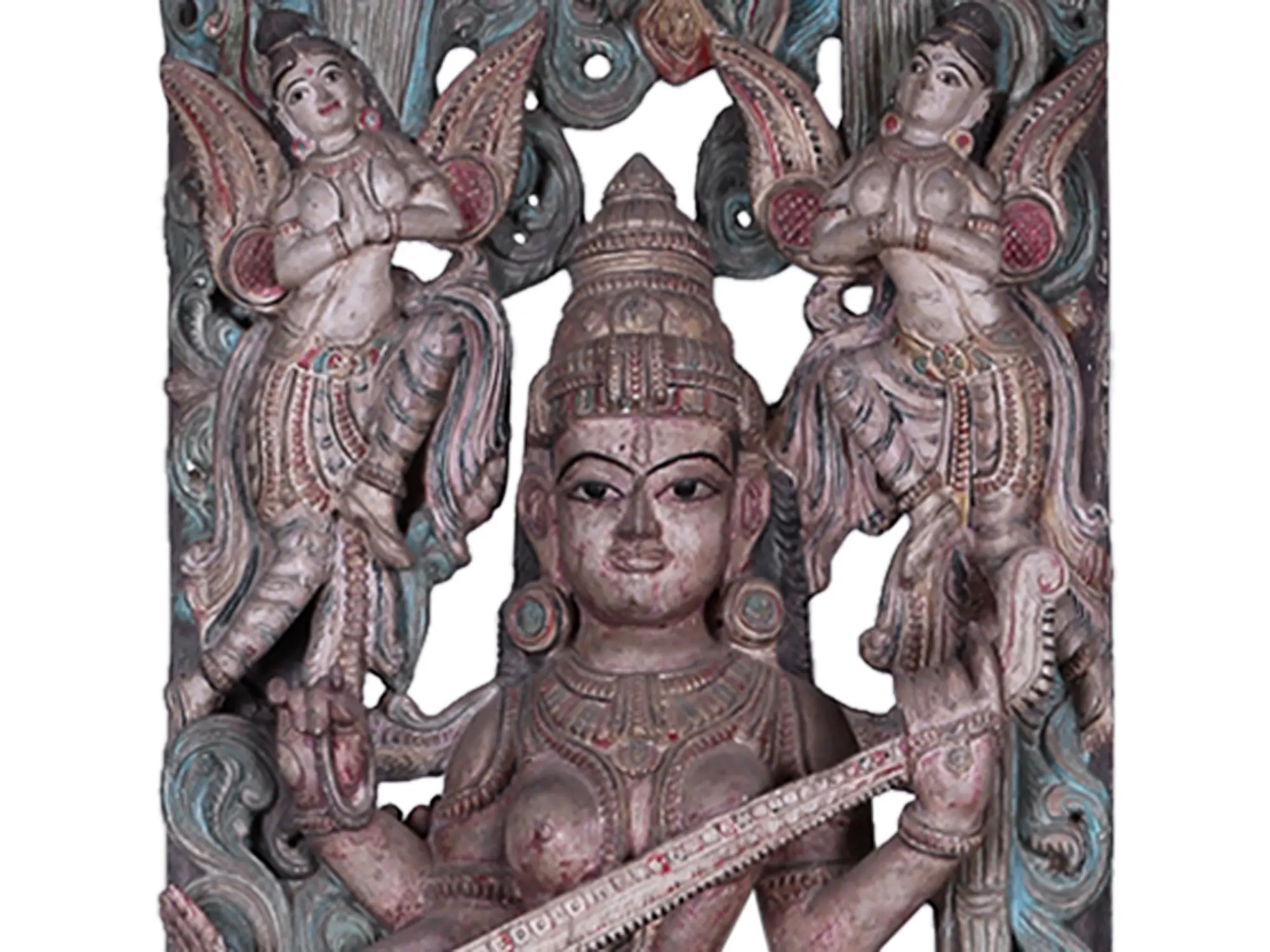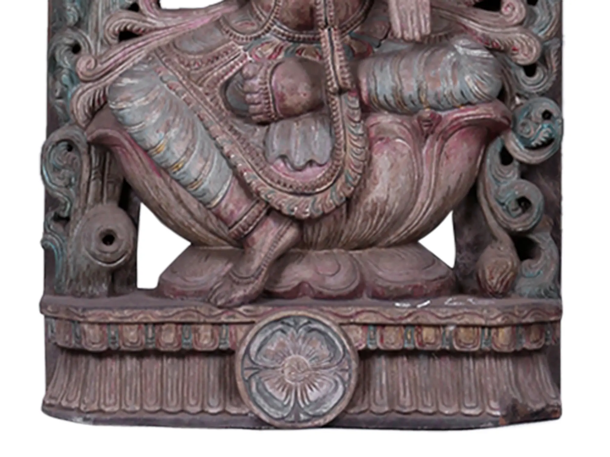 Carved from wood, this large devotional artwork showcases the meticulous craftsmanship and artistic heritage of its origin. The weathered patina and subtle color accents add to its vintage appeal, hinting at stories and epochs past. Such sculptures were traditionally created to adorn temples, homes, or public spaces, serving as focal points for devotion and artistic appreciation. The sheer scale of this piece makes it a commanding presence, capable of transforming any space into a sanctuary of spiritual elegance and aesthetic beauty. It is more than just a decorative object; it is a tangible connection to ancient traditions, divine feminine power, and the timeless pursuit of knowledge and prosperity.