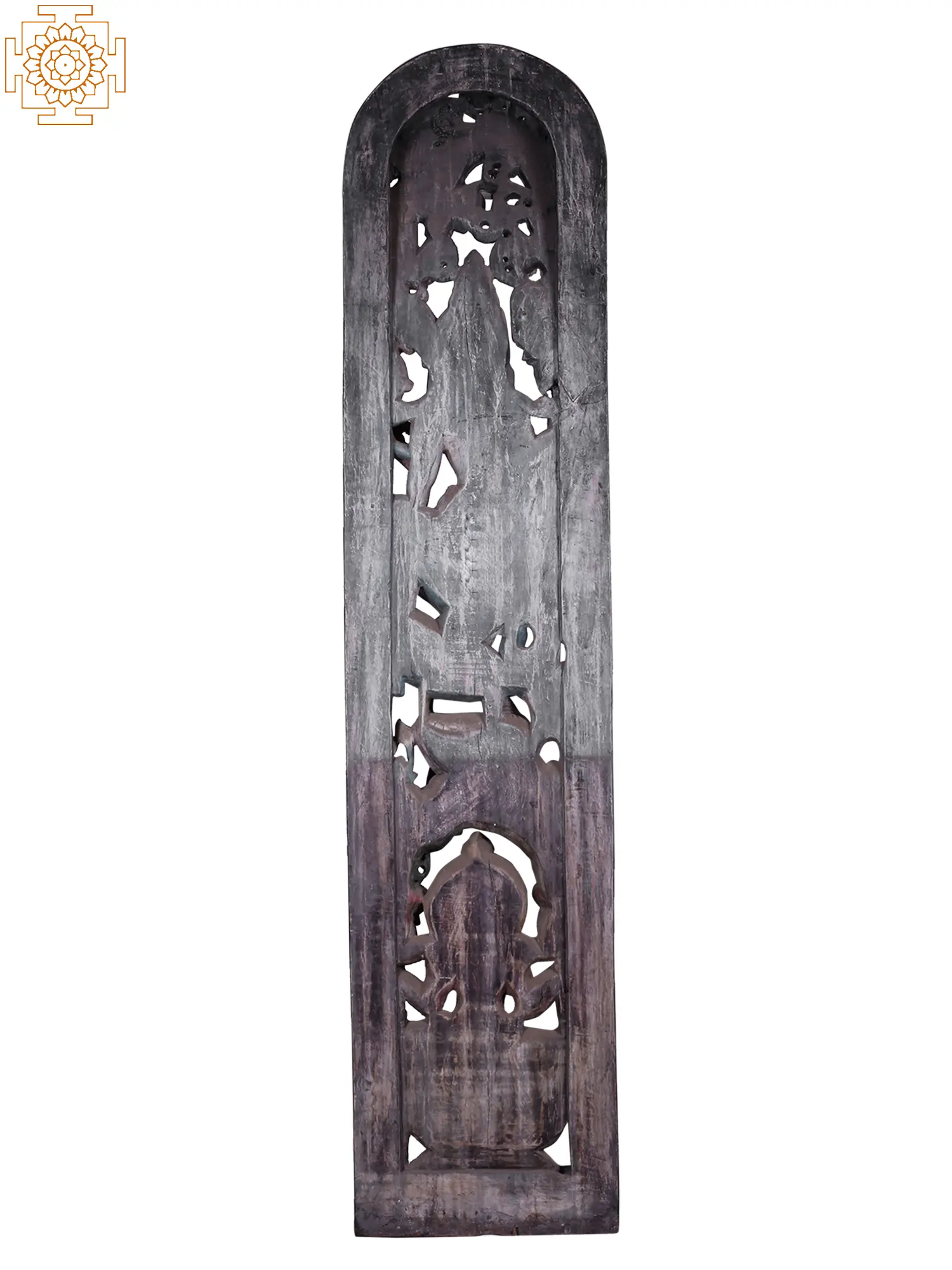 This meticulously carved wooden pillar makes for a site for the eye with its concept of bringing the two major Devis of the Hindu pantheon together - Saraswati and Lakshmi! With its wine-like floral work having birds, apsaras, and kinnaras depicted - Devi Sasarwati has been carved in Urdhajanu pose alongside a peacock, on a Padma playing her Veena holding a Gyan Pustaka and Japa Mala, while her sister Lakshmi sits in Lalitasana on a Padma holding the two lotuses and extending her hands in Abhaya and Varada. This piece in its remarkable carvings represents the sisters together who embody wisdom and fortune.