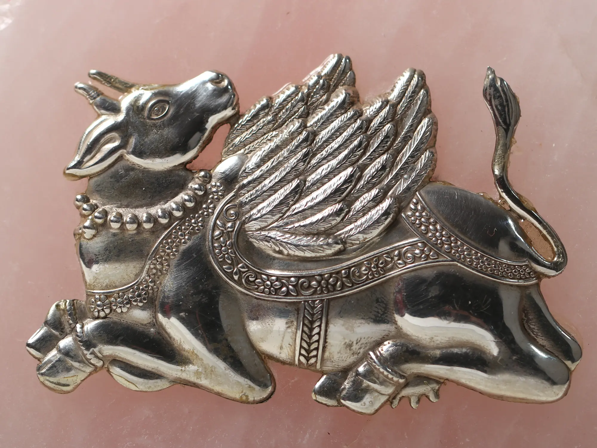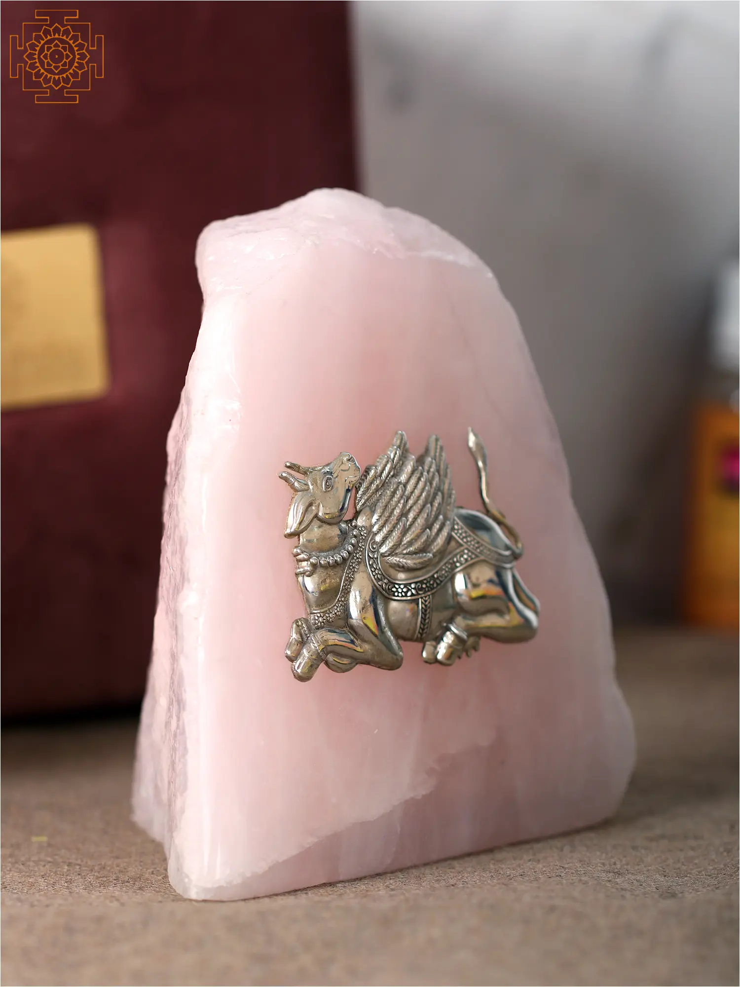 "This magnificent statue, which features the Kamadhenu Cow on Rose Quartz Rock, is a wonderful work of art that mixes the pristine beauty of rose quartz with the grace and elegance of silver. The celestial cow known as Kamadhenu lives in heaven. During the “churning of the seas’, it emerged from the sea. The mother of all cows is Kamadhenu, also known as Surabhi (which means fragrance) in Hindu scriptures. She is a central figure in Hindu culture and fulfils all requests, quenching any longings that a person’s heart could harbour.