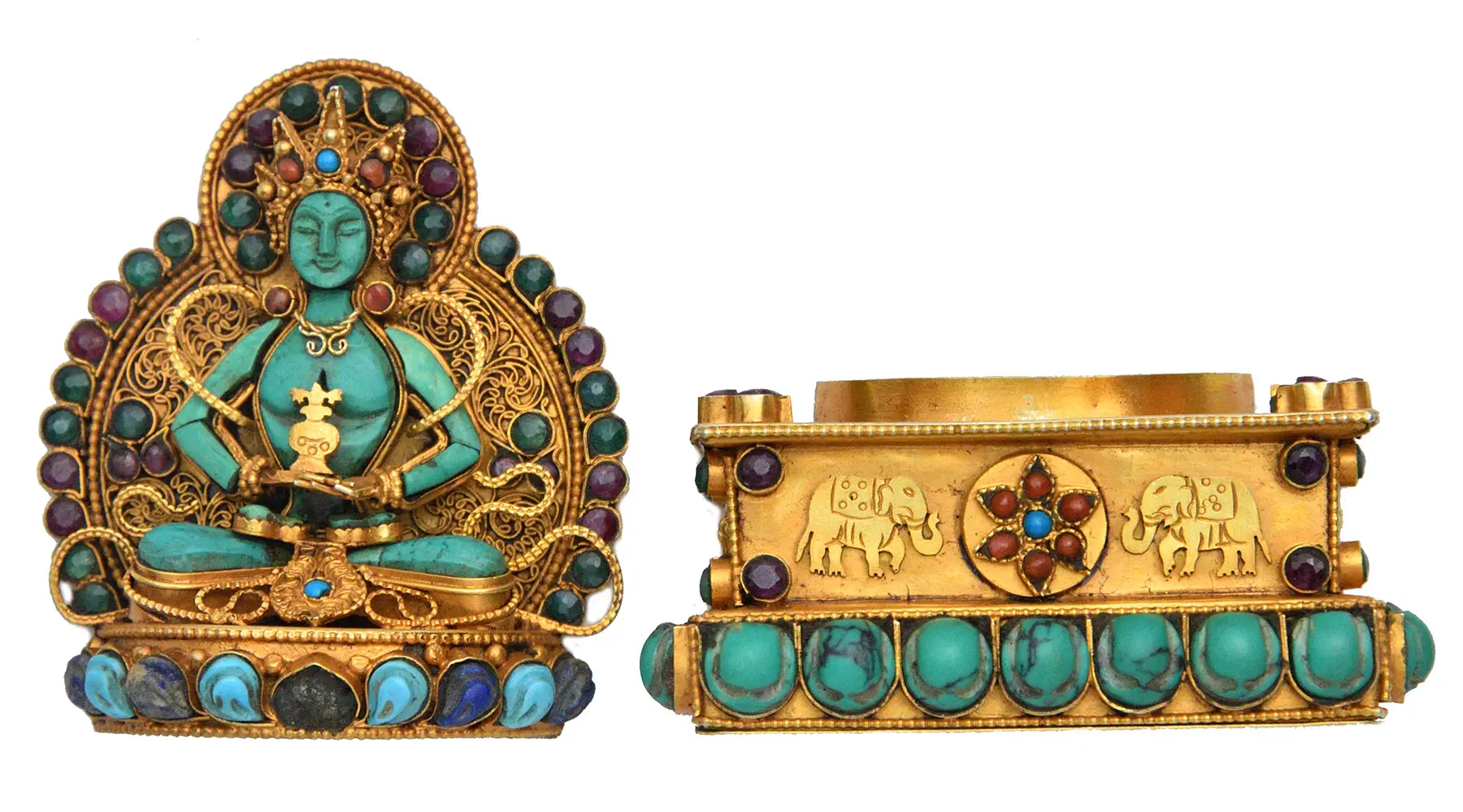 This exquisite piece is a representation of Amitabha, the Buddha of Infinite Light, a central figure in Mahayana Buddhism, particularly revered in Tibetan traditions. Amitabha presides over the Western Pure Land, Sukhavati, a realm of unparalleled bliss and serenity, where beings can achieve enlightenment without the obstacles of this world. He is often invoked for his profound compassion and his ability to guide souls towards rebirth in his pure land, offering a path to liberation and ultimate peace. In Tibetan Buddhism, he is also associated with longevity, wisdom, and the mastery of the senses, and is sometimes depicted in his form as Amitayus, the Buddha of Infinite Life. The serene expression and meditative posture of this deity embody the profound tranquility and boundless wisdom that Amitabha represents.