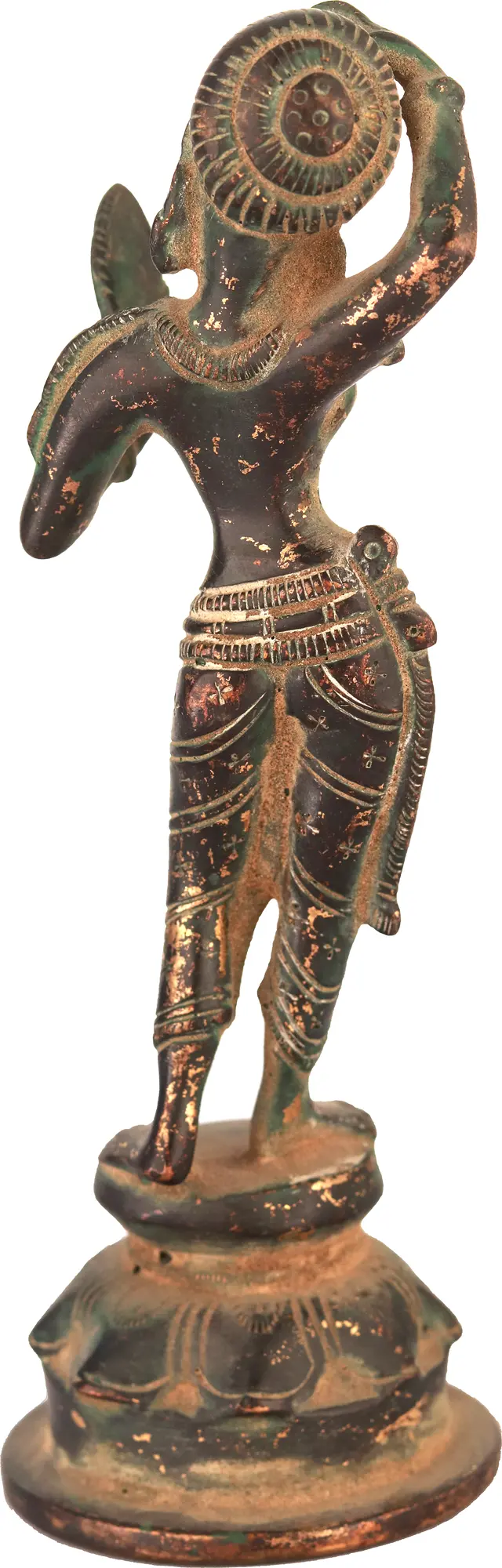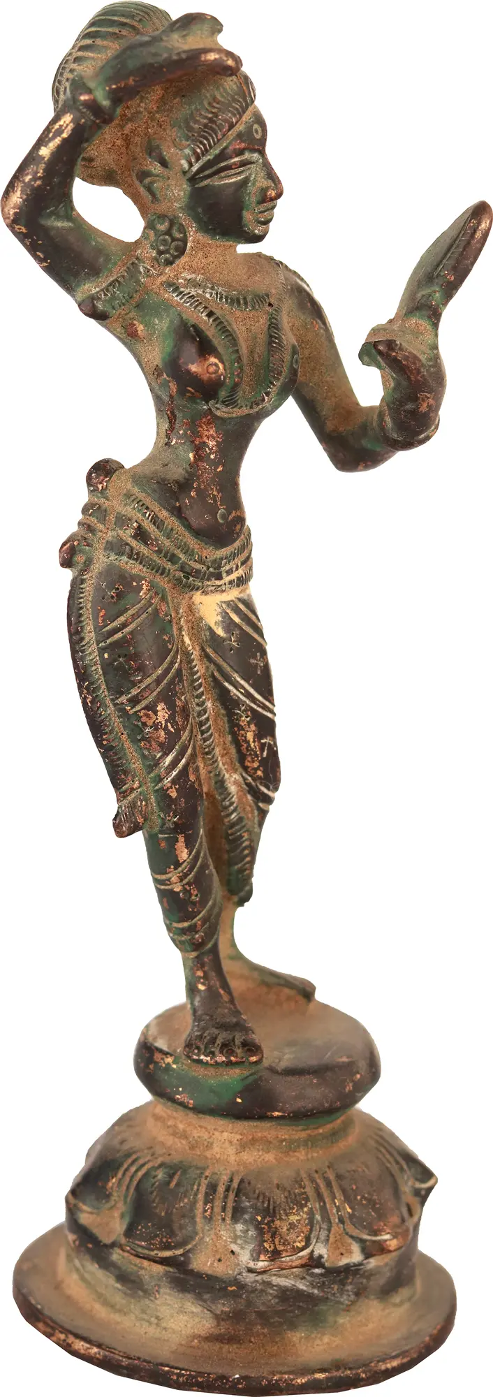 The inspiration drawn from Khajuraho is palpable. The temples of Khajuraho, a UNESCO World Heritage Site, are renowned for their stunning sculptures that depict a wide range of subjects, including deities, celestial beings, and scenes from daily life, often with a sensuous and expressive quality. This Apsara sculpture embodies that same spirit of artistic freedom and celebration of beauty. The patina on the brass, with its blend of darker tones and hints of verdigris and subtle golden highlights, lends an antique charm and a sense of historical depth to the piece, as if it has been unearthed from a forgotten era. This sculpture is more than just a decorative item; it is a piece of art that carries cultural and mythological significance. It invites contemplation on the divine feminine, the ephemeral beauty of the celestial realm, and the rich artistic heritage of India. Its compact size makes it a versatile addition to any space, whether gracing a bookshelf, a side table, or a personal altar. It serves as a constant reminder of the enduring power of art to capture moments of grace and elevate the spirit. Owning this sculpture is like possessing a fragment of ancient mythology, brought to life in enduring brass.