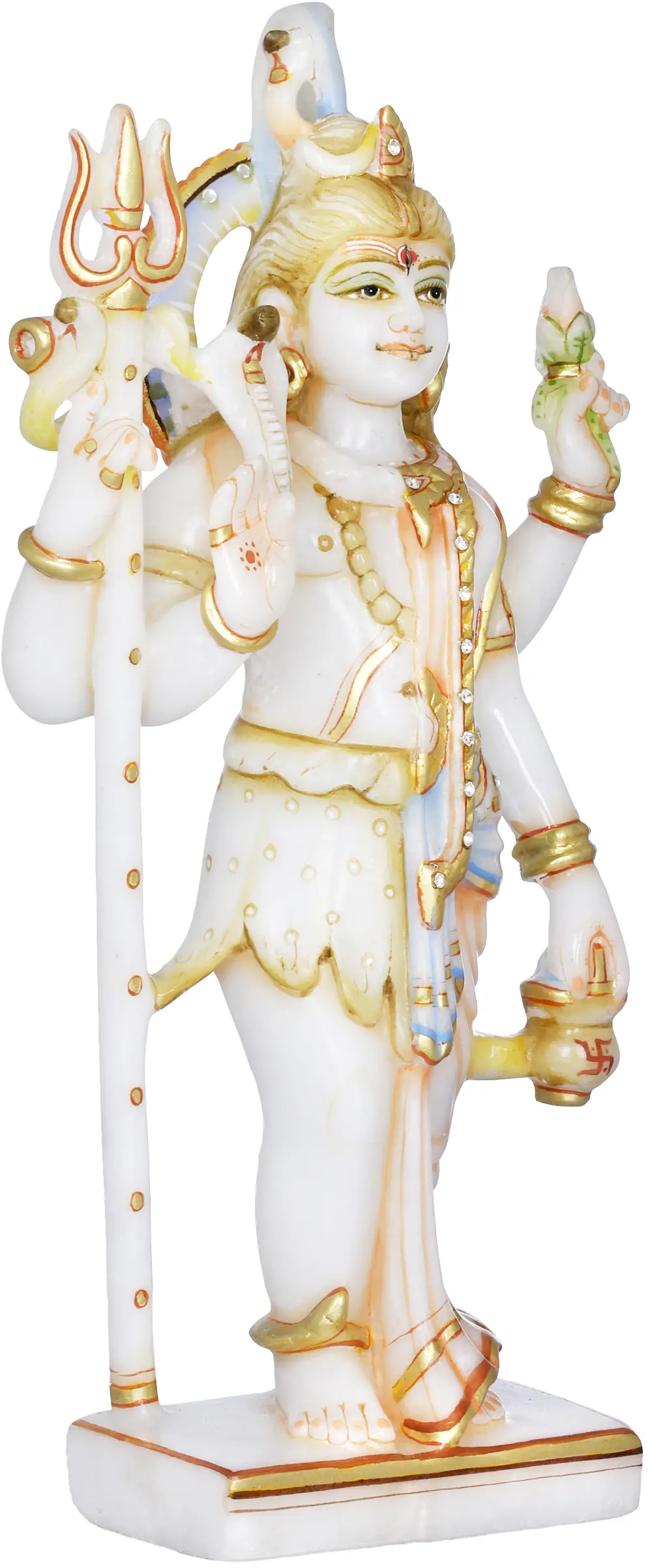 Shiva is in abhaya mudra of blessing and the rear hand holds a trishul symbolizing control over universal time. Female half holds a kamandalu (sacred pot of cold water) and a lotus in the back hand indicating purity. Male half wears a jata-mukuta (headdress of matted hair) with the sacred river Ganga flowing out and a crescent moon adorned on it. Male eye is slightly smaller than the female eye; left side of the neck is adorned with beautiful jewels and right side has a serpent (symbol of death) coiled around it. Third eye is in the centre of Shiva’s tilak and Shakti’s bindi. Shiva is attired in a tiger skin and Shakti wears a sari.