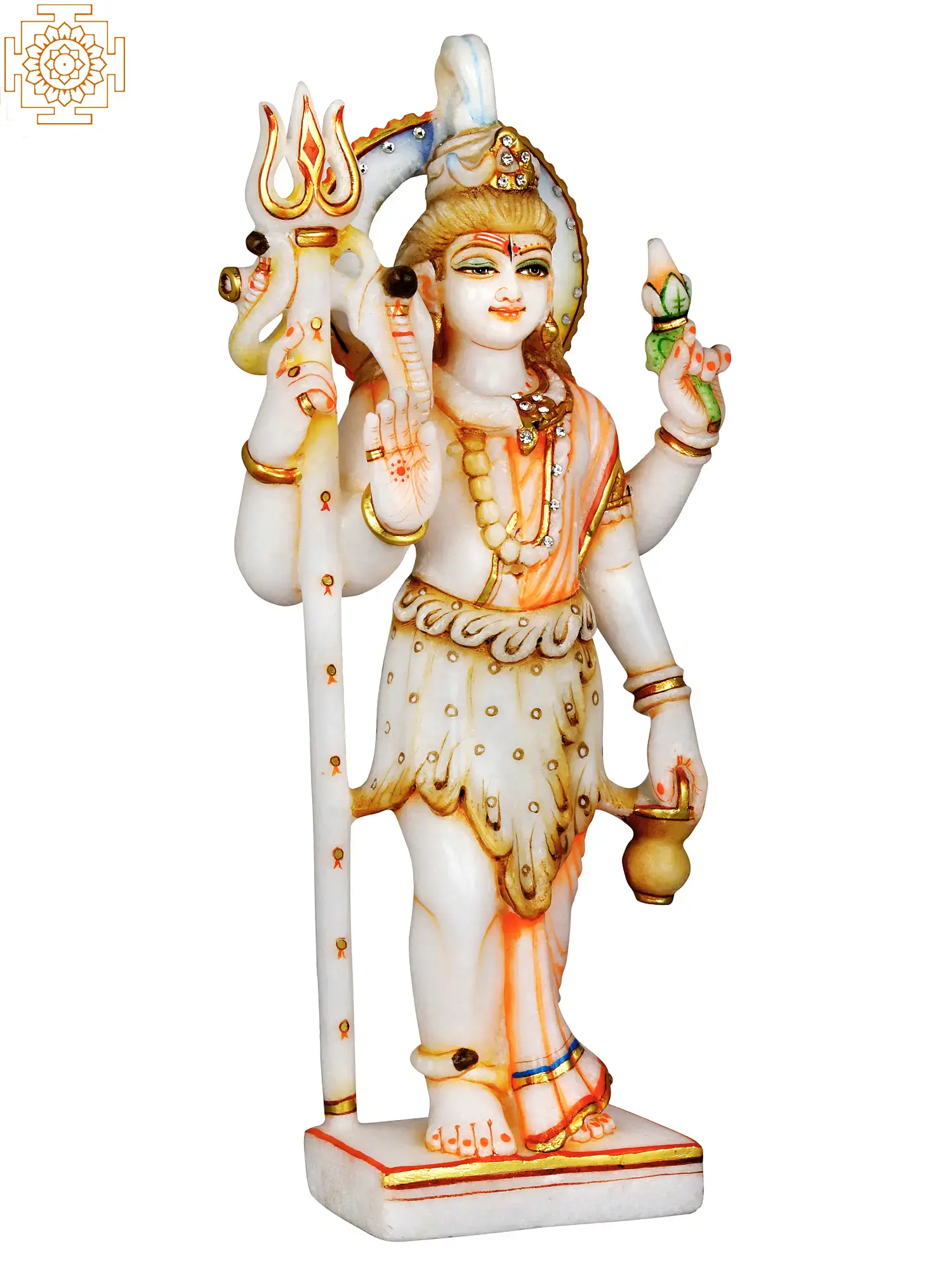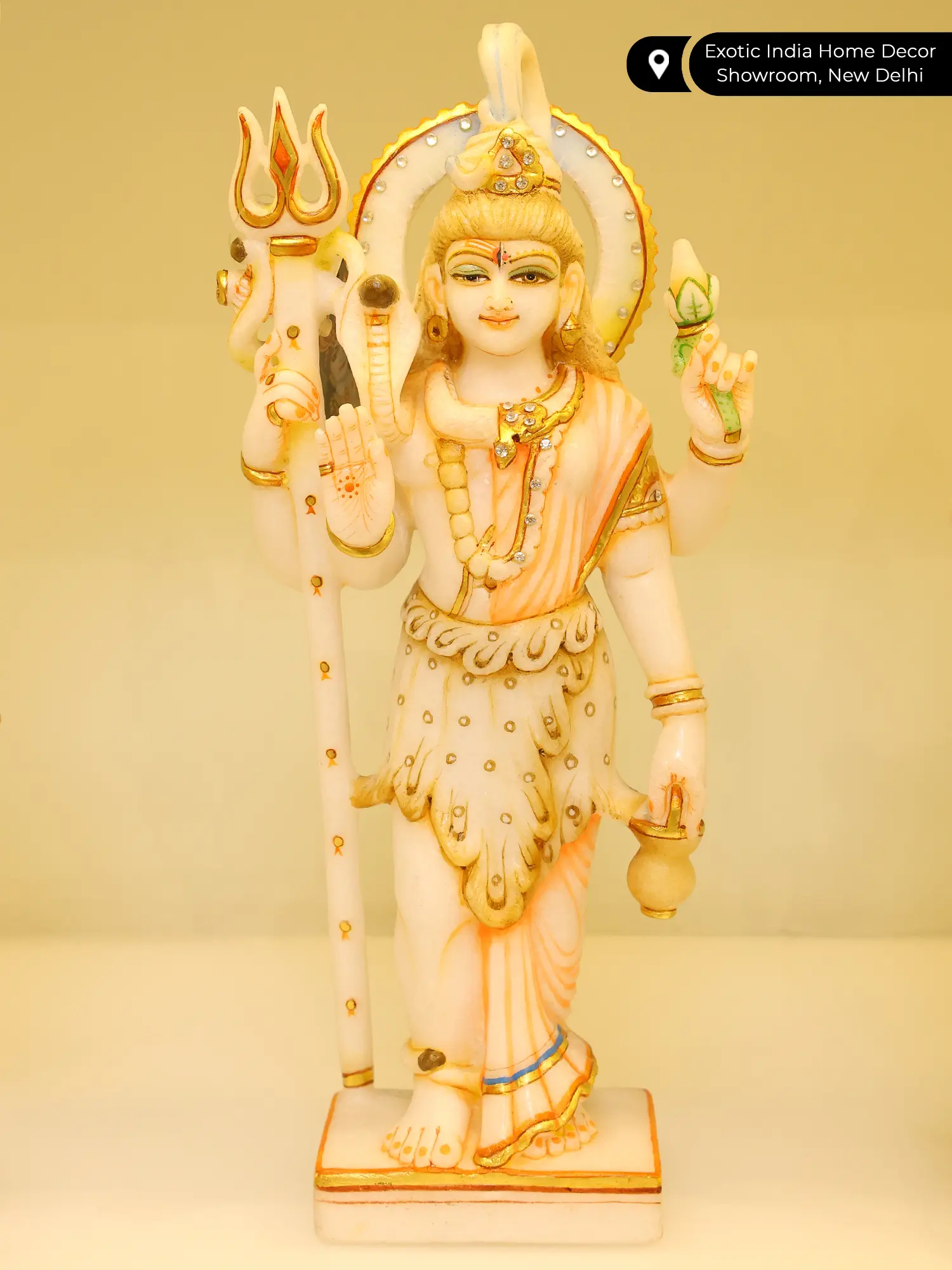 When Lord Brahma was limited by his own imagination in the task of creating the Universe, the supreme Purusha and Prakriti, male and female elements fused and appeared in front of him, in the form of Ardhanarishvra, underlining to Paramapita, the underlying principles of creation- that male and female energy lies at the center of all creative actions and it is from their union, that the Srishti of Brahma emerges. This white marble statue carries the divine vision of Ardhanarishvara, with Shiva appearing on the right half, and Uma as his Vamangi (wife, she who resides on the left) animating the left half of the murti. While Shiva's countenance carries a meditative stillness, Parvati has a steady and activated gaze, characterizing the different natures of Purusha (dormant) and Prakriti (activated) from whose union all life and auspicious activities are made possible.