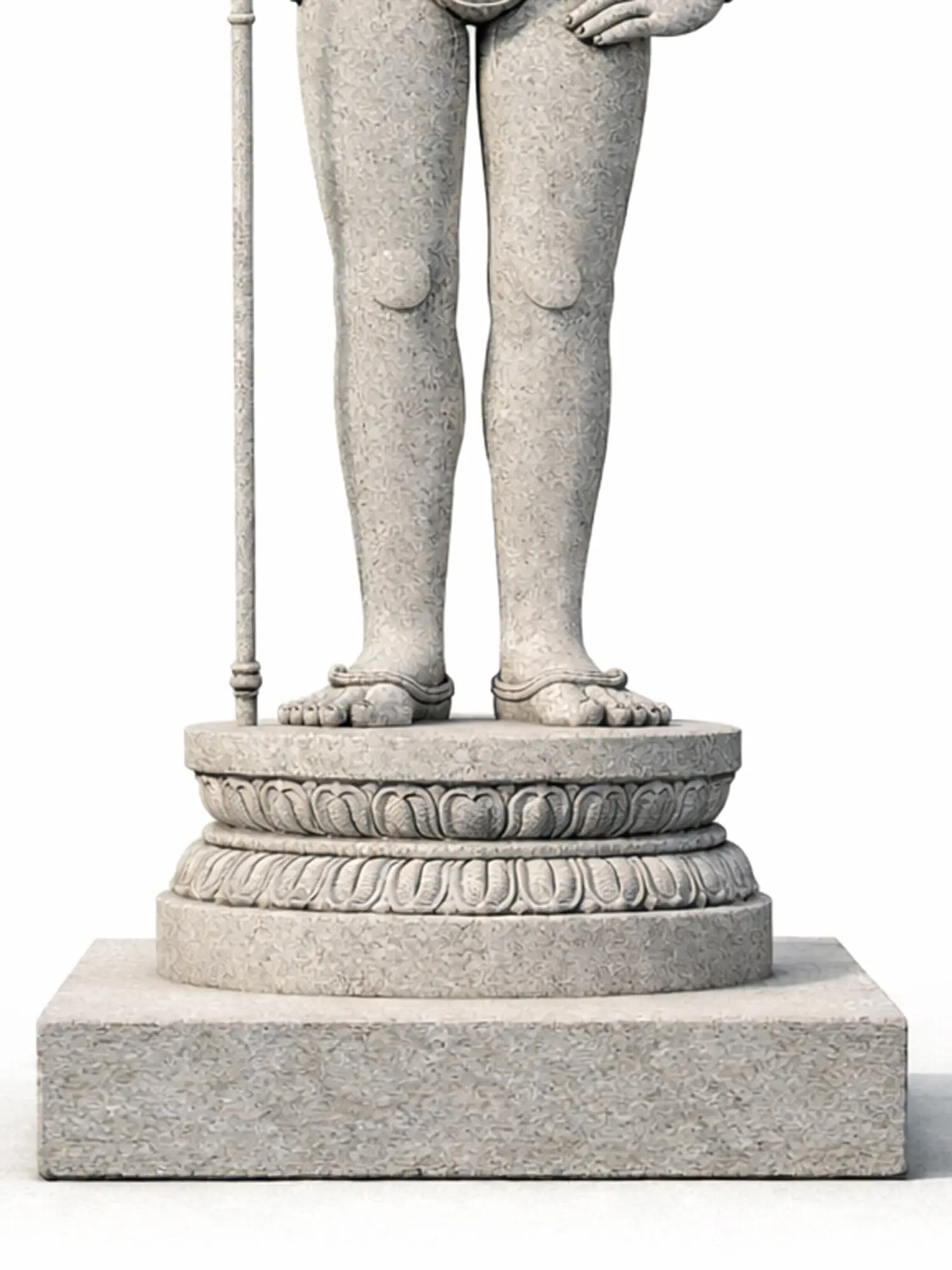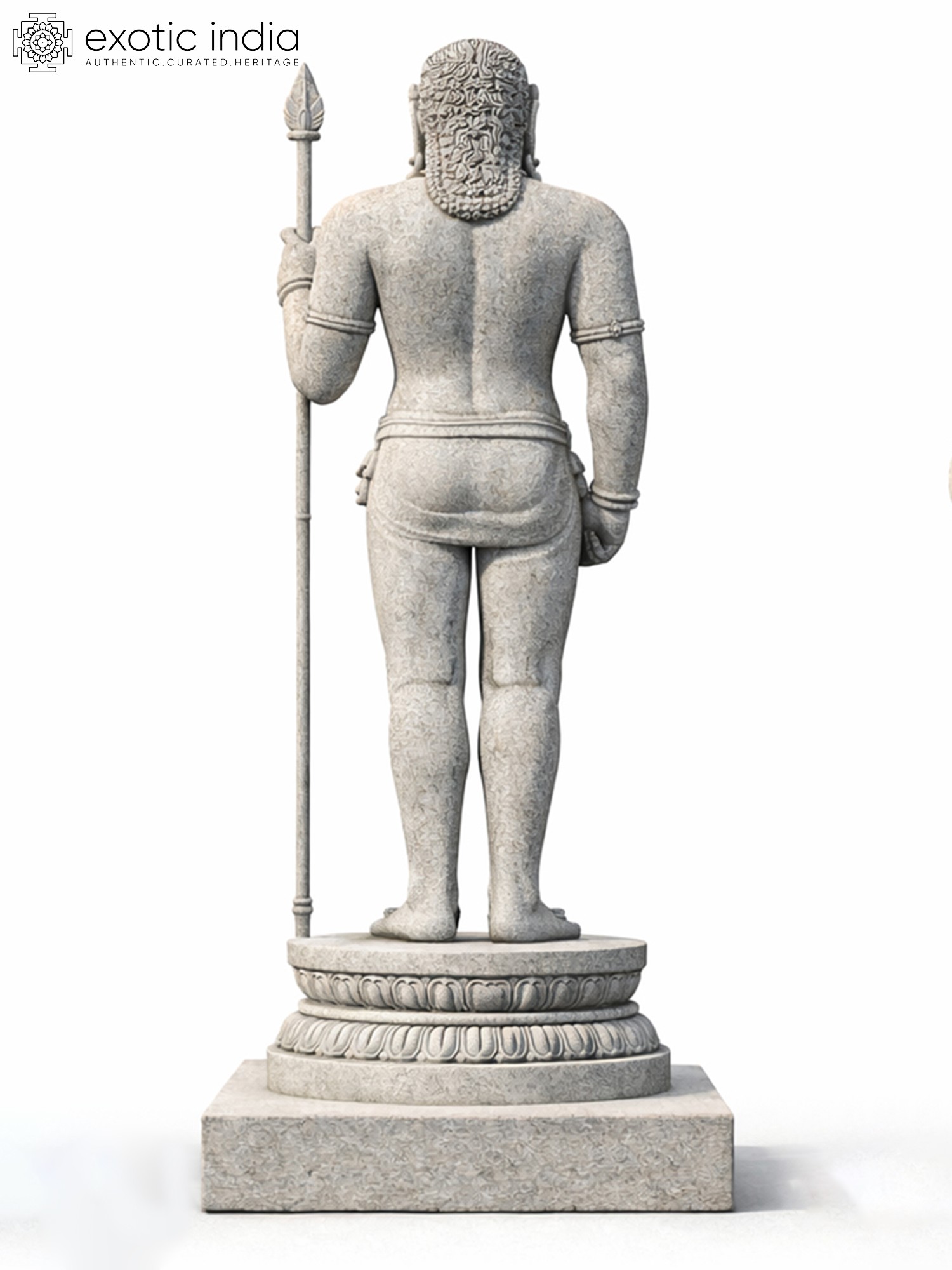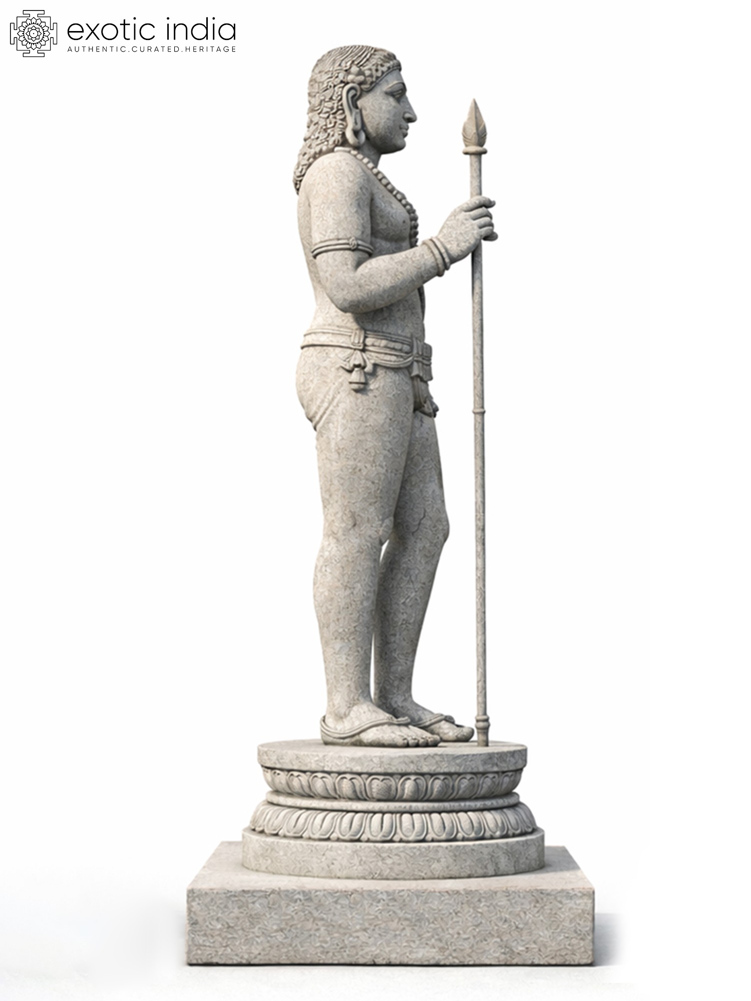 The sheer scale of this testament to devotion is immediately arresting, drawing the eye and inspiring awe. You'll appreciate the powerful, athletic build, rendered with anatomical precision, conveying a sense of readiness and divine energy. Adorned with a series of finely detailed necklaces, a sturdy belt, and armbands, the figure is further brought to life by the subtle carving of facial features, exuding a noble countenance. The figure holds aloft a spear, its tip pointed towards the heavens, a symbol of purpose and unwavering resolve, all presented upon a multi-tiered, lotus-carved pedestal that amplifies its spiritual gravitas.