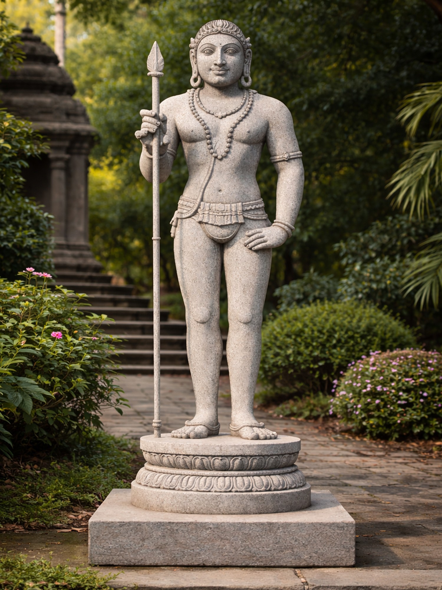 This representation draws inspiration from the rich tapestry of Hindu mythology, depicting Kartikeya, the son of Shiva and Parvati, and the commander of the celestial armies. Revered as the god of war, courage, and victory, his image has been a source of inspiration for warriors and devotees for millennia. The artistic style reflects classical South Indian sculptural traditions, where each element is imbued with symbolic meaning and aesthetic grace, celebrating the divine narratives that have shaped countless lives.