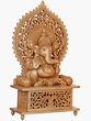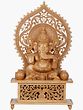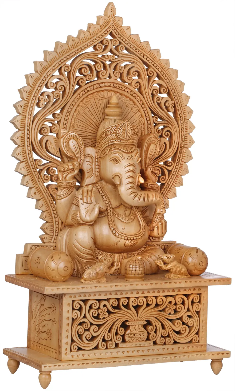 This Ganesha sculpture is a testament to the rich heritage of Indian craftsmanship. Carved from luminous Kadamba wood, a material known for its fine grain and warm hue, the artist's skill is evident in every curve and contour. The lord's benevolent face, with his characteristic trunk and gentle eyes, is rendered with remarkable lifelikeness. Adorned with traditional jewelry and a majestic crown, Ganesha is seated upon a beautifully carved base. Flanking him are his symbolic Mooshika (mouse) vehicles, often depicted as humble servants, and other auspicious motifs, including modaks, his favorite sweet. The large prabhawali, or halo, behind him is a magnificent display of filigree work, reminiscent of temple architecture and celestial radiance. The detailed perforations and decorative elements of the prabhawali create an aura of divine splendor, drawing the eye and inspiring reverence. The base of the sculpture itself is a work of art, featuring ornate patterns and motifs that add to its overall grandeur.