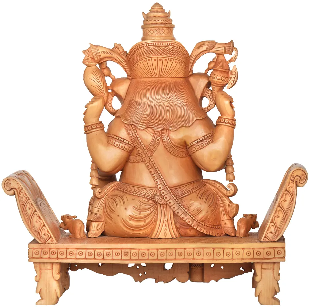 This wooden carving is more than just an idol; it is a testament to the enduring artistry and spiritual depth of Indian traditions. The smooth finish and the fine detailing of the carvings on the throne, including the presence of his loyal vahana, the mouse (Musha), further enhance the authenticity and sacredness of the piece. The sheer presence of this Ganesha idol is sure to elevate any space, be it your living room, meditation room, or office. It serves as a constant reminder of divine wisdom and the blessings that come with overcoming challenges. This sculpture is an ideal gift for loved ones, symbolizing well wishes for their endeavors and a life filled with prosperity and peace. Let this beautifully carved Ganesha usher in an era of auspicious beginnings and unwavering strength into your life.