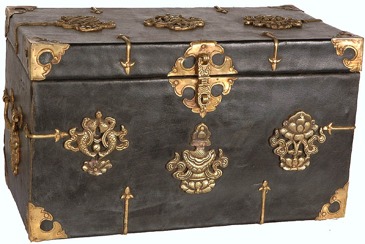 Adorned with the eight auspicious symbols, this handcrafted box is more than just a container; it is a vessel of blessings. Crafted from sturdy wood, covered in supple leather, and accented with shimmering brass details, this substantial piece evokes a sense of timeless elegance and spiritual significance. Its dimensions of 8.0 x 14.0 x 7.5 inches make it a versatile size for storing valuables, cherished keepsakes, or meditative objects. Each detail is thoughtfully executed, hinting at the rich cultural heritage from which it originates.