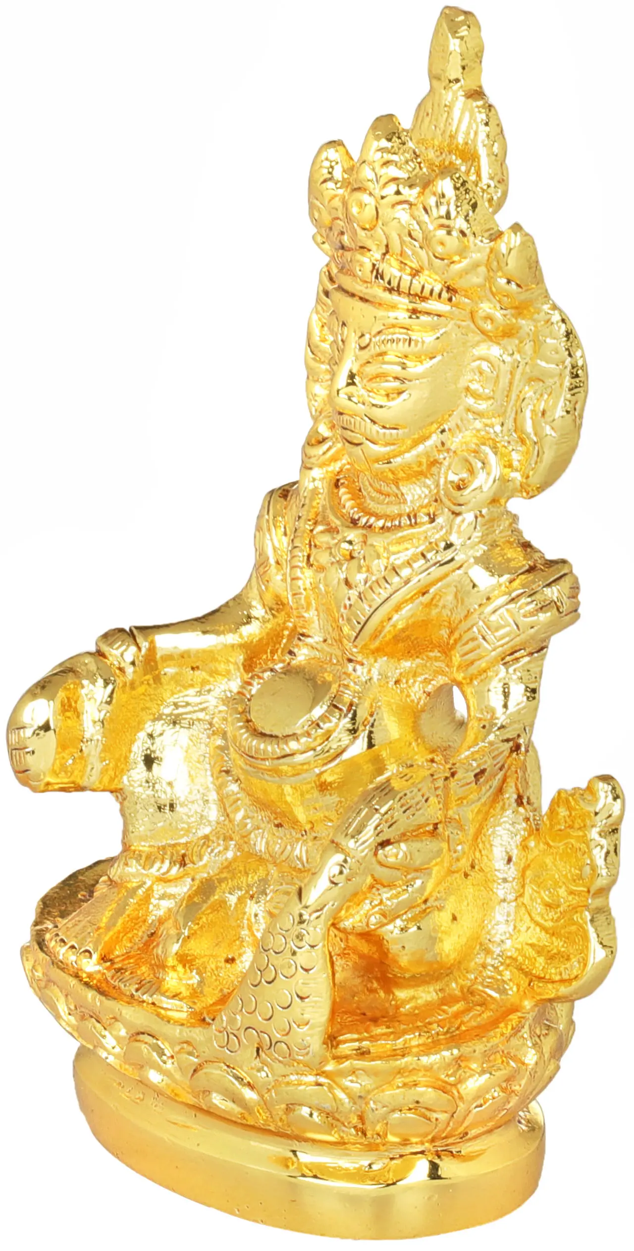 This statue showcases the artistry of skilled craftsmen who have brought Lord Kubera to life in gleaming brass. Every element, from the majestic crown adorning his head to the serene expression on his face, is rendered with precision and devotion. The rich, golden hue of the brass enhances the divine aura of the deity, reflecting the precious nature of the wealth he governs. The detailed ornamentation and graceful posture make this a piece of art that is as aesthetically pleasing as it is spiritually significant. Its compact size makes it ideal for placement on altars, study desks, or as a thoughtful gift.