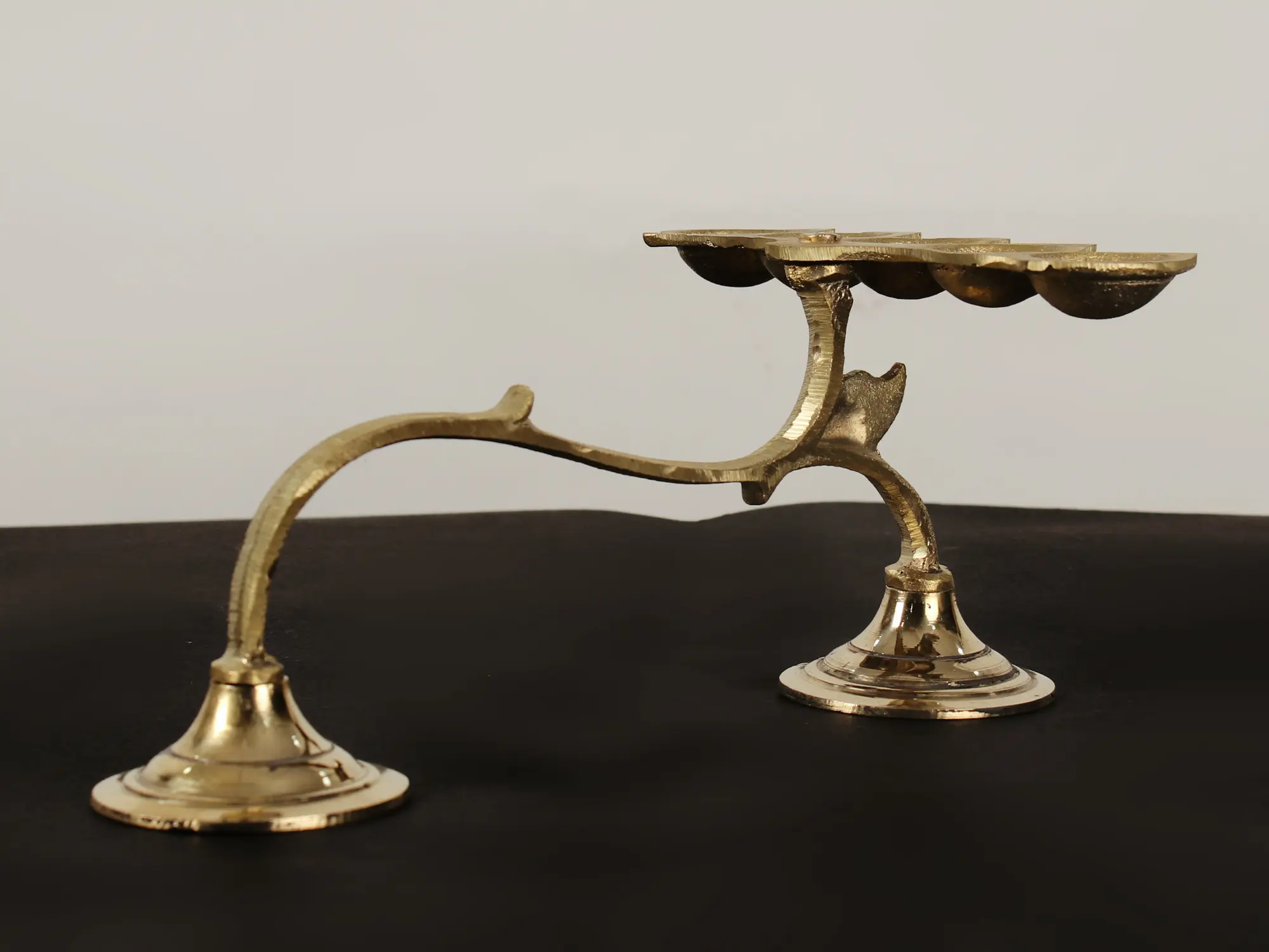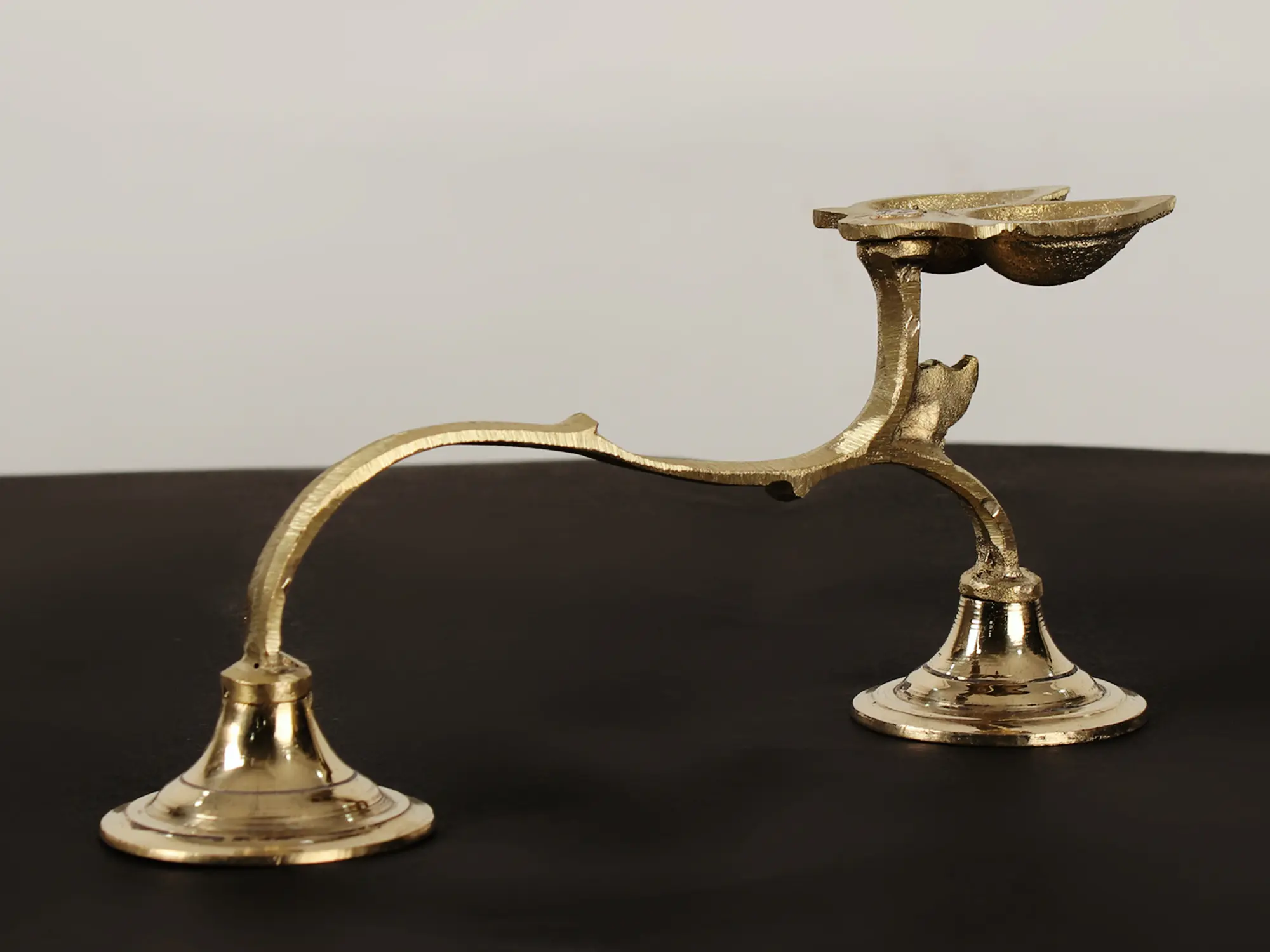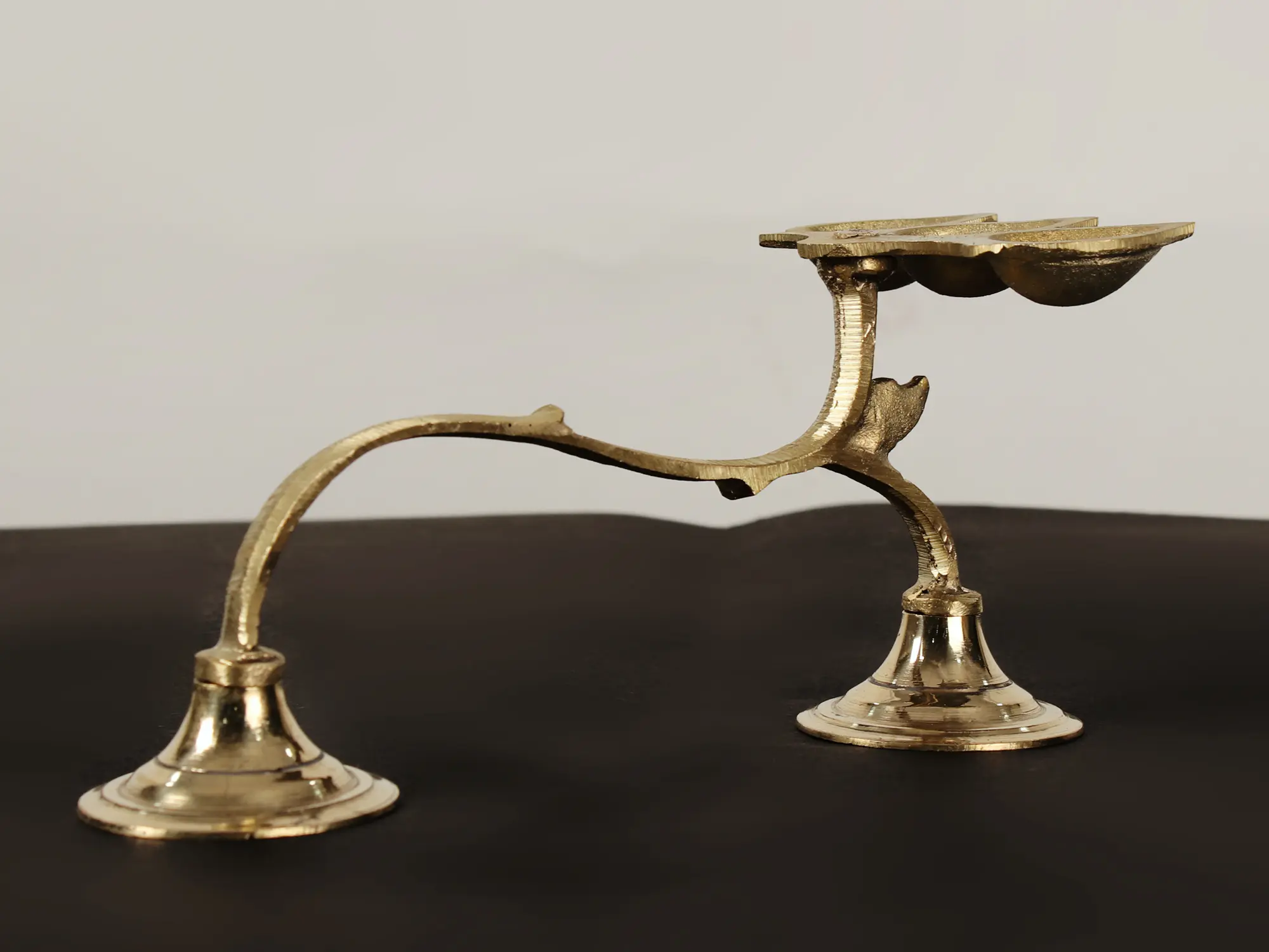 This single-wick handheld lamp is a simple yet stunning brass Diya symbolizing the road from darkness to light. The lamp, with its basic body and solitary wick, is the most traditional type and is the best way to start daily devotional practice. It comes with a handle and an elevated stand with two legs, atypical for Aarti Diya’s. It contains a shallow oil basin and can be used for Camphor Aarti as well. Adding this Diya to the daily rituals of offering fire to the deities will bring their blessings.