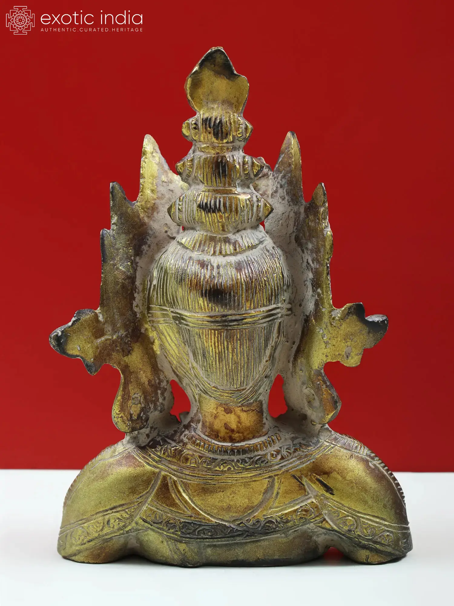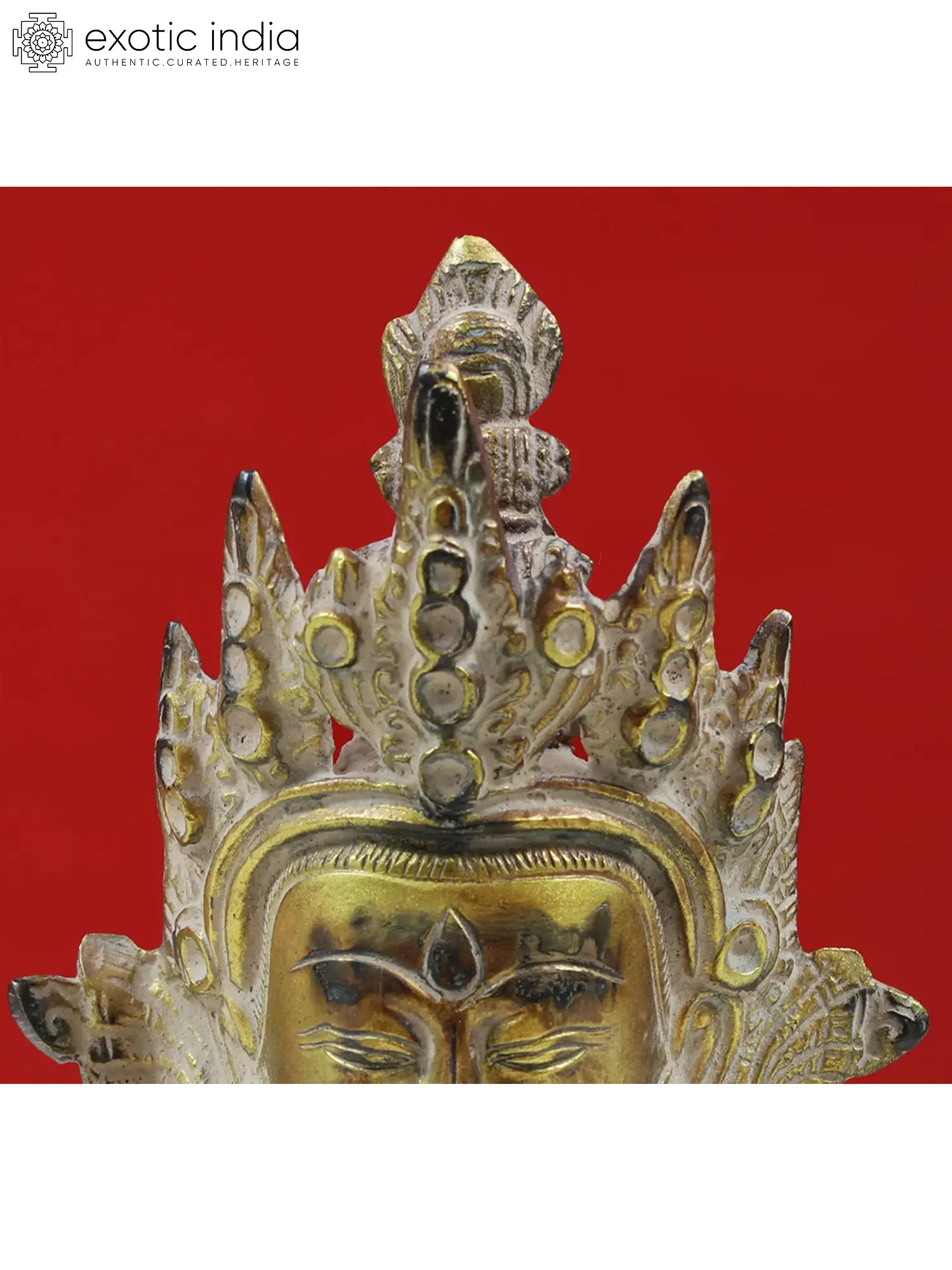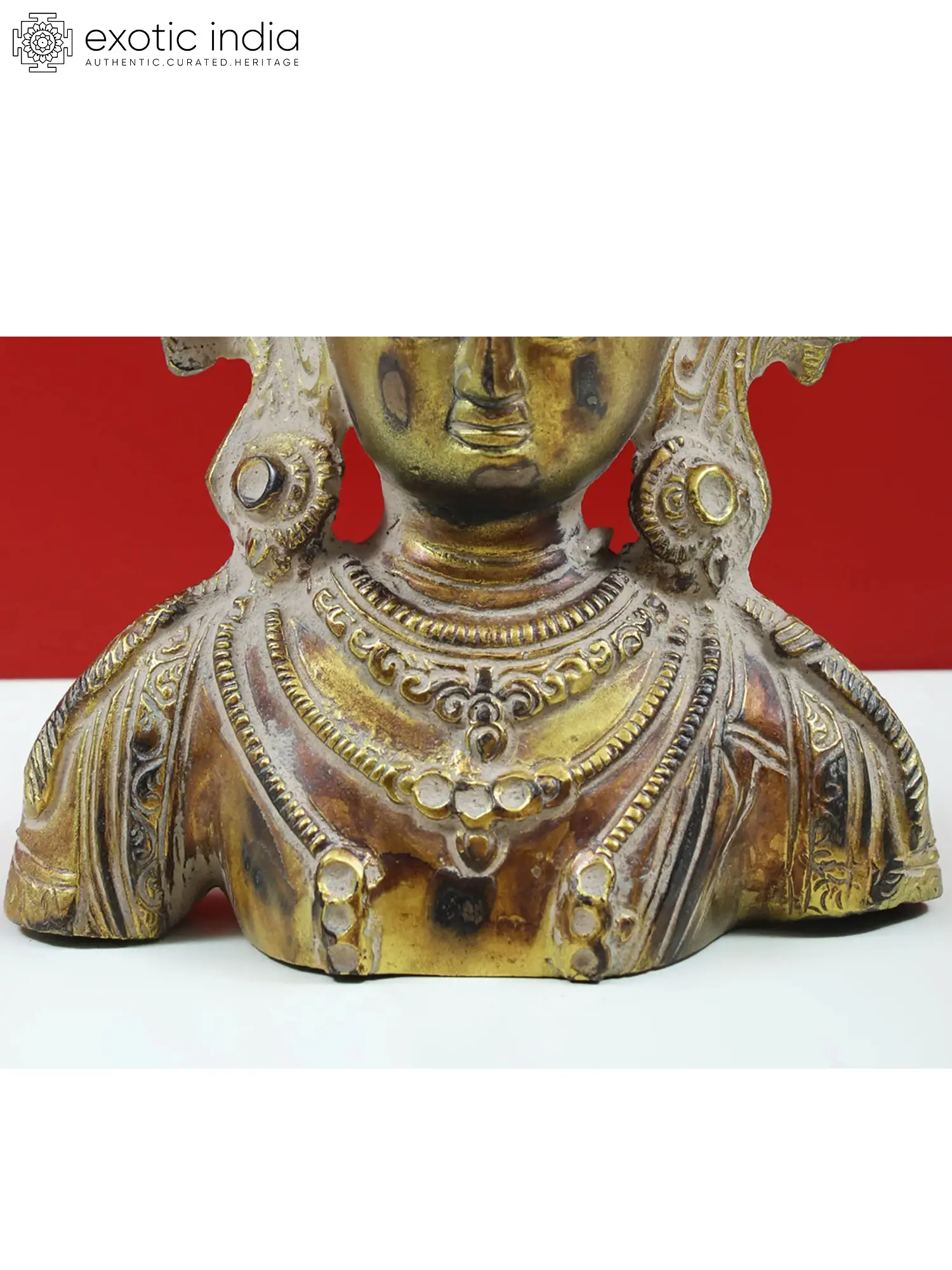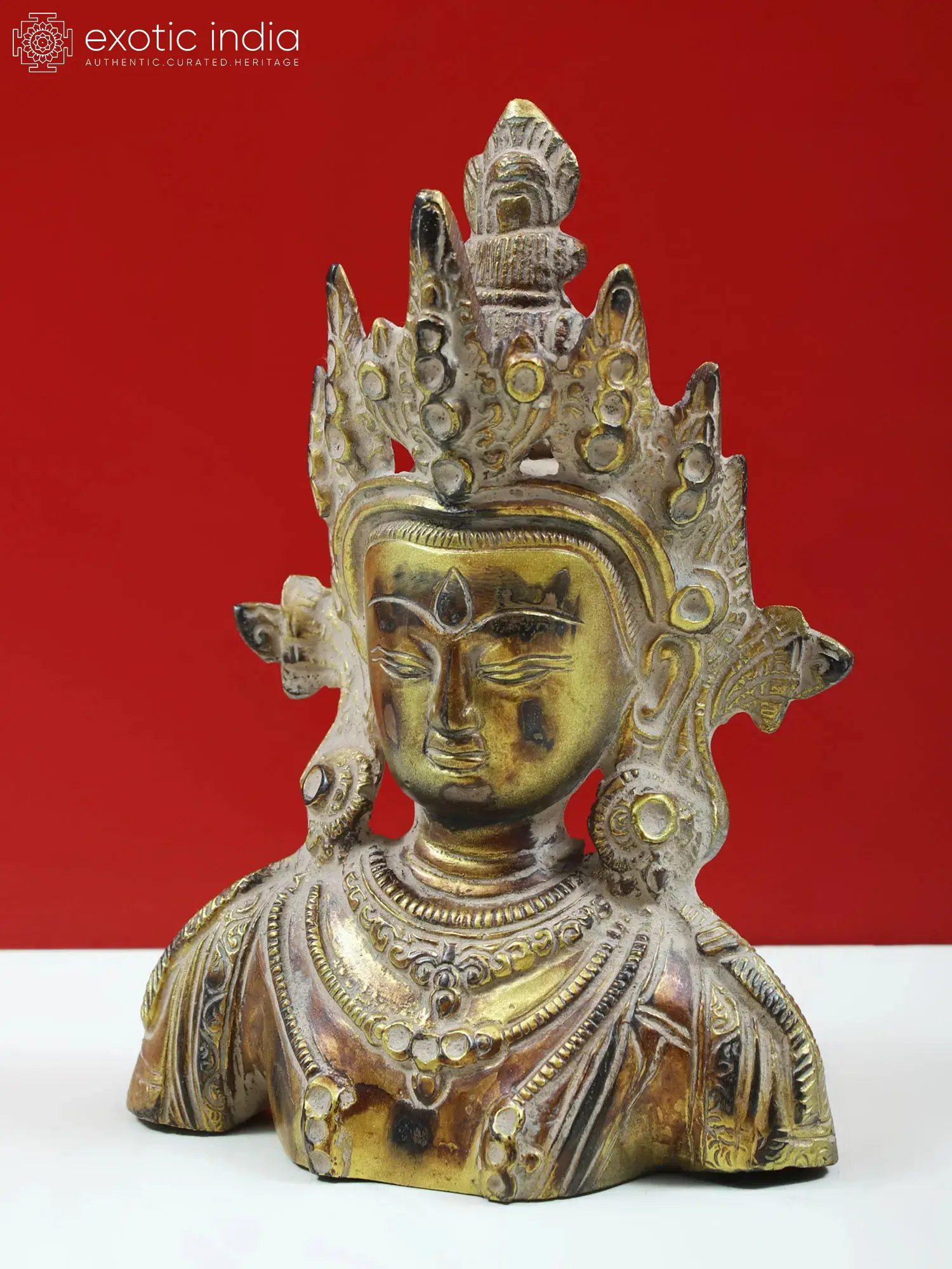The compassionate aura of Bodhisattva Avalokiteshvara is condensed in pure brass in this small bust, adorned with a five-pronged crown and exquisite ornaments. The countenance of Avalokiteshvara is animated by a gentle smile and meditative eyes, infusing the ambiance with a mystical air.