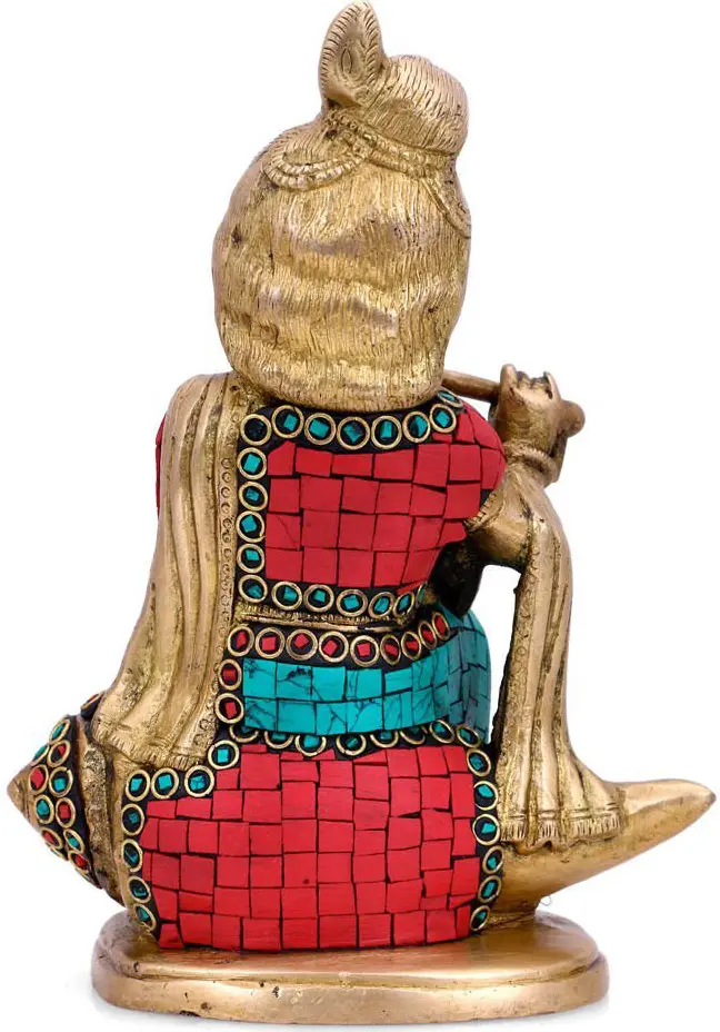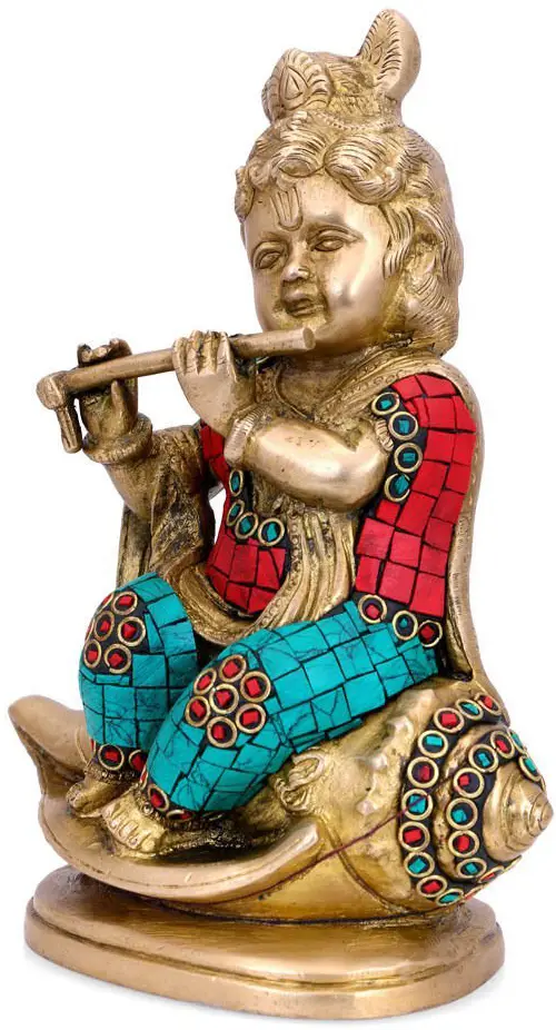The figurine is further elevated by the vibrant inlay work that adorns Krishna's garments and headdresses. Striking turquoise and ruby-red stones are meticulously set into the brass, creating a mesmerizing mosaic that accentuates the divine beauty of the deity. This color palette is deeply symbolic in Indian culture, with turquoise representing protection and wisdom, and red signifying passion and auspiciousness. The conch shell, upon which Krishna is seated, is not merely a decorative element but a powerful emblem. In Hindu mythology, the conch, known as "shankha," is blown to announce victory, ward off evil, and invoke blessings. Lord Vishnu, Krishna's original form, is often depicted holding a conch, symbolizing his dominion over the cosmos.