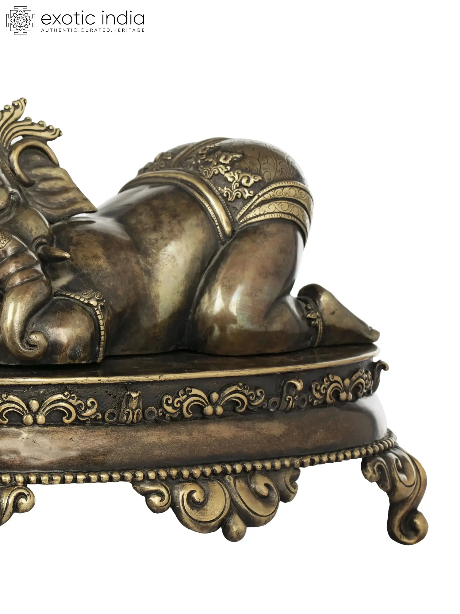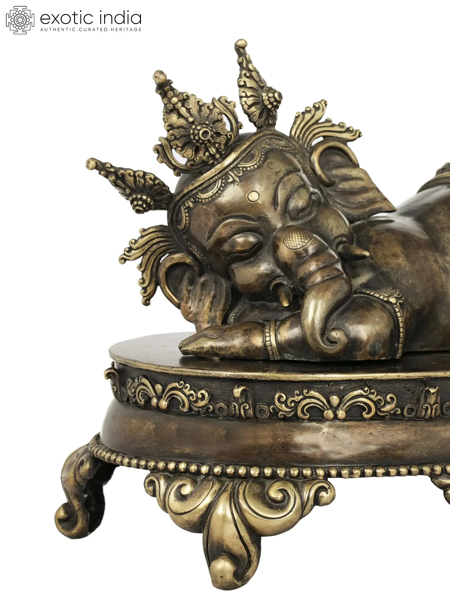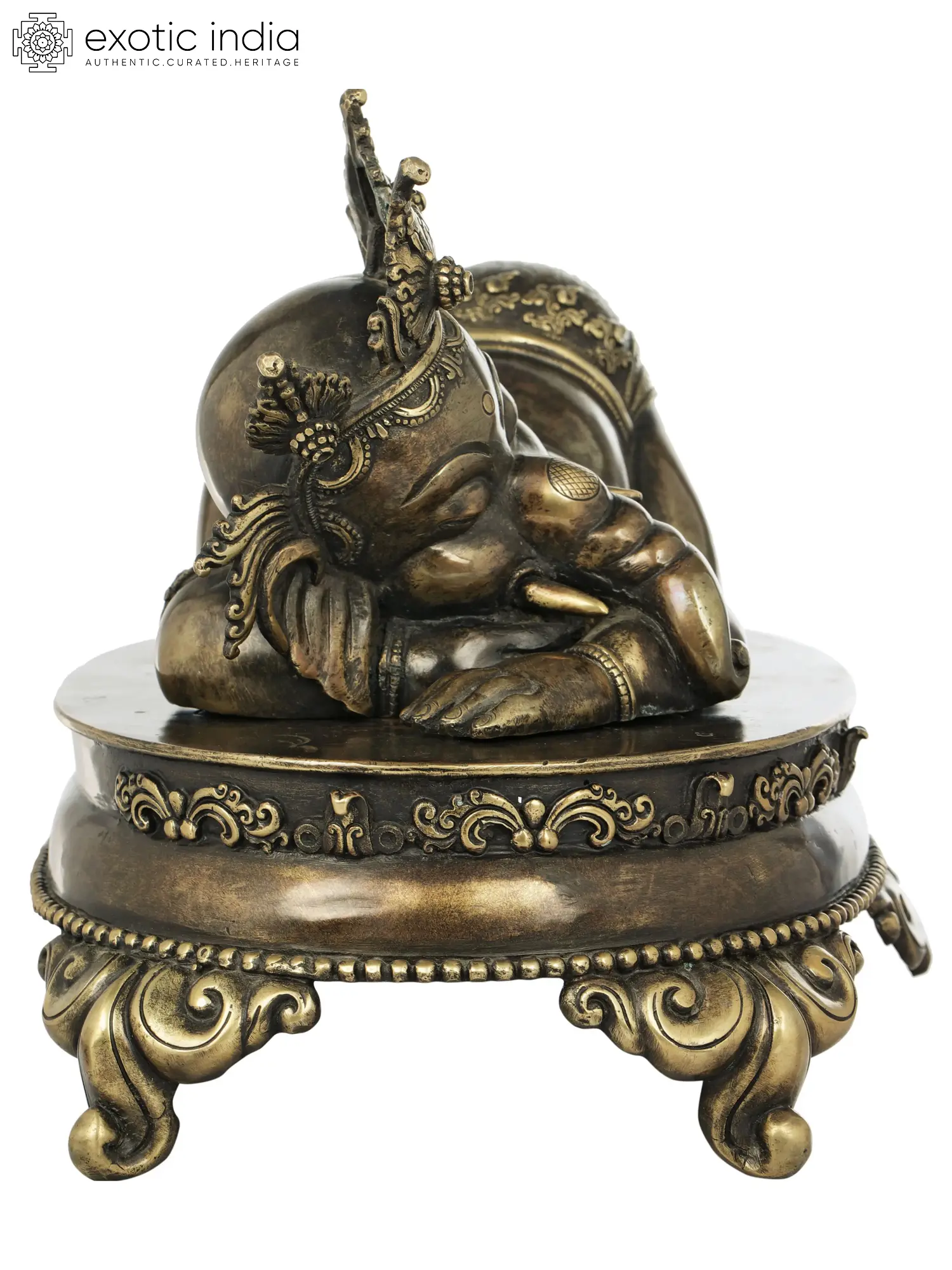Bundled up on an ornate chowki (pedestal) the elephant-faced Hindu god, Lord Ganesha in this Nepalese statute is a heart-warming symbol of divinity. The chowki which becomes the bed for a napping Ganesha, has been decorated beautifully, as the perfect space for the heavenly son of Shiva and Parvati. With his eyes gently closed, hands resting on his side, and legs folded under his belly to create a pleasant image, Ganesha exudes a childlike innocence with his presence in this copper statue. A fine dhoti, delicate ornaments, and a traditional Nepalese crown with five prongs and lovely tassels adorn the baby Ganesha.