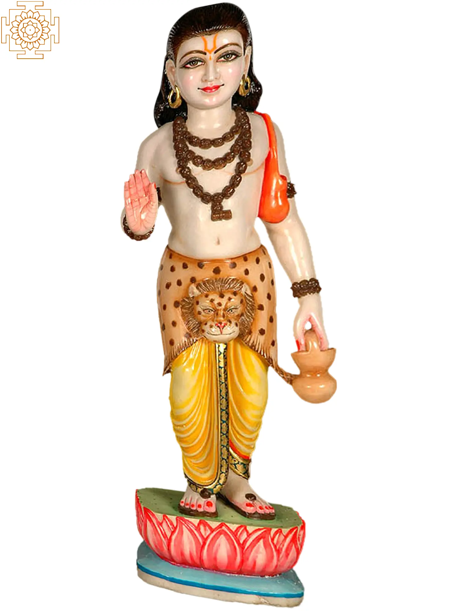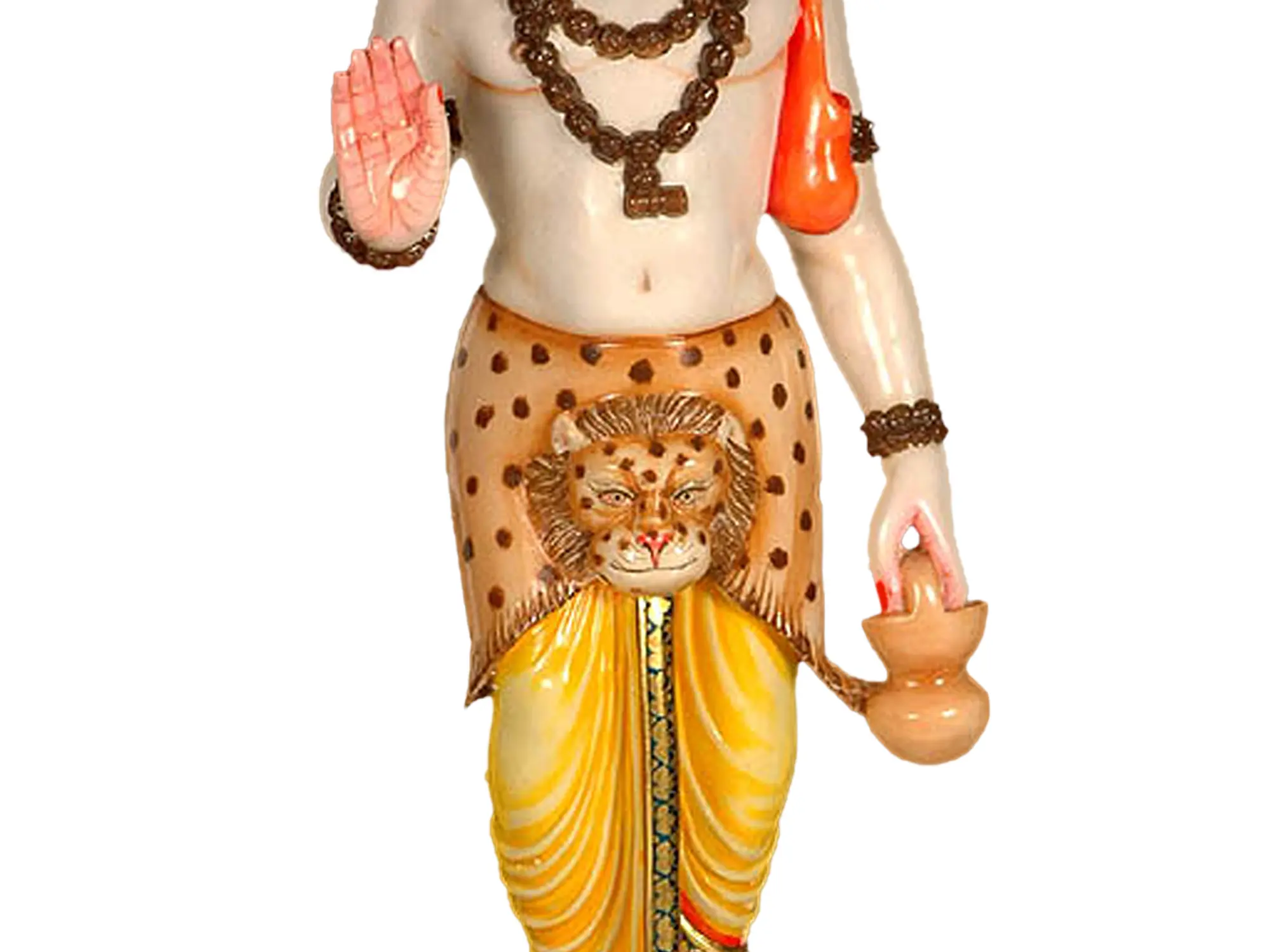 The figure is depicted with a gentle countenance and a raised hand in the "abhaya mudra", a gesture of reassurance, protection, and fearlessness. The flowing garments, including the striking leopard skin detail, are symbolic of mastery over nature and the animalistic instincts within. The "kamandalu," a water pot held in the left hand, signifies renunciation and the acceptance of a simple, ascetic life, a characteristic of many great yogis and spiritual seekers. The deity is adorned with necklaces, emphasizing his spiritual royalty, and stands on a lotus pedestal, representing purity, enlightenment, and spiritual awakening.