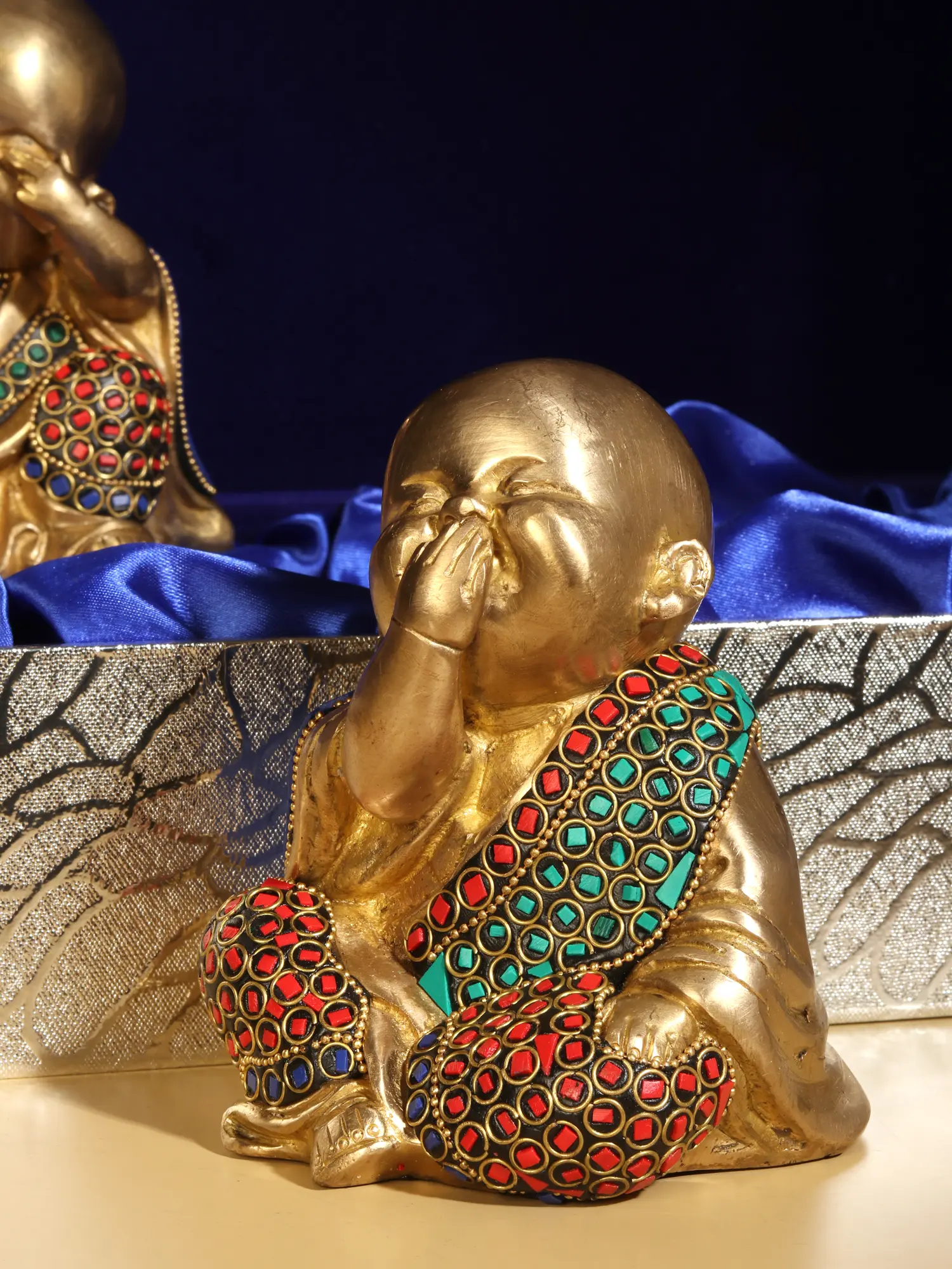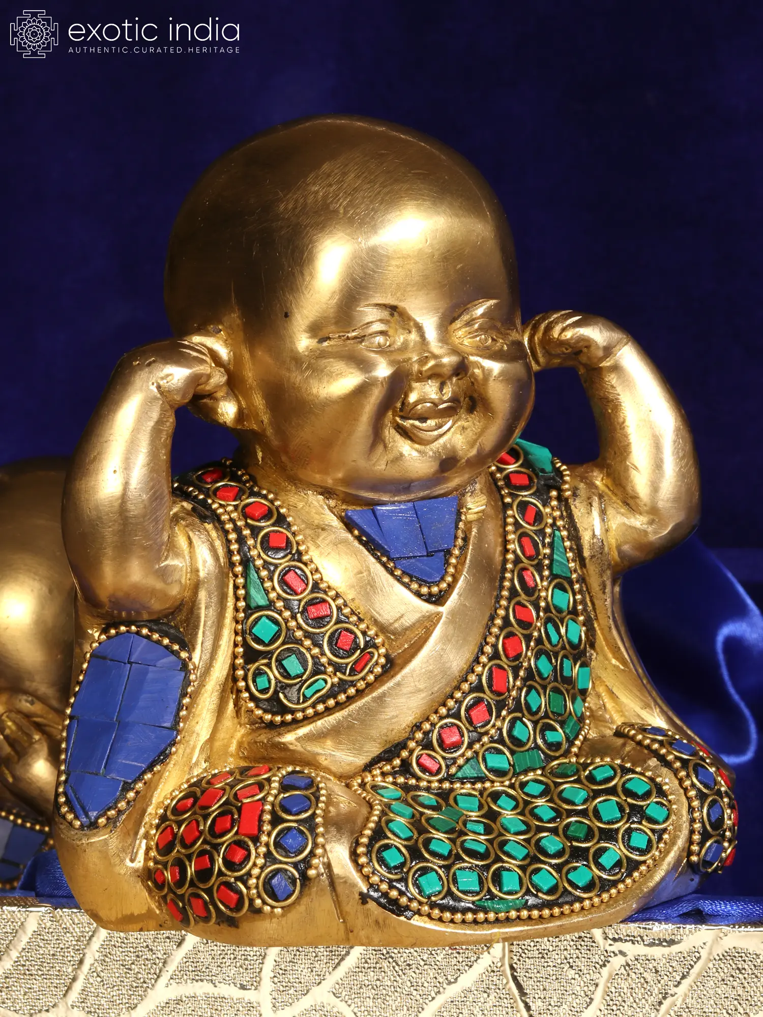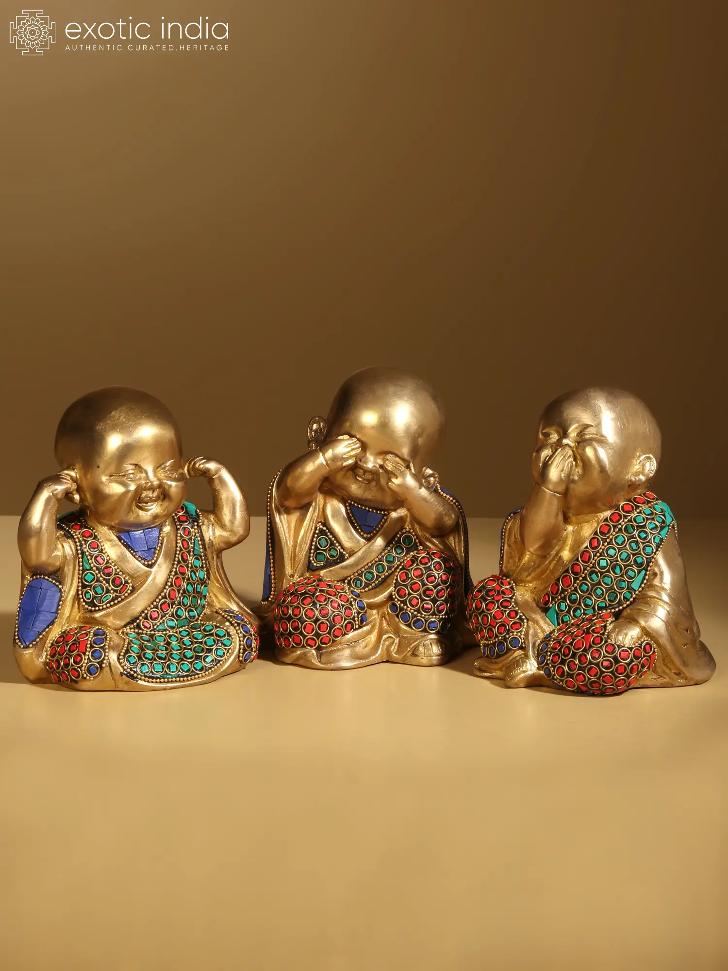 This Baby Laughing Buddha (Set of 3) is a delightful blend of art and joy, presenting adorable miniature Buddhas imparting the wisdom of "See No Evil, Speak No Evil, Hear No Evil." Crafted in Brass with Inlay Work and adorned with colorful stones, the states are beautifully embellished, with the cute little Buddhas wearing turquoise-colored stones.