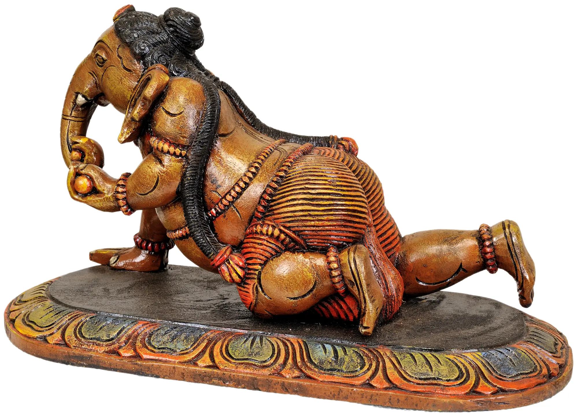 Originating from the skilled hands of South Indian artisans, this piece embodies the spiritual and artistic heritage of the region. South Indian temple carvings are renowned for their intricate details, vibrant colors, and the deep devotional spirit infused into each creation. Lord Ganesha, with his distinctive elephant head and pot-bellied physique, is often depicted in various forms, each carrying specific symbolic meanings. The Bala Ganesha form, as seen here, symbolizes purity, innocence, and the inherent potential for wisdom that resides within all beings, even in their earliest stages. The dynamic pose suggests an energetic and lively spirit, reflecting Ganesha's role in initiating new ventures and overcoming challenges with vigor.