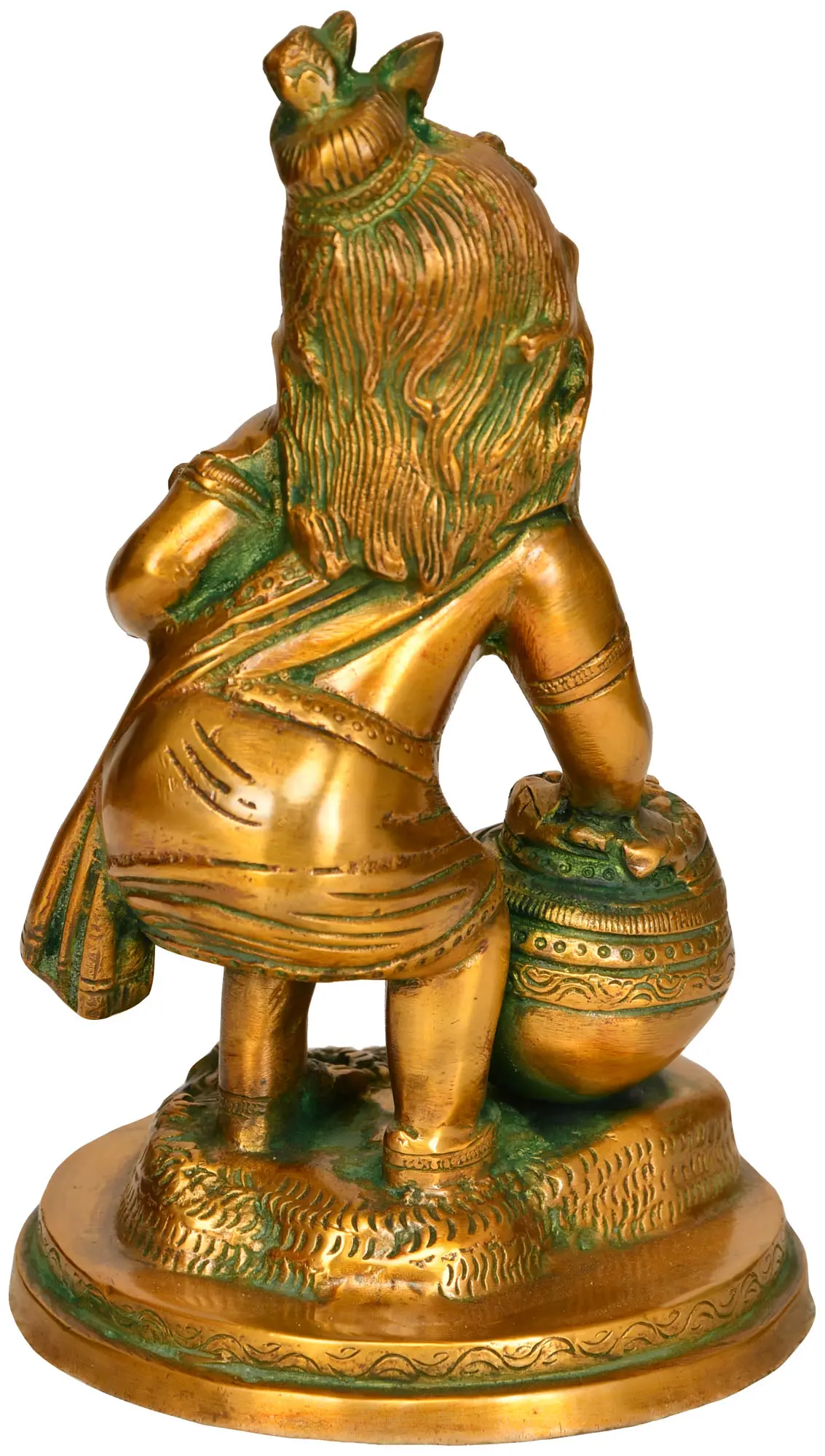 This exquisite brass statue captures the playful and beloved divine child, Krishna, in one of his most iconic forms: the butter thief. Cast with meticulous detail, the sculpture embodies the boundless energy and innocent charm of Lord Krishna during his childhood in the village of Vrindavan. The rich patina, a testament to its brass construction, highlights every curve and expression, bringing this divine depiction to life. The story of Krishna's childhood escapades is woven into the fabric of Hindu mythology, particularly in the Puranas and the Bhagavata Purana. As a mischievous child, Krishna, along with his friends, was renowned for his love of butter (makhan) and yogurt. He would often sneak into the homes of the Gopis (cowherd women), who churned butter daily, and steal their creamy, sweet treasures. These stories are not just tales of childlike naughtiness; they represent Krishna's divine nature and his ability to connect with his devotees on a deeply personal and relatable level. The Gopis, initially frustrated by their missing butter, would eventually find joy and devotion in Krishna's antics, understanding his playful interactions as a form of divine love.