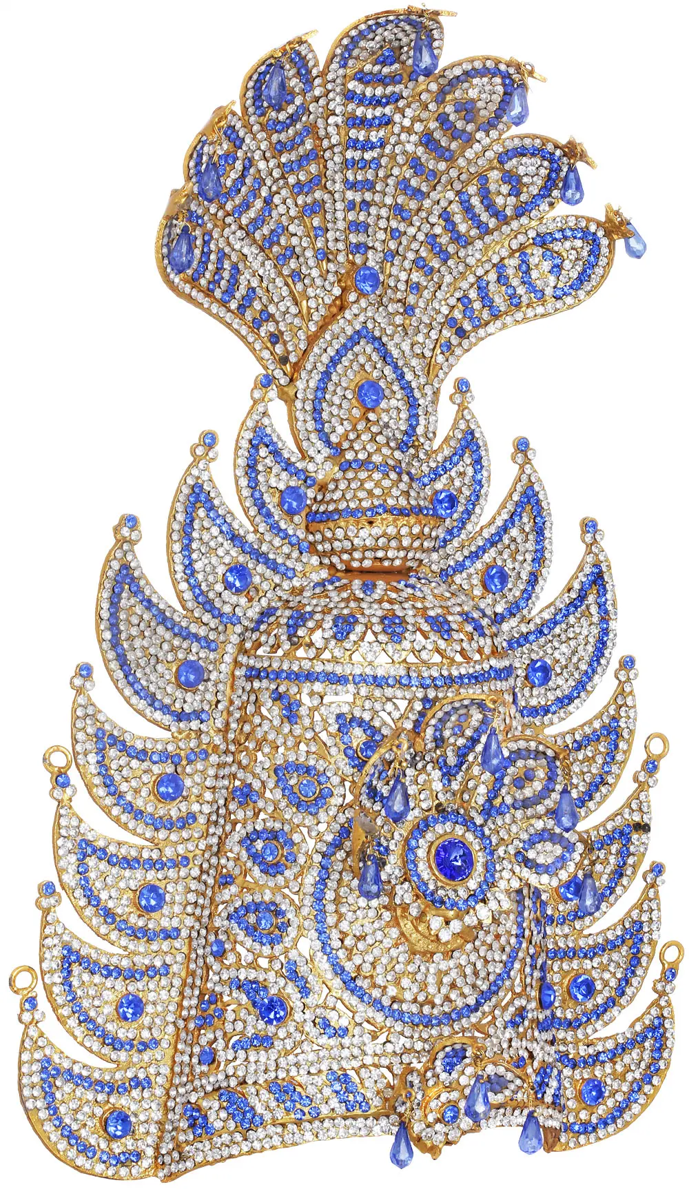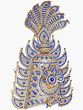 This stunningly intricate statue crafted from brass depicts a crown haloed with a seven-hooded serpent. The serpent protects the wearers and imbues them with awareness and power. The crown is studded with numerous blue stones where the blue colour represents the tranquility and compassion of the divine. The large blue stone in the middle of the crown coincides with the third eye. The halo of flaming light rays behind the crown represents the truth and is supposed to grant the wearer power to dispel the darkness.