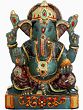 The thick rectangular pedestal is carved enchantingly with an orange shaded flower pattern from back and front with both sides bewitched with the figure of mouse, his sacred vehicle and also has artistic corners. This chaturbhuja portly figure has an awe-struck appearance with left hand carrying motichoor laddoo and right hand in a gesture of blessing (atharva Mudra). Rear hands hold one lotus each as a symbol of happiness, purity and regeneration. He wears a wine colored pleated dhoti having equally distributed flowers all over, golden piping and jewel like ornamentation on the knees. Scarf hanging down, covering the shoulders has beautiful white and orange dot motifs. Elephant ears are very precisely shaped and have orange brown scores; trunk ornamented like a sleek feather is complementing with Ganesha’s long, heavy and a stylized pendant neckpiece. Red and green stones flecked, supplement the natural golden colored crown with a small conical top. Shaivite tilak glorifies on the forehead with a big halo at the back, golden bordered, forming a blooming flower rangoli; white and red colored janeu accessorize along with other exquisite anklets, big bracelets and armlets.