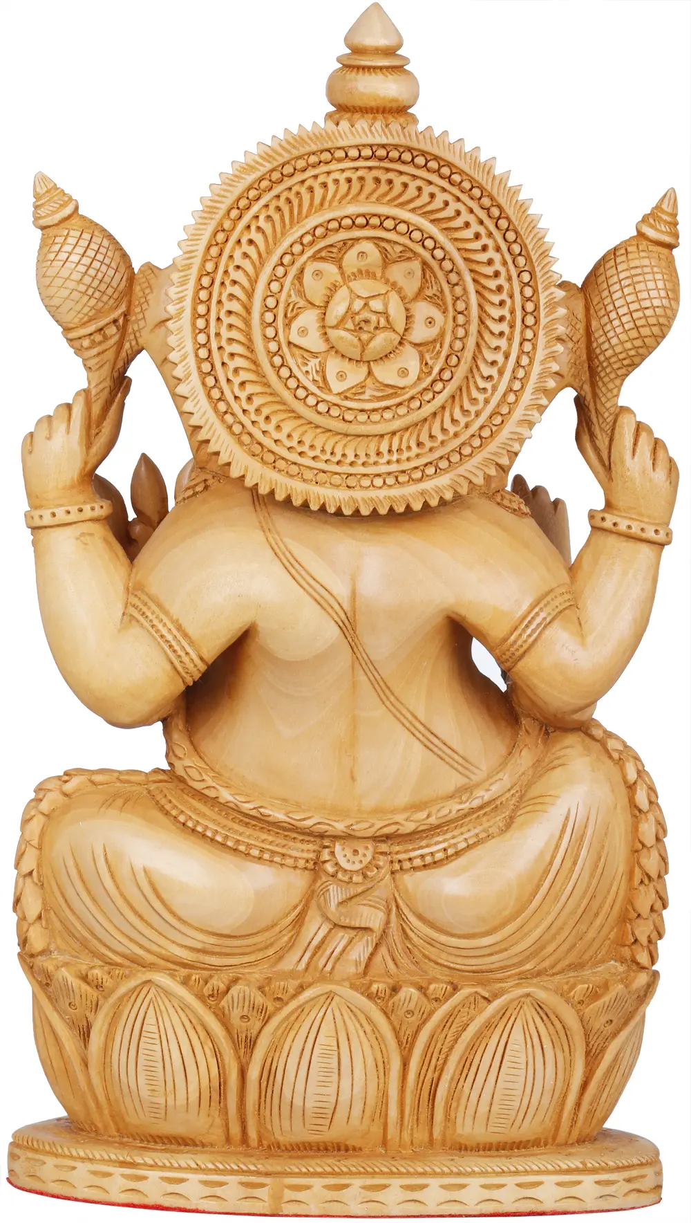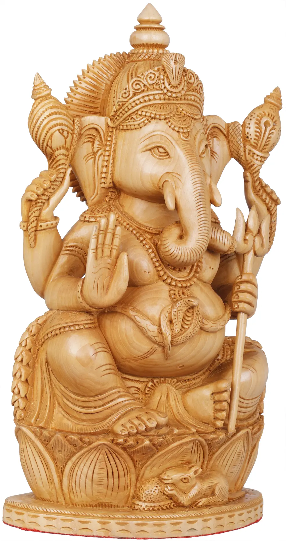 Wood carving is one of the important arts of Jaipur. Lord Ganesha is the foremost worshipped deity, before any puja or festival in Hindu religion. This wooden Ganesha sculpture sits on a pleasing lotus throne in his usual posture and eats a laddoo carried by the stylistically folded trunk with the dhoti tied below his navel and falls down till the ankle. It also depicts his faithful mooshak enjoying the taste of the mesmerizing laddoos.