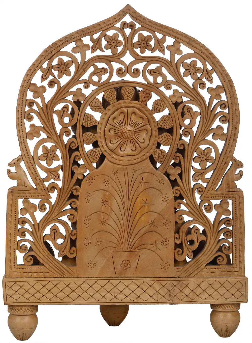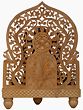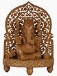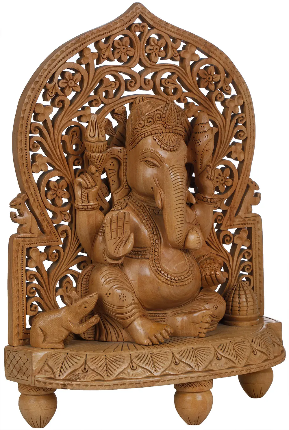 Have a look at this beautiful portly figure of the friendly god Ganesha, seated in his absolute comfort and royalty on an ethnically carved throne, supported by three small closed lotus bud shaped legs and a wooden pedestal carved in lotus petals from front. He in his usual posture, blesses the devotees of fearlessness by the abhaya mudra gesture of left hand and right holds tight his favourite sweetmeat, laddoo. You will be mesmerized by the elaborate chisels of his weapons- axe and noose, that he holds in his rear hands.