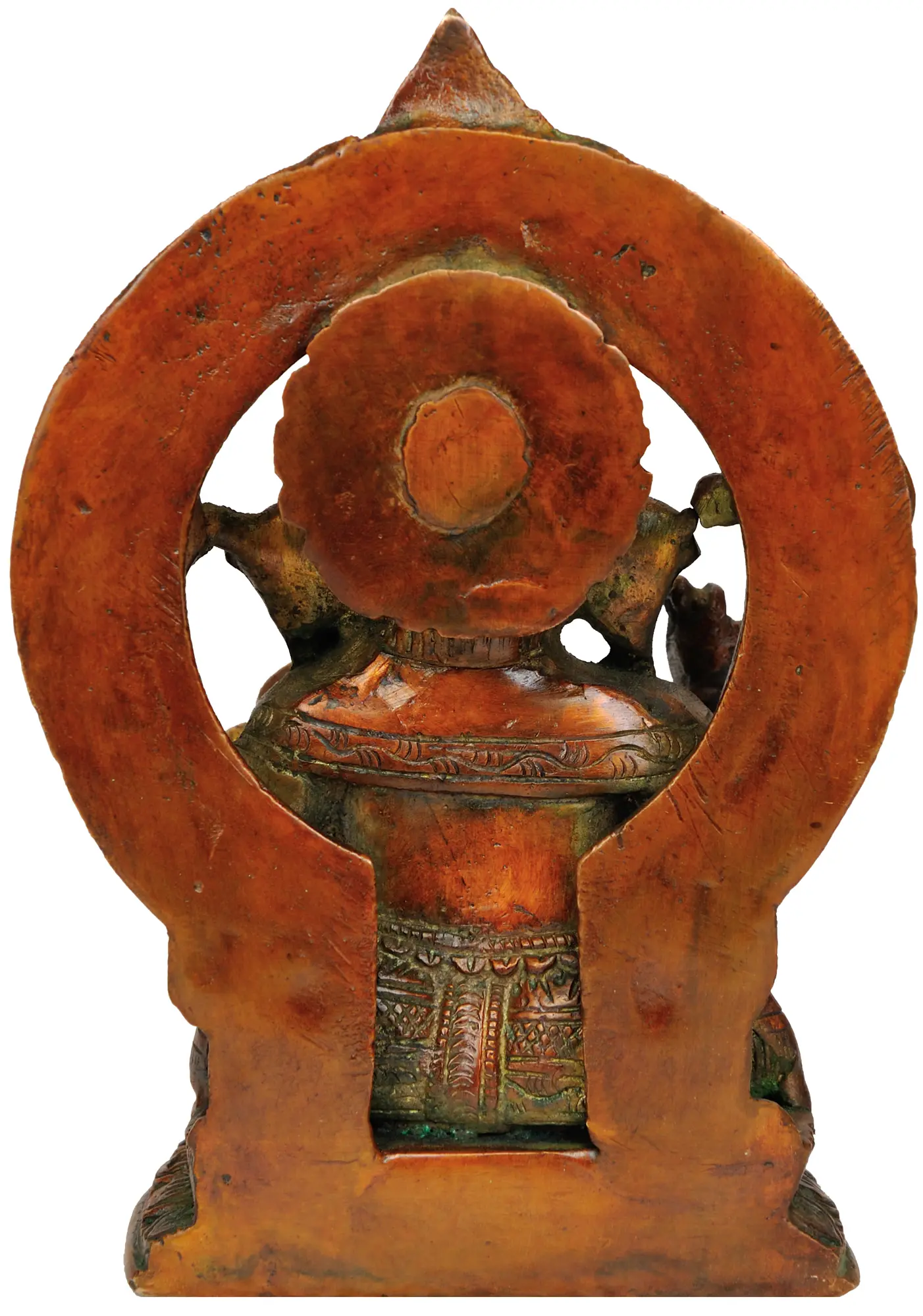 This striking brass statue is a testament to skilled artistry, with every detail meticulously rendered. The warm sheen of the brass, coupled with the subtle antiqued patina, bestows a timeless and sacred aura upon the idol. Lord Ganesha is adorned with traditional jewelry and his characteristic serene expression invites contemplation and peace. The elaborate prabhamandala, or halo, behind him, intricately carved with auspicious motifs, further enhances the divine grandeur of the piece, signifying cosmic energy and protection. The presence of his vahana, the humble mouse, often seen near his feet, symbolizes his mastery over desire and ego, reminding devotees that even the smallest can serve a great purpose. This statue is not merely an object of worship but a work of art that embodies deep spiritual significance and cultural heritage.