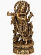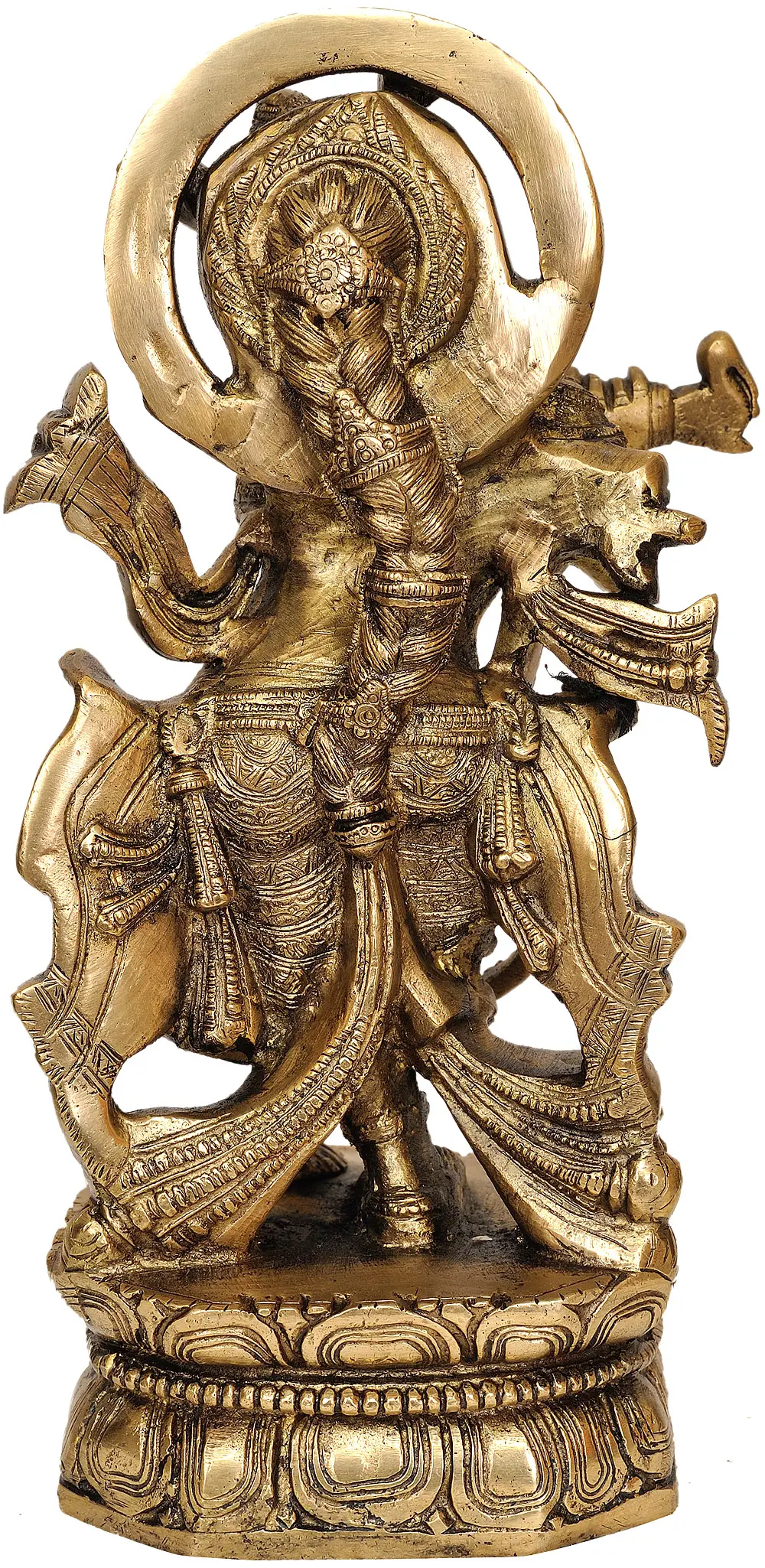 This exquisite brass statue captures the very essence of Bhagawan Krishna, the beloved deity known for his divine charm, mischievous spirit, and profound teachings. Crafted with meticulous detail, the statue portrays Krishna in his iconic pose, flute raised to his lips, ready to conjure the soul-stirring melodies that captivated the hearts of both mortals and gods. The "choti," a prominent lock of hair, adds a distinctive characteristic, reflecting the affectionate portrayal of Krishna as a divine child and a charming youth. The artistry of this piece is a testament to ancient Indian craftsmanship. The rich, antique brass finish imbues the statue with a sense of timelessness and spiritual aura. Every curve, every fold of his garment, and the delicate features of his smiling face are rendered with remarkable precision. The intricate patterns adorning his attire, the flowing fabric, and the ornate jewelry speak of a divine being adorned in celestial splendor. The radiant halo behind his head symbolizes his divine presence and the light he brings to the world.