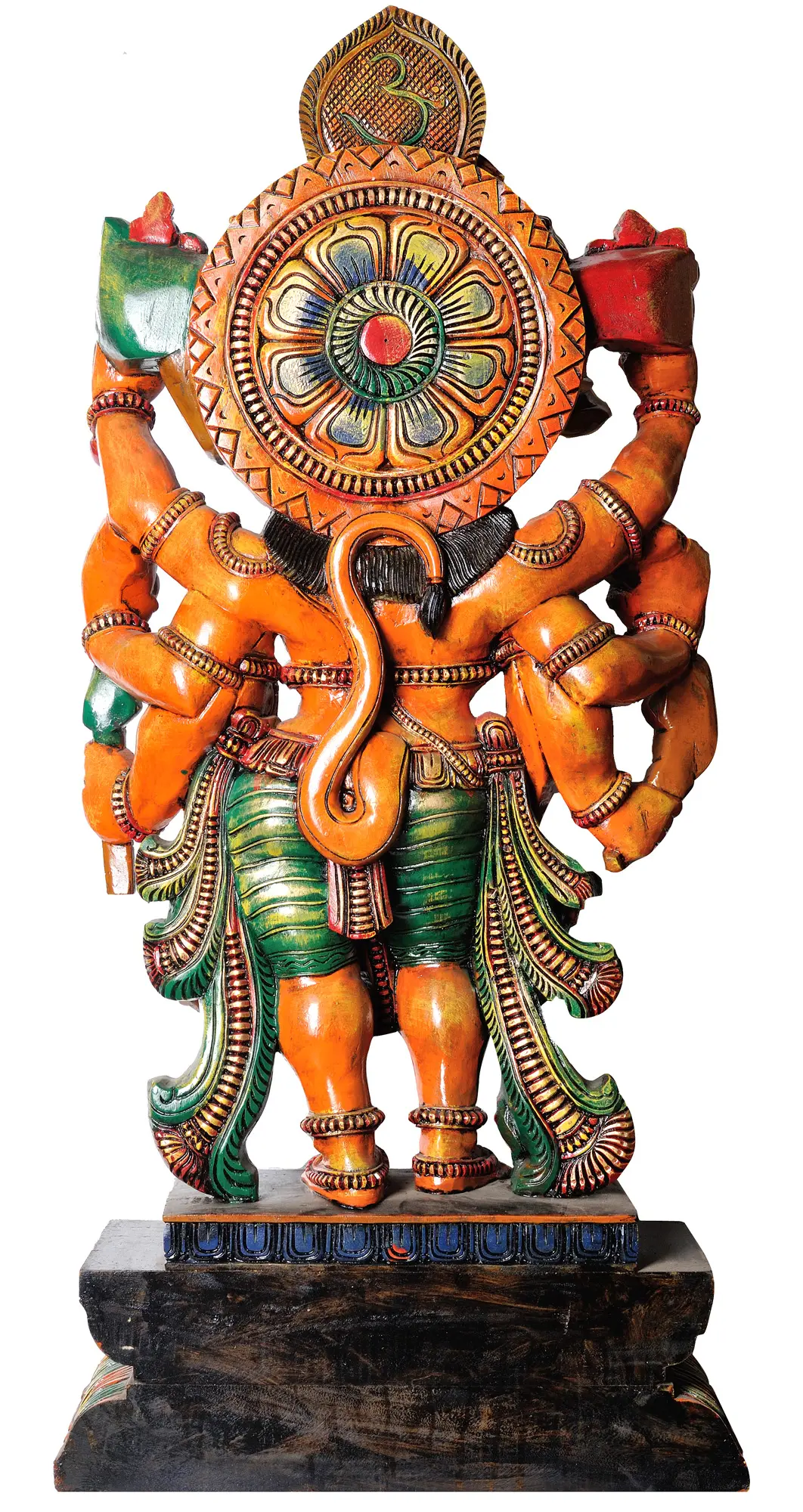 The artisans have masterfully carved this piece, imbuing it with spiritual significance and aesthetic beauty. The rich orange hue of Hanuman's body signifies vitality and courage, while the green and gold embellishments highlight the divine opulence and strength he commands. Each of his multiple arms holds symbolic weapons and objects, further emphasizing his diverse powers. The serene yet powerful expressions on each face are rendered with remarkable skill, capturing the divine essence of this multifaceted deity. The intricate detailing on the garments, the jewelry, and the decorative base showcases the traditional craftsmanship that has been passed down through generations. This South Indian temple wood carving is not merely a decorative item but a powerful conduit of divine energy and a reminder of the epic tales of Hanuman's bravery, loyalty, and devotion to Lord Rama, as narrated in the Ramayana. ––––––––––