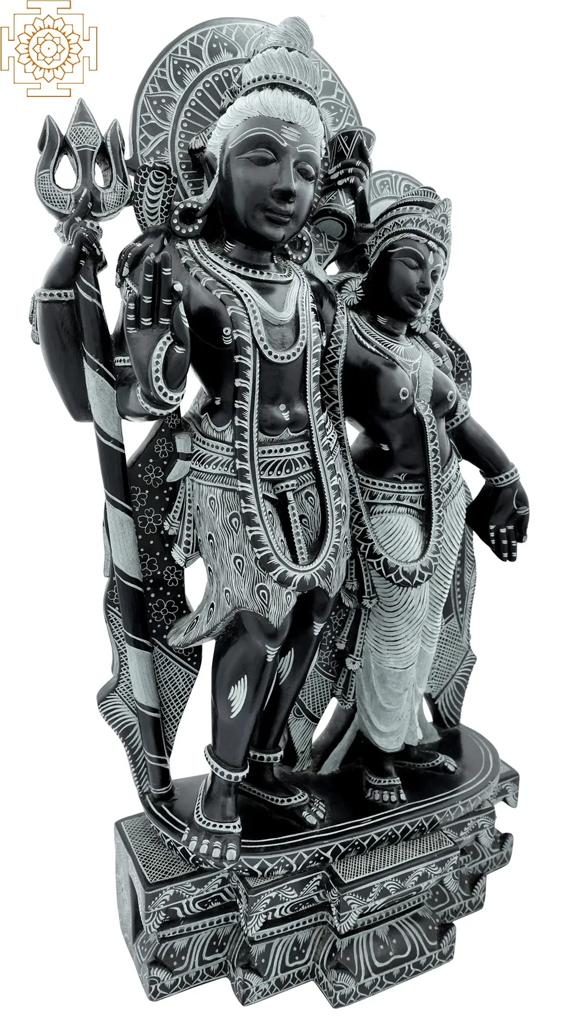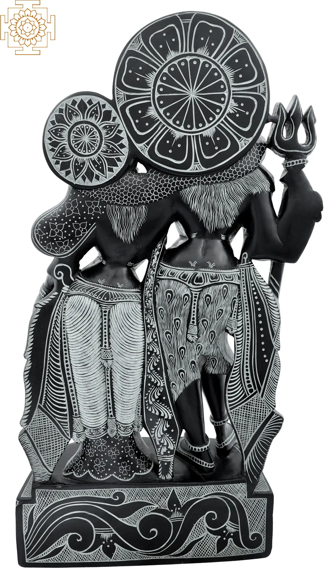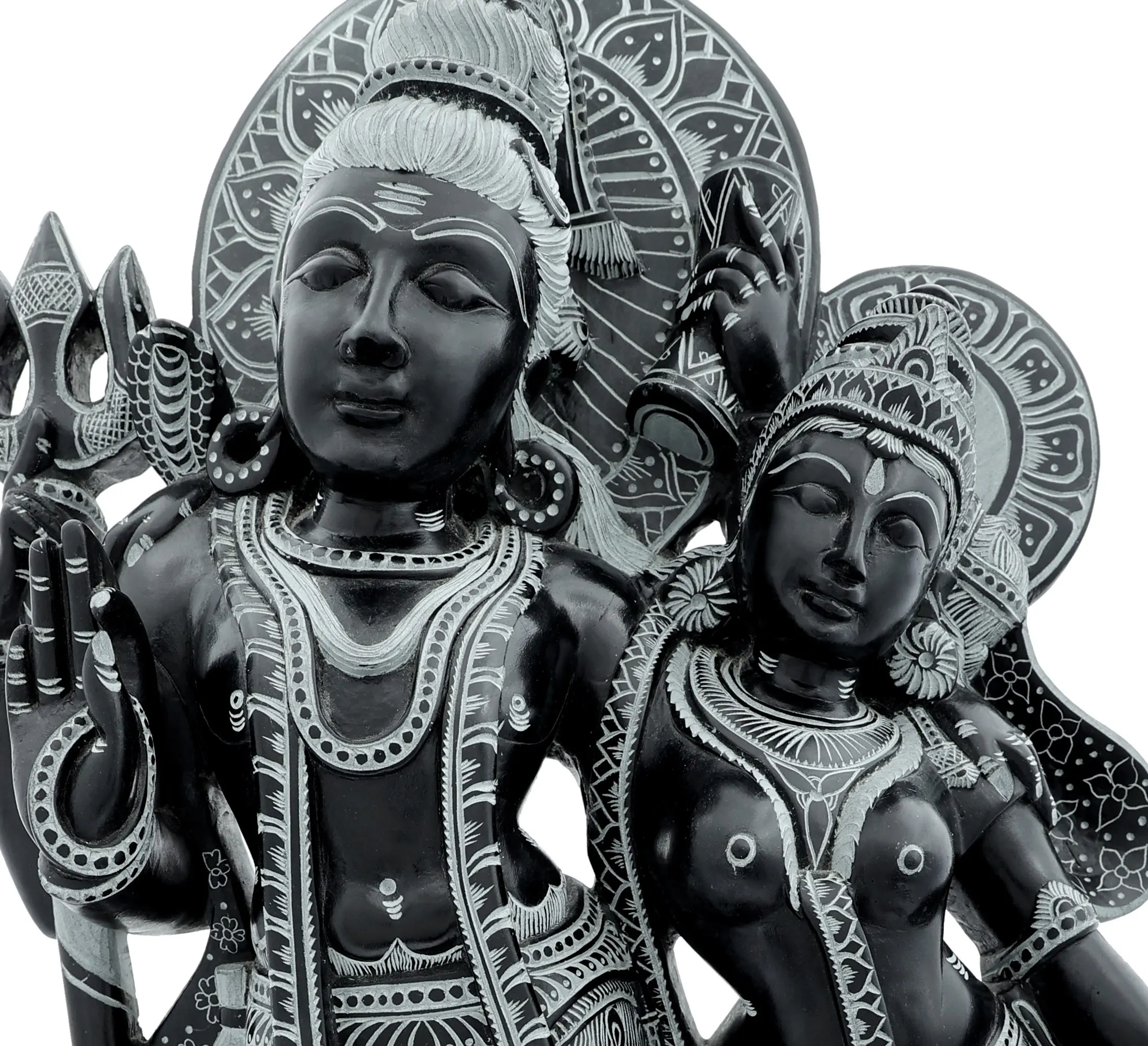 Just as heat cannot be separated from fire, and sunlight cannot be separated from the Sun, Lord Shiva and Goddess Parvati, the divine couple are inseparable. The transcendental and unborn Lord, being beyond time and death, would be nothing but a dead matter without His Shakti (the energy in motion). She is like the ocean full of waves, always in motion and Lord Shiva is a calm sea. Garlanded with a serpent, holding a Dumroo and a Trident, and wearing the Tiger skin stands an ascetic yogi and a great Grihasta with His wife, Goddess Parvati - depicting an eternal, unconditional, and uninterrupted loving relationship. The epitome of beauty and strength, Devi Parvati, is always in the mood of serving and worshipping Her Lord with love and devotion.
