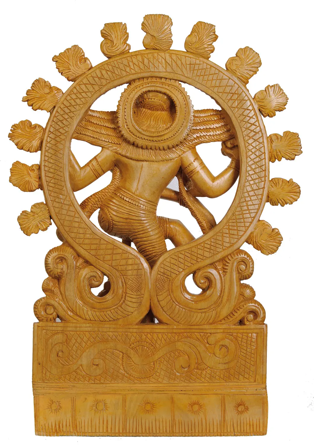 Behold the divine energy of Lord Shiva as Nataraja, the Lord of Dance, captured in this exquisite wood carving. Crafted from the finest White Cedar wood sourced from the lush region of Trivandrum in Kerala, this piece embodies centuries of artistic tradition and spiritual devotion. The rich, warm tones of the wood lend a natural elegance, while the intricate details showcase the masterful skill of the artisan. The Nataraja form is a profound depiction of Shiva's cosmic dance, the Tandava. This dance is not merely an artistic performance but a representation of the eternal cycle of creation, preservation, and destruction that governs the universe. Within the fiery halo, Shiva performs his dance, a pulsating rhythm that orchestrates the cosmos. His raised left foot symbolizes the release from worldly illusions, while the right foot crushes the demon Apasmara, representing ignorance and ego.