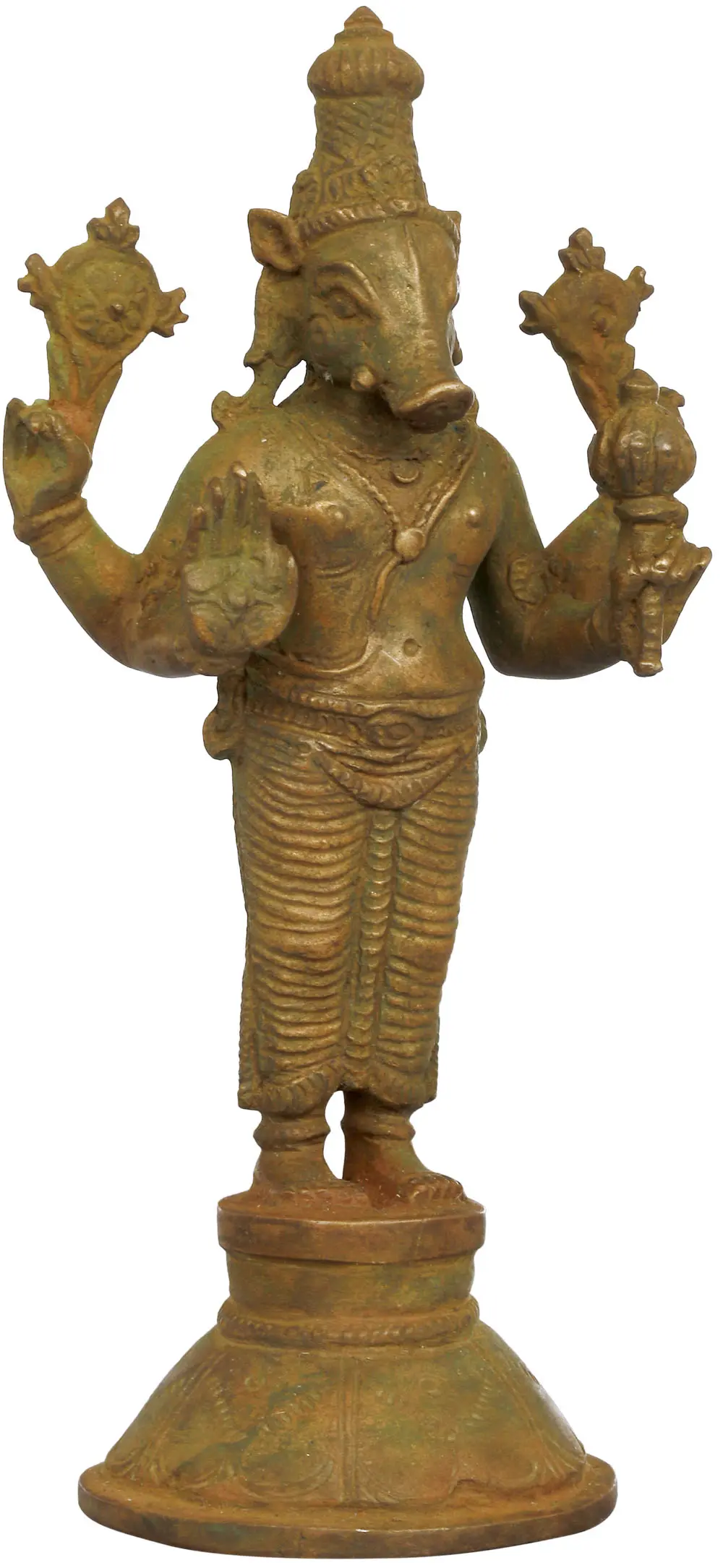 Wonderfully carved statute of Bhagwan varah in bronze from swami malai is in its full aesthetic visuals. Having a high-long coronet over the head of the bour mouthed face .the face with its huge nathune is something amazing & stunning. Depicted with four hands – holding a unique Gada (club) in one, an eye-catching Padma in second, a sankha-chakra in the third, and blessing with the fourth. A long tilak on forehead, long eyelets in both the ears, a sacred yagyopavit(janeue) until the waist-line, and a necklace in the neck.