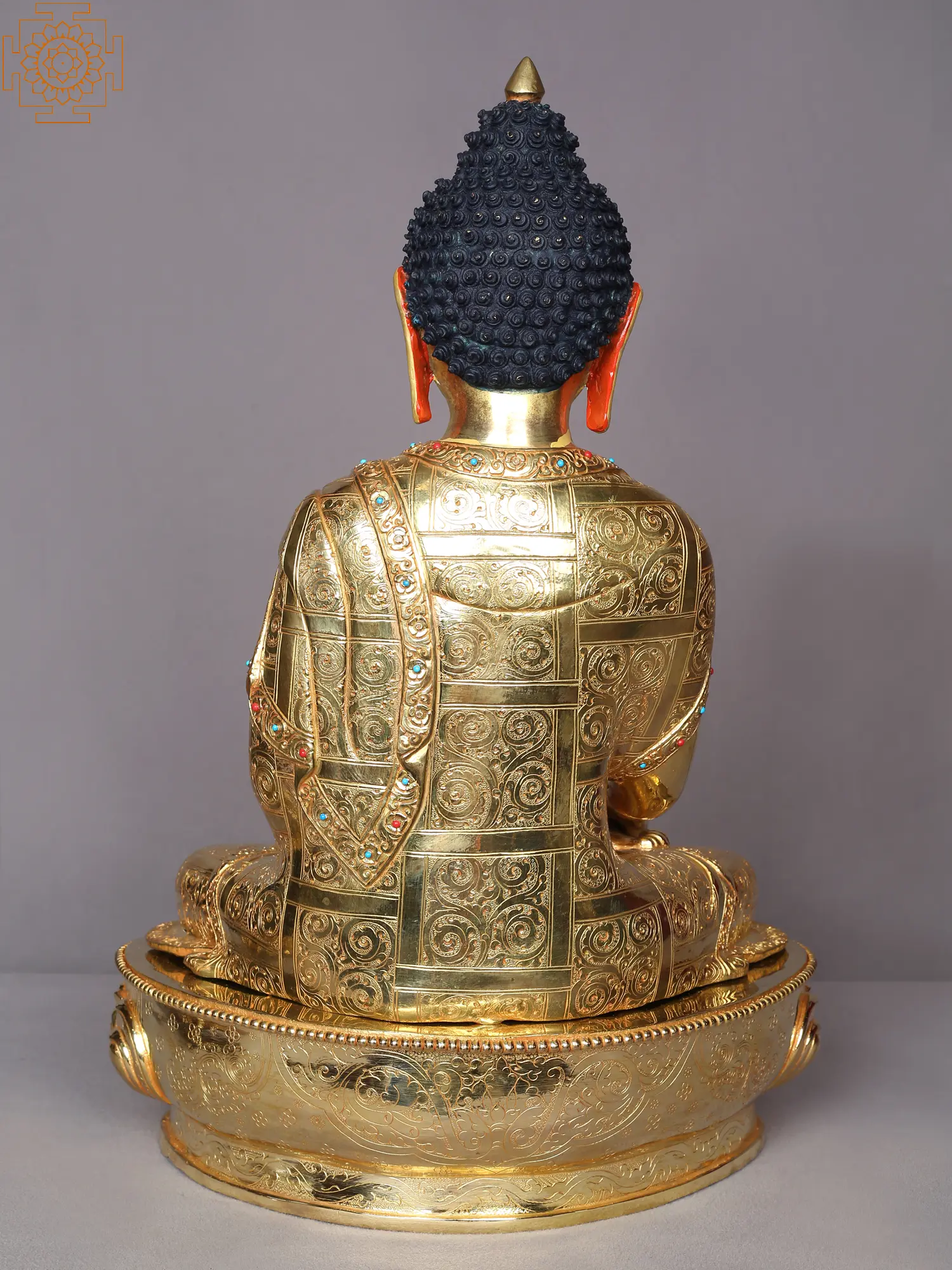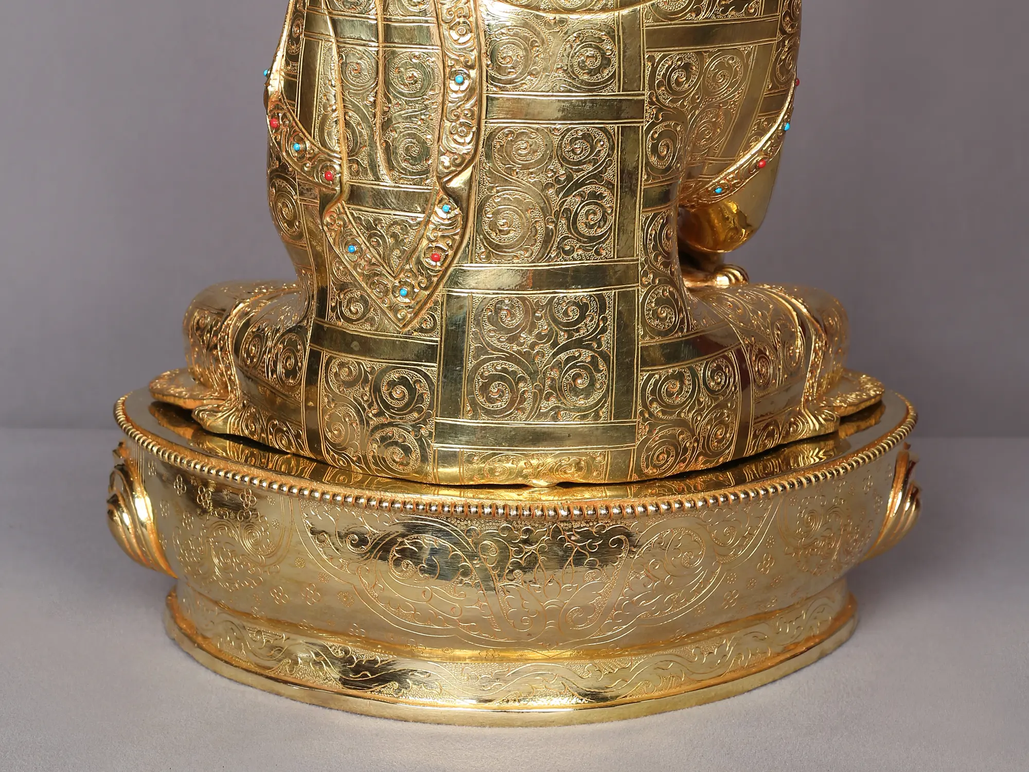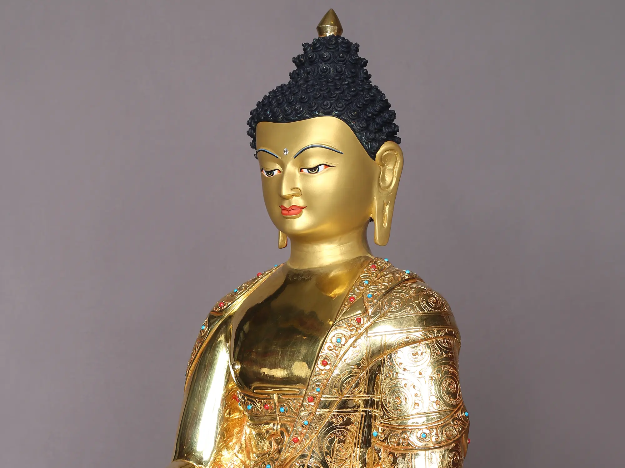 Smiling heavenly, Buddha Shakyamuni in this Nepalese gilded copper statue is the picture of supreme enlightenment. The folds of Buddha’s robe are exquisitely detailed by the sculptor, with each layer delineated perfectly and realistically. Creepers, the symbol of the origination of life are inscribed on Buddha’s robes, enhancing the aura of his form. Holding the begging bowl of monks in his hand placed in meditation, Buddha underlines abstinence and inner calm as the key to enlightenment in this glistening statue.