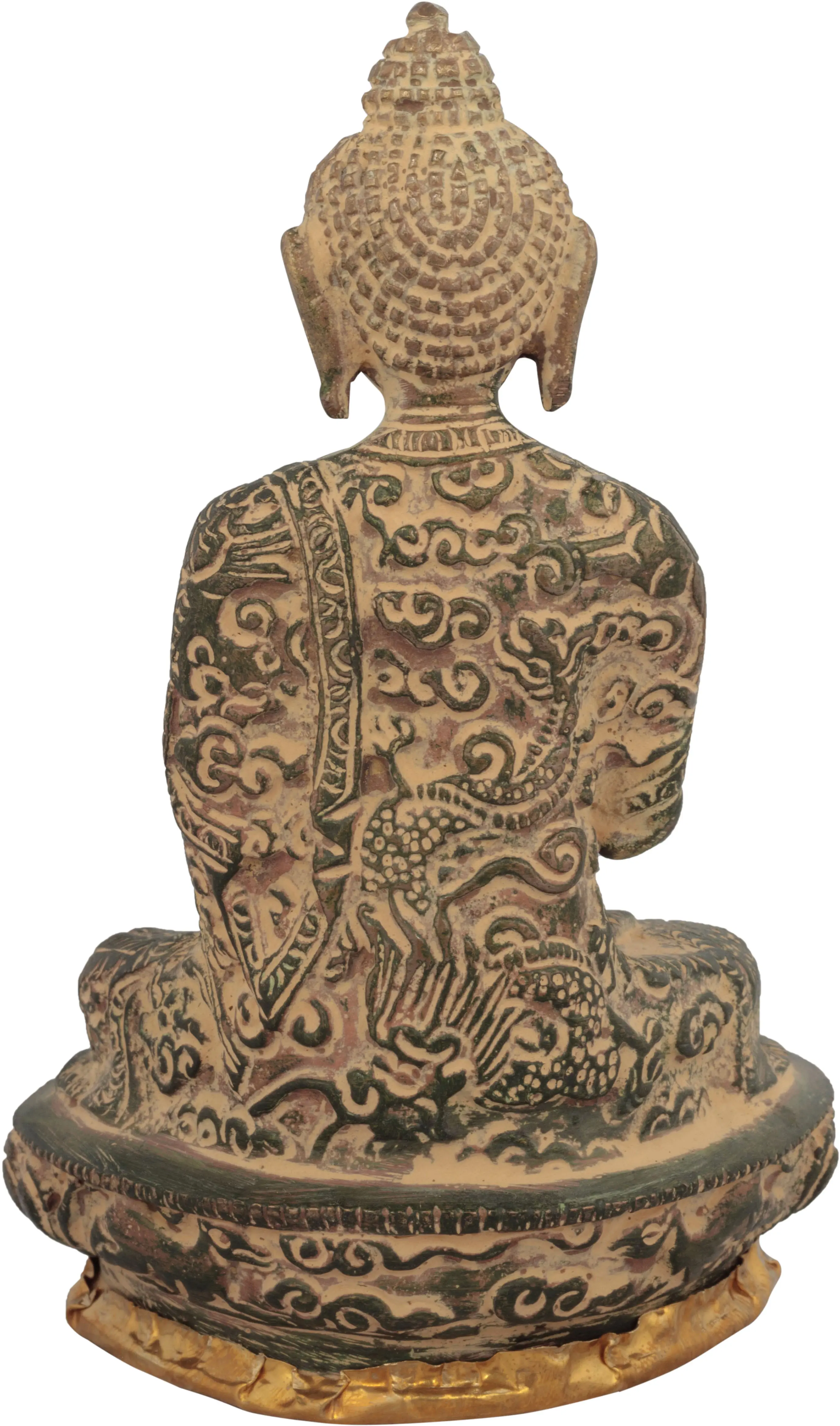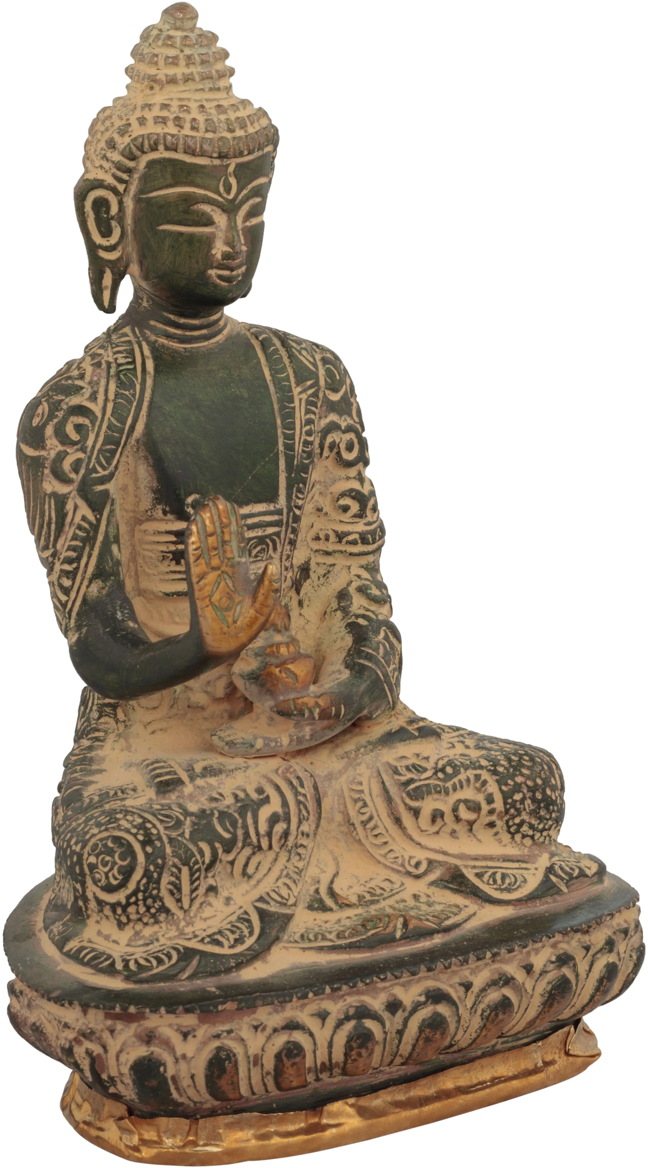 The intricate patterns adorning the robe are not merely decorative but often represent the vastness of the universe or the interconnectedness of all life. The hand gesture, known as the Abhaya Mudra, is a symbol of fearlessness and reassurance, signifying protection and the dispelling of worries. In Buddhist lore, the Buddha's teachings are said to have brought solace to countless individuals, guiding them away from suffering and towards a state of liberation. This statue serves as a tangible reminder of these timeless principles, encouraging mindfulness and a peaceful disposition. The application of green and golden hues adds a sense of antiquity and reverence, reminiscent of ancient Buddhist art found in monasteries nestled in the Himalayas. The weathered patina tells a story, suggesting the passage of time and the enduring legacy of the Buddha's message.