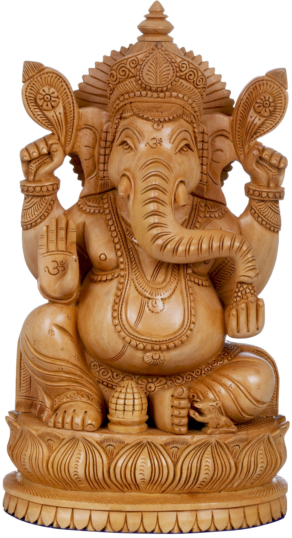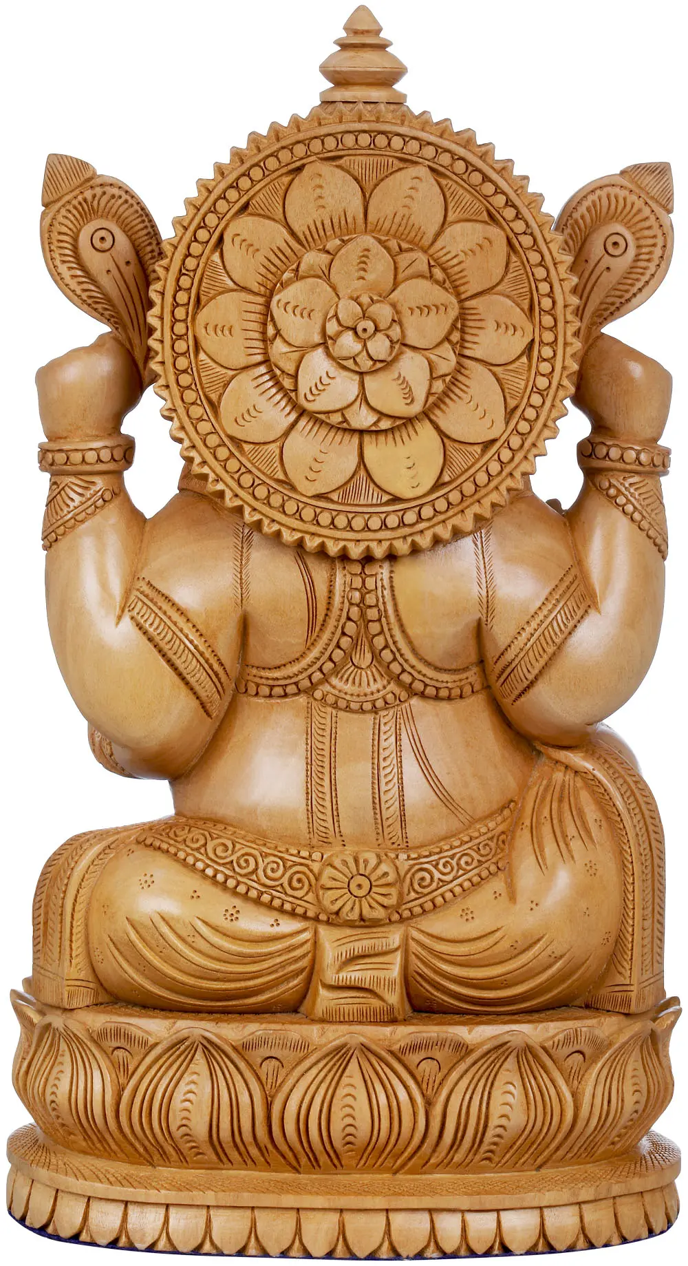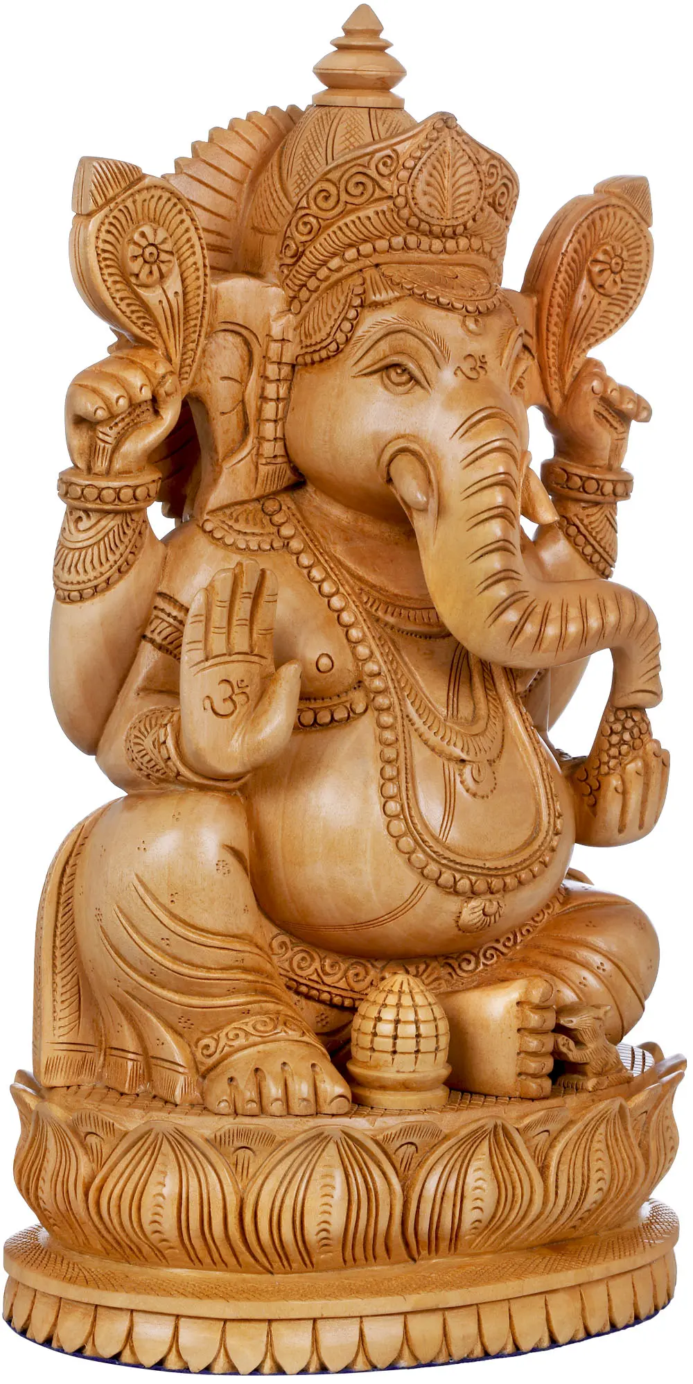 A wooden statue is always better than any other kind as it provides that warmth and fibrous strength to the sculpture which help to make it strong, along with precise, thin and beautiful carvings on its surface. The one shown here is hand carved in accurate gestures and beauty in the best quality wood. Lord Ganesha is revered as the king of gods with a nature of helping his devotees selflessly from all obstacles. He sits here on a double layered stylized lotus plinth in his run-of-the-mill posture.