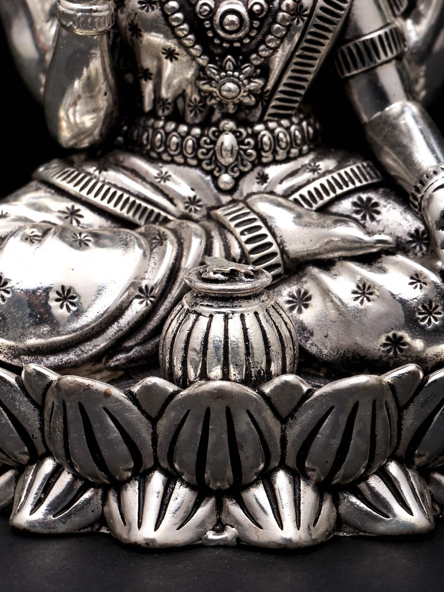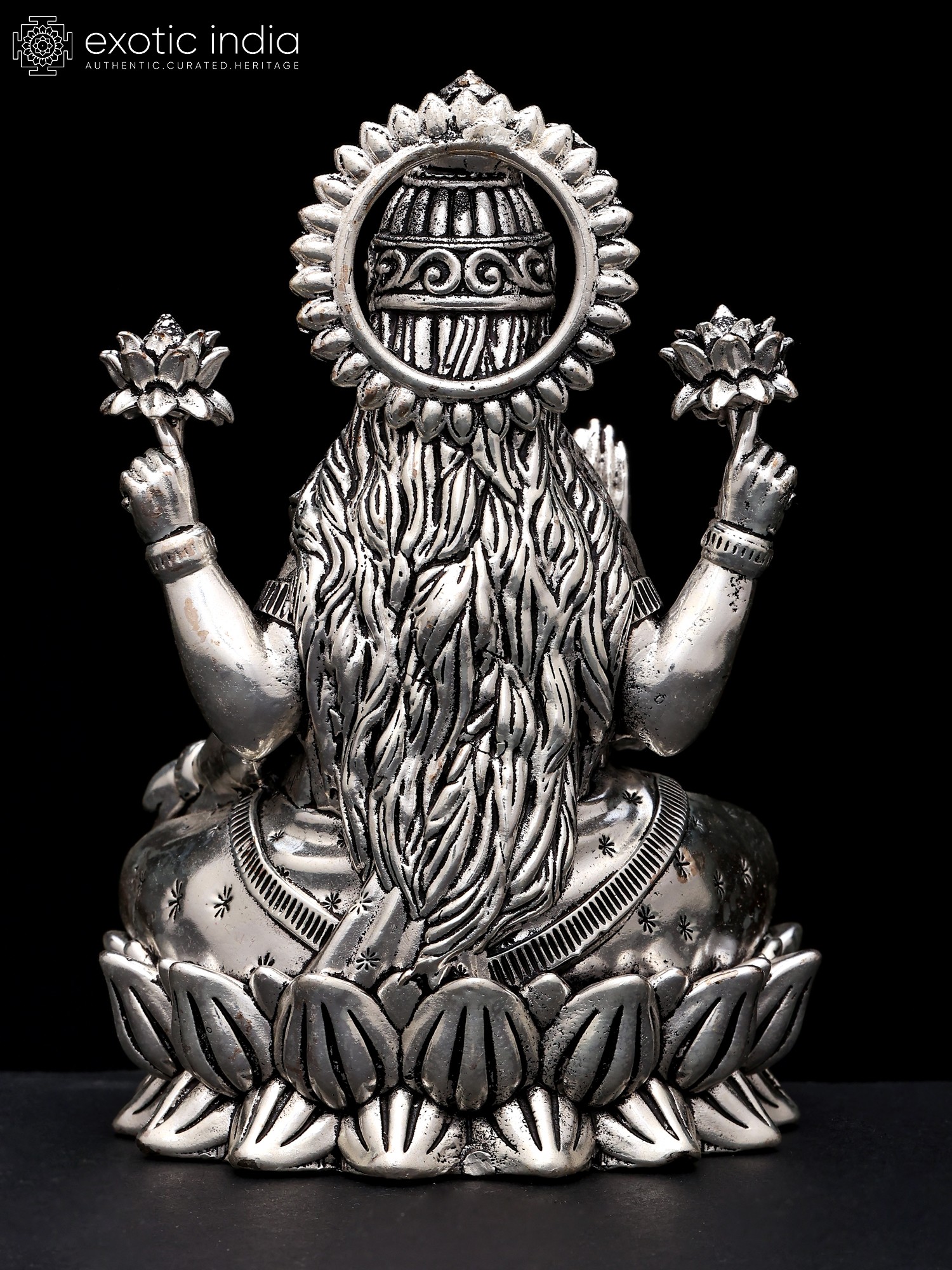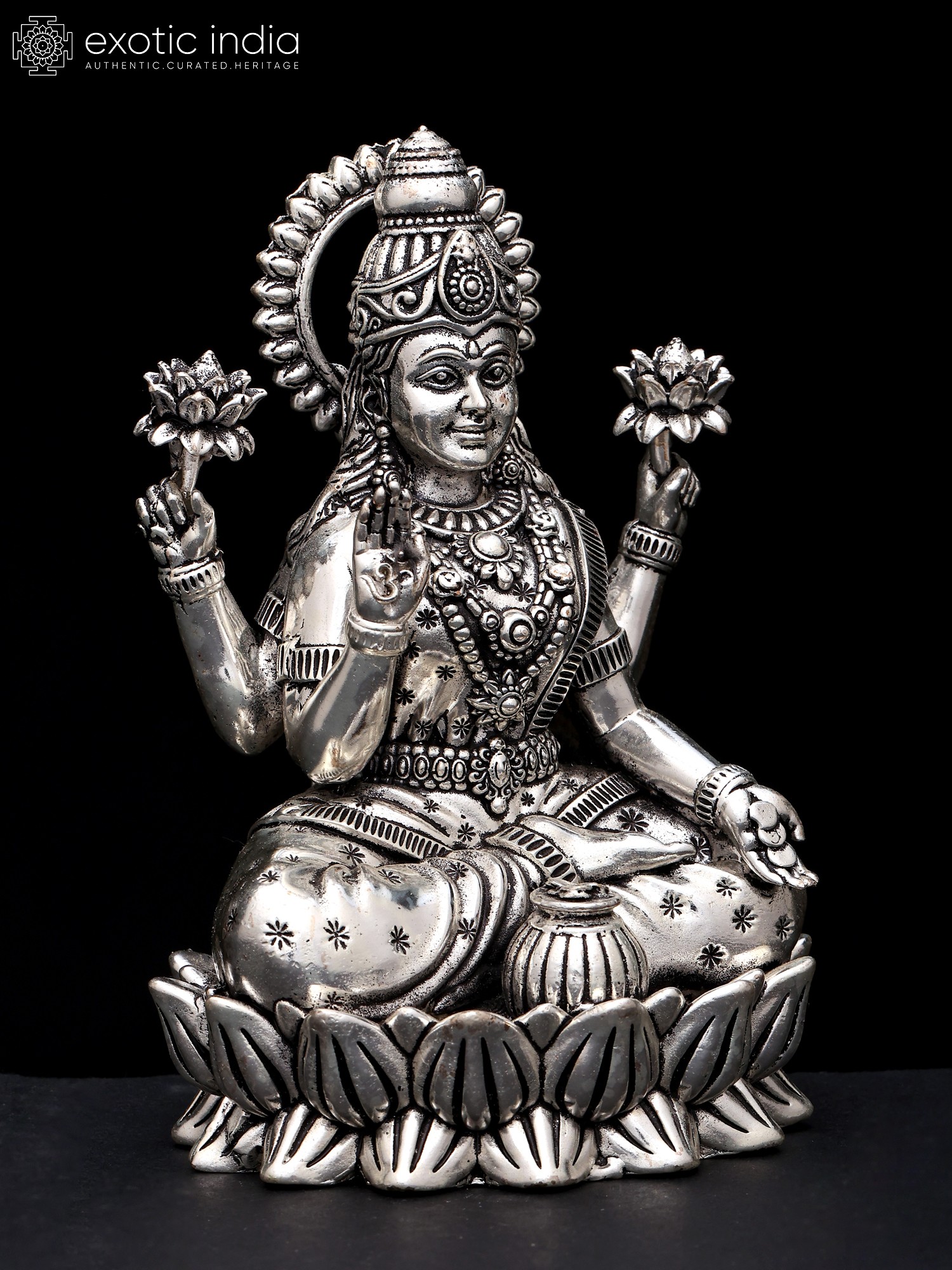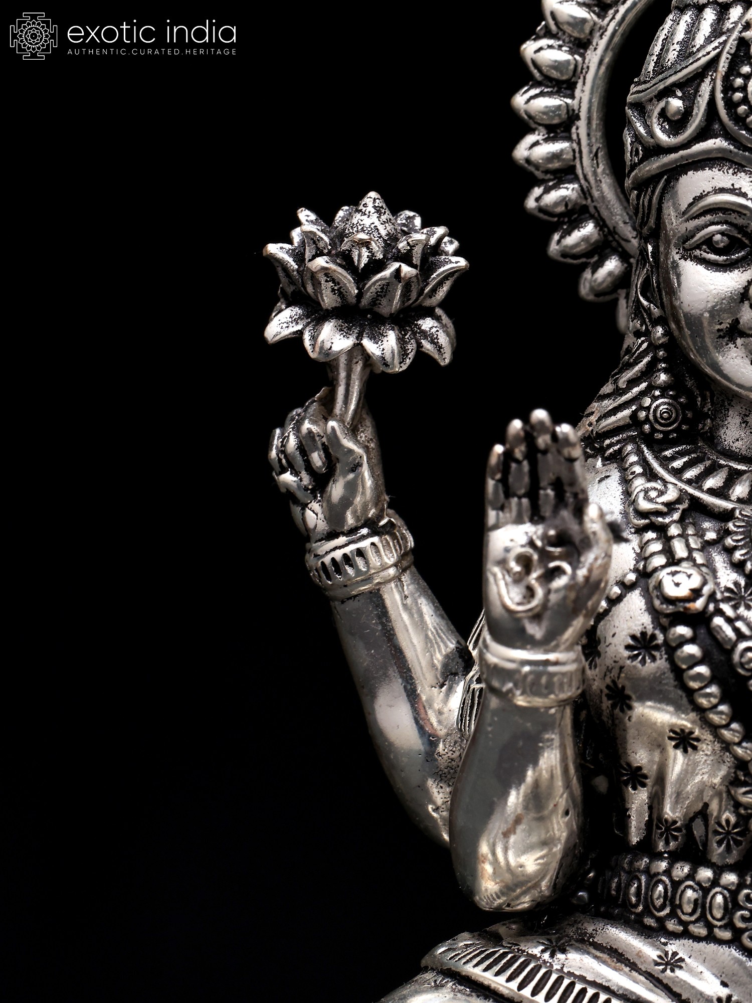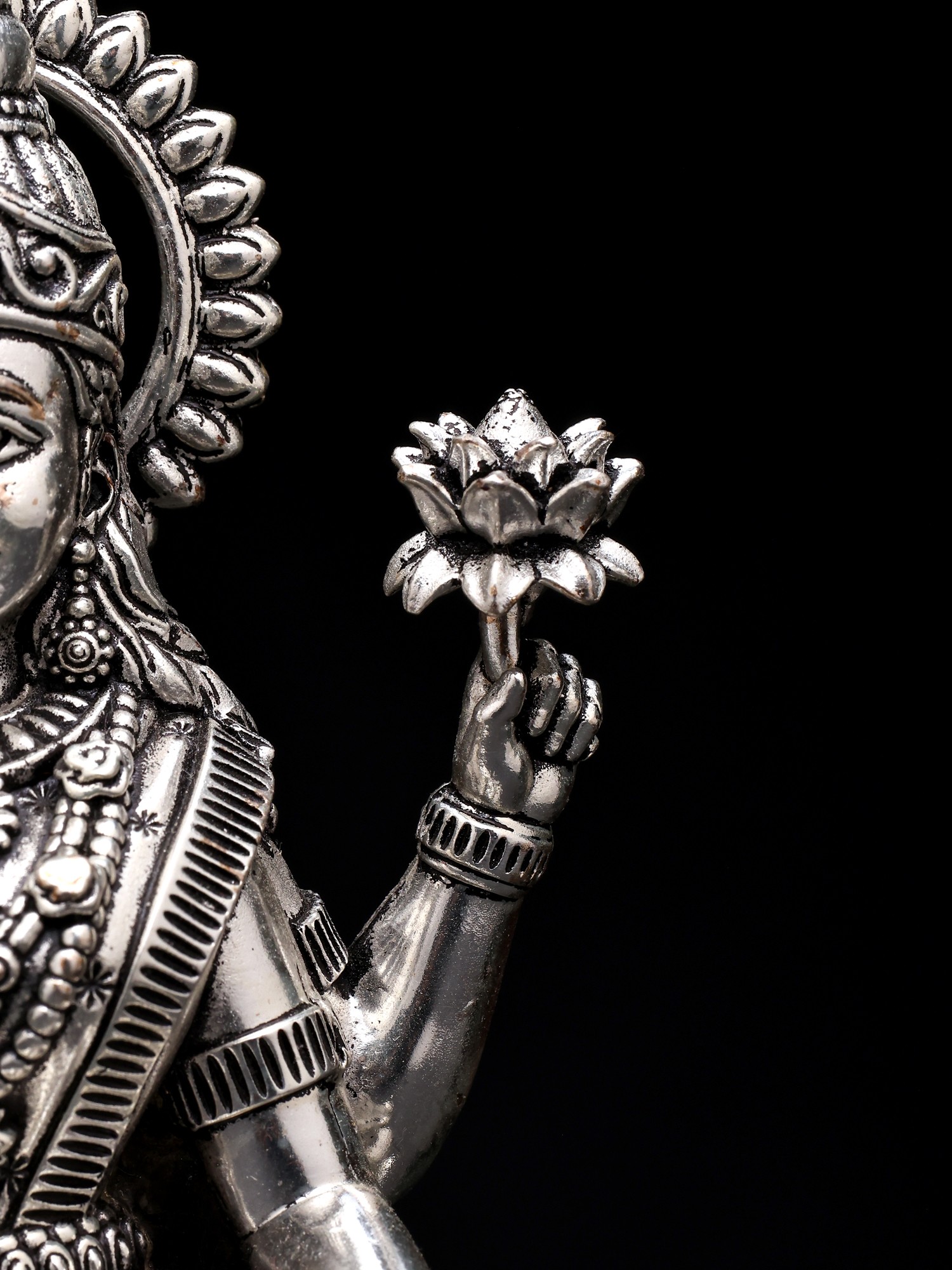 In this exquisite brass icon with a silver coating, the radiant goddess appears in Chaturbhuja roopa, enthroned on a beautifully detailed lotus, that symbolizes the creation of the universe.