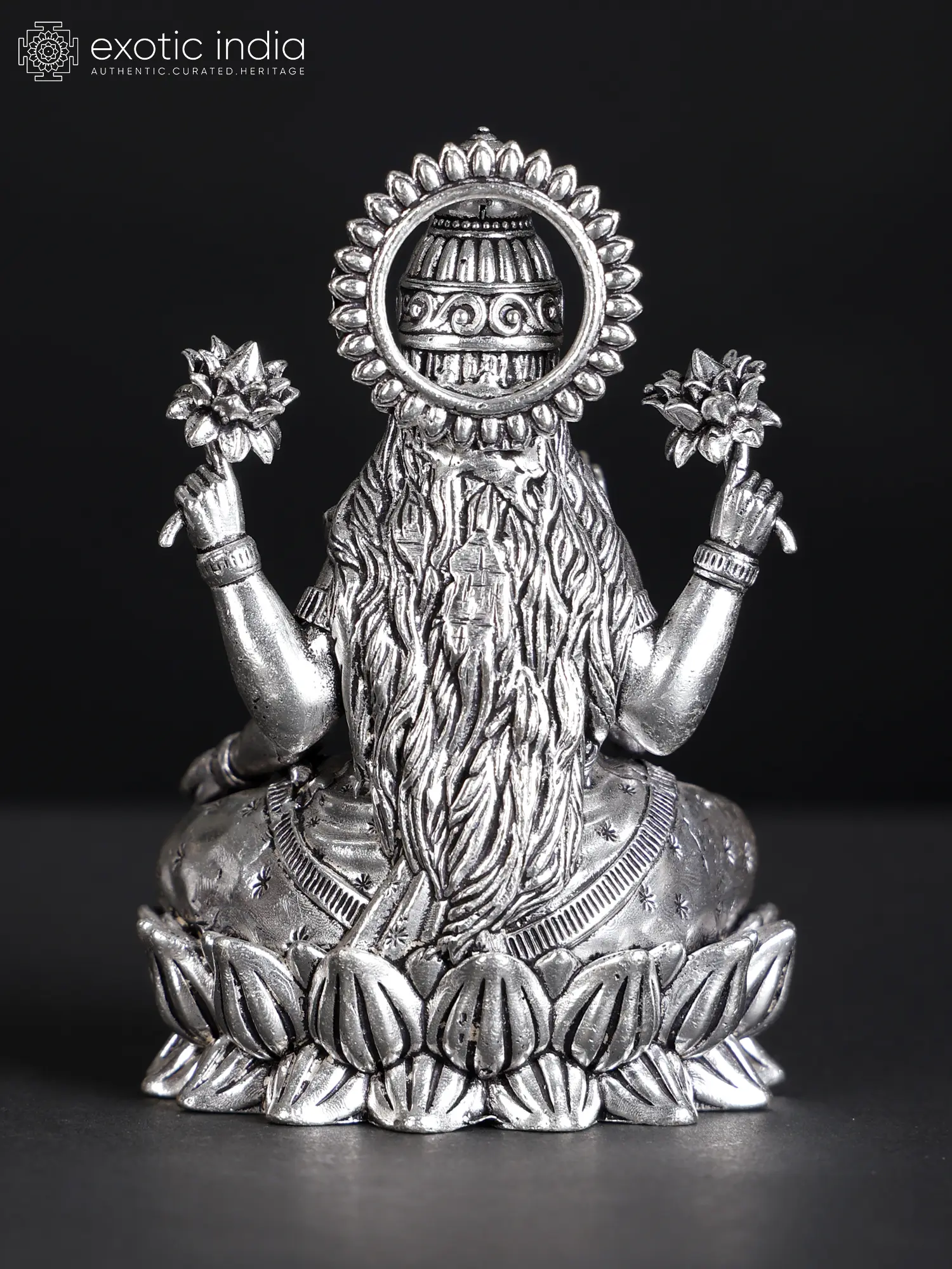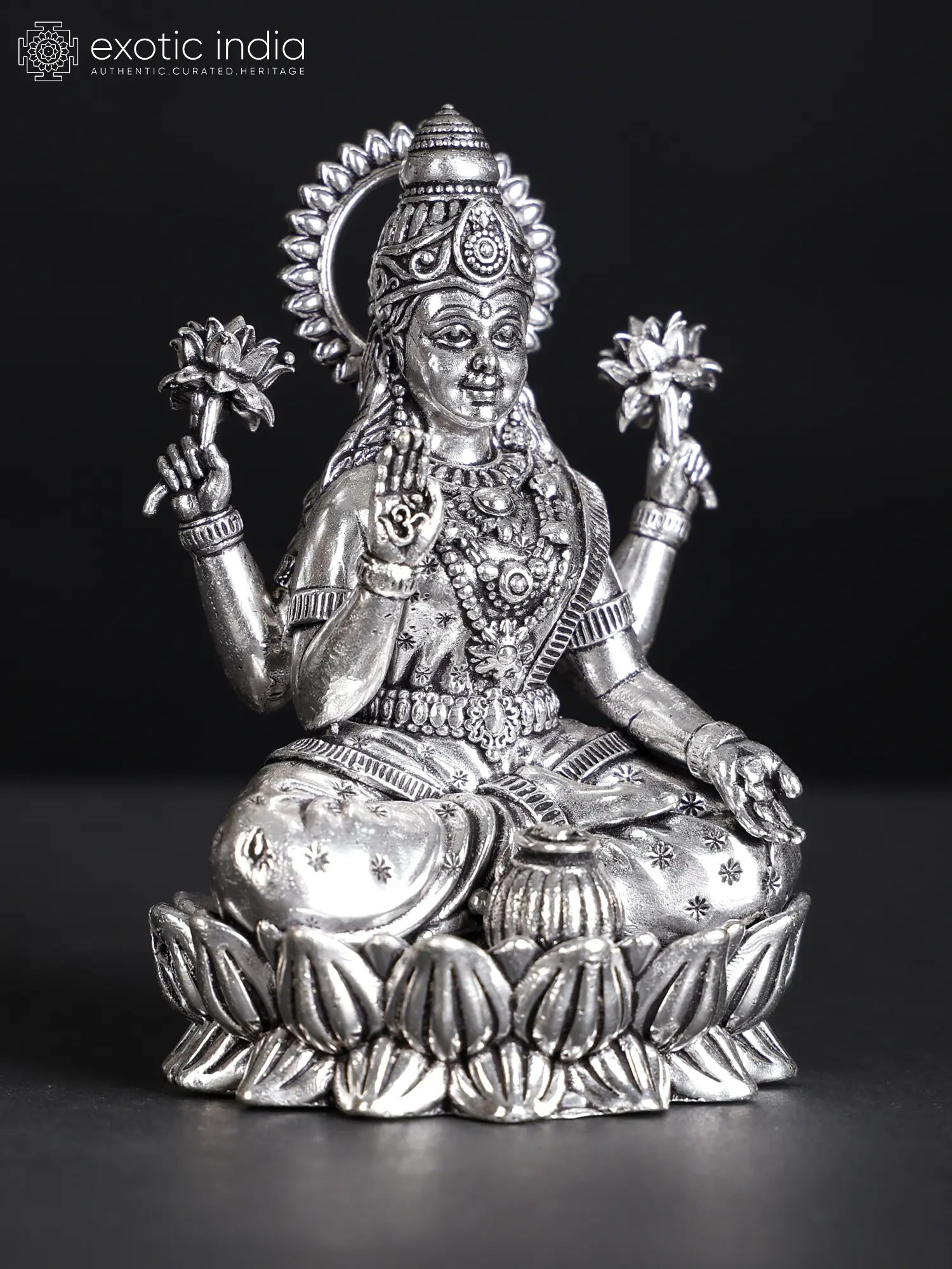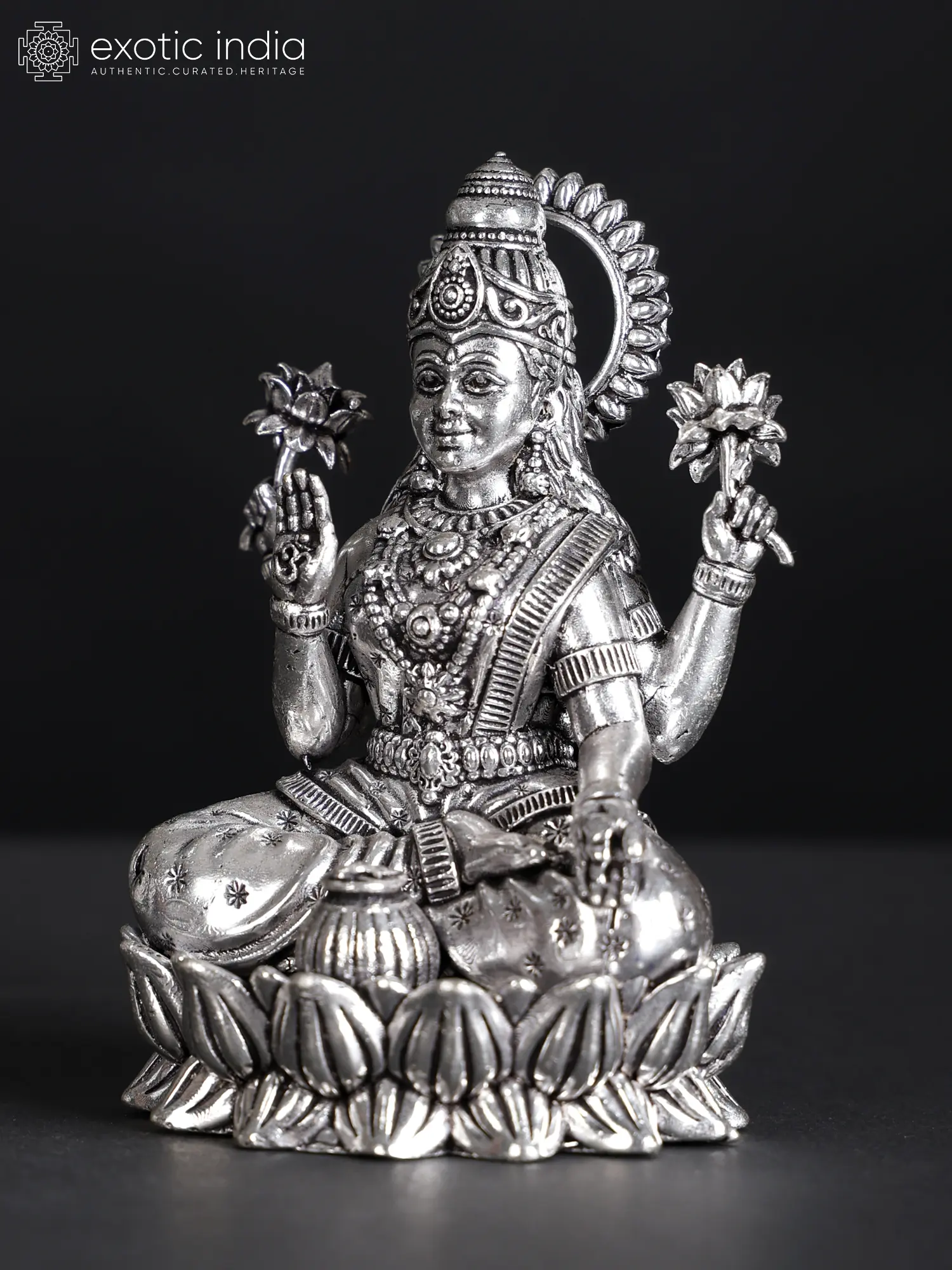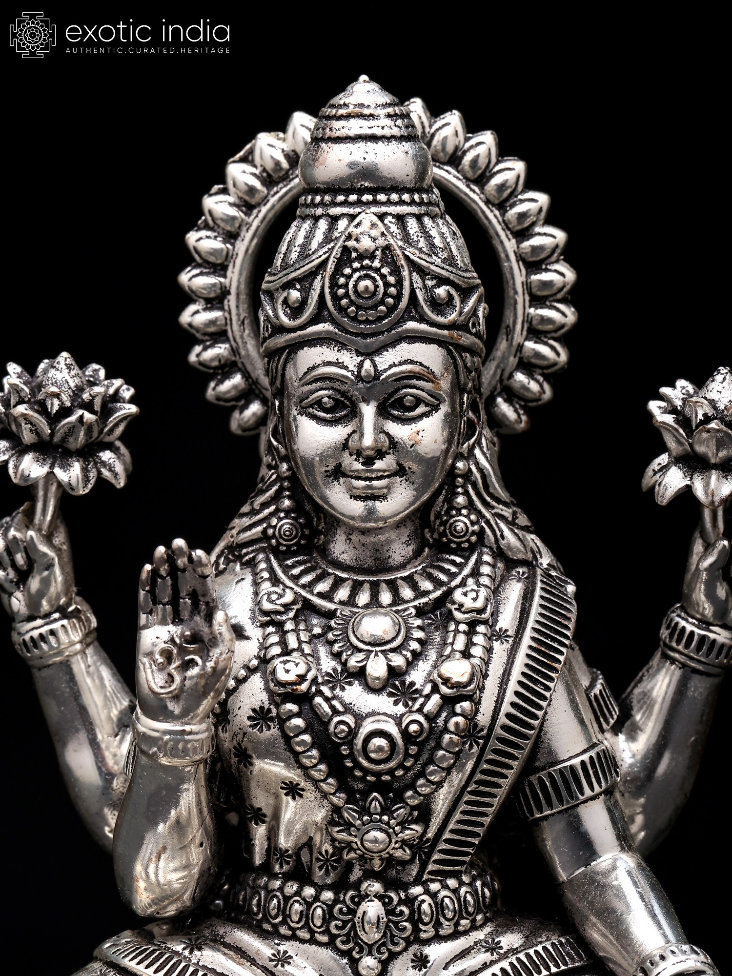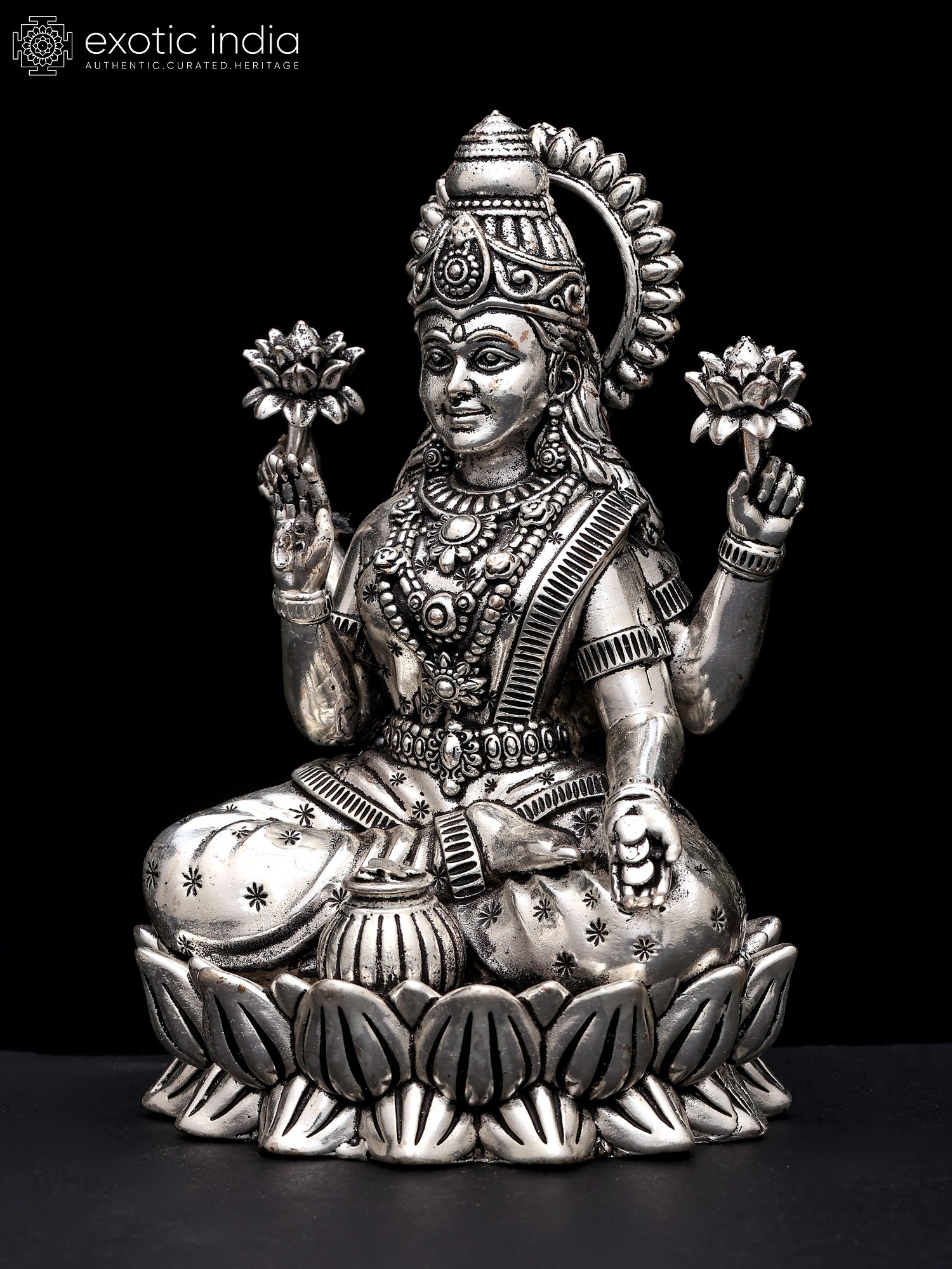 In this exquisite brass icon with a silver coating, the radiant goddess appears in Chaturbhuja roopa, enthroned on a beautifully detailed lotus, that symbolizes the creation of the universe.